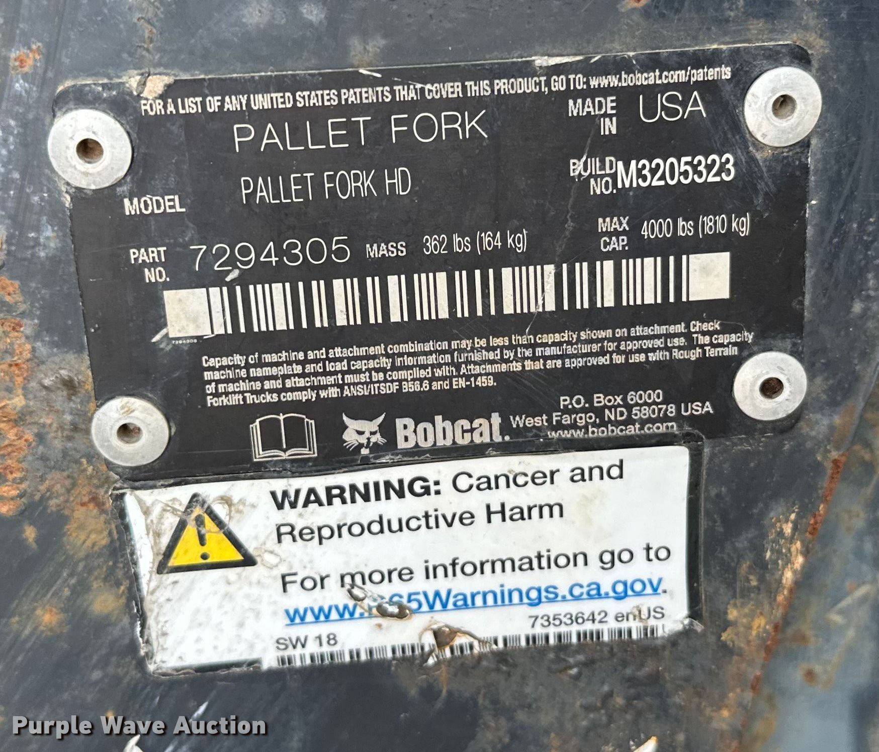 Purple Wave is selling a used Skid Steer Attach. in Minnesota. This item is a Bobcat skid steer forks with the following: Serial: 7294305, Length: 48", Capacity: 4,000 lbs