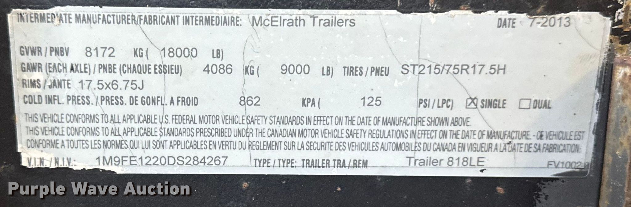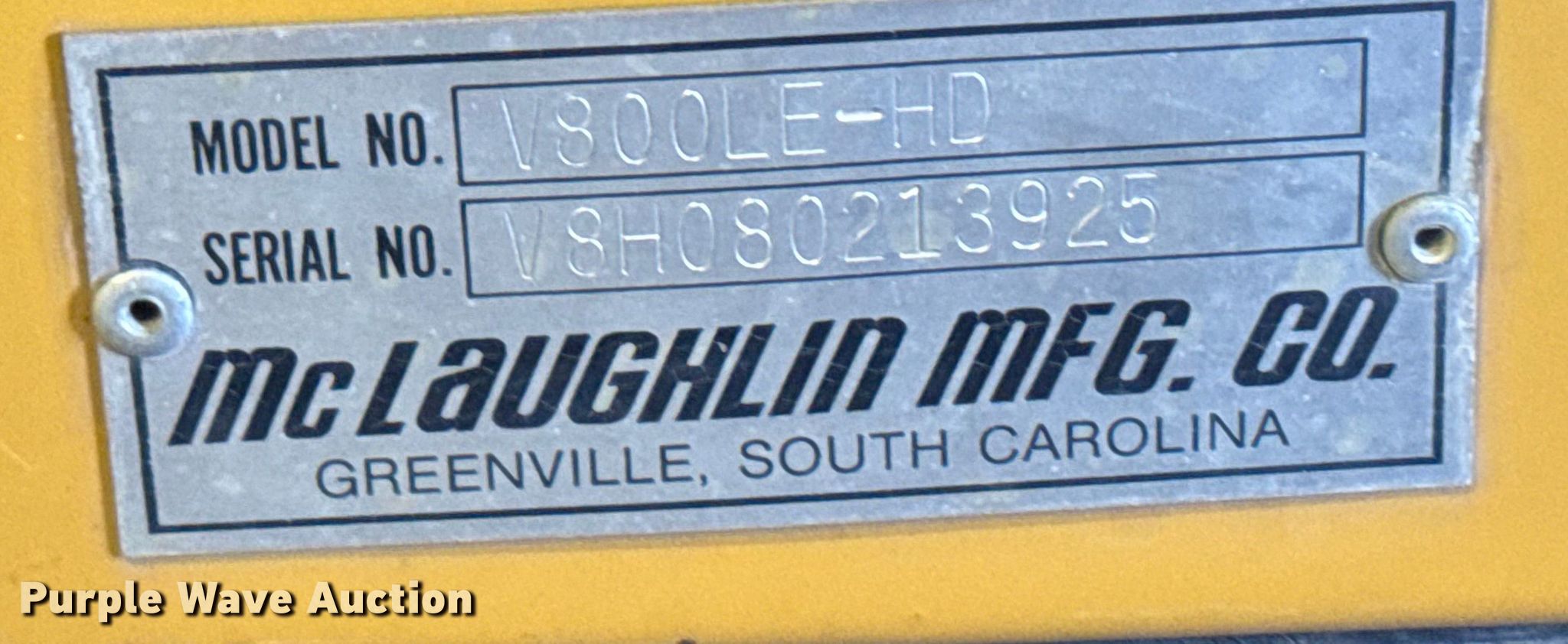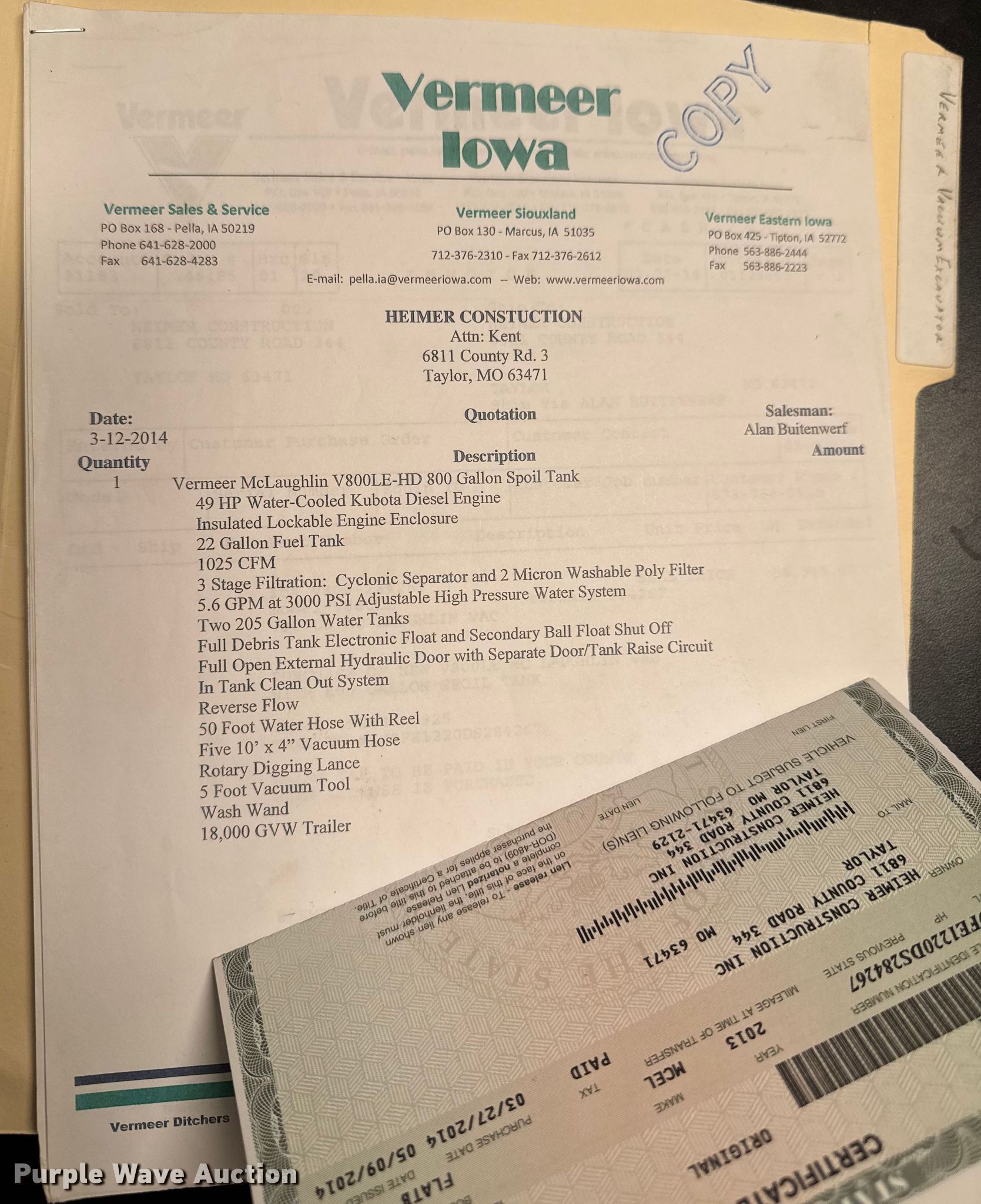 2013 Vermeer V800LE-HD vacuum trailer. Hours: 1,166 on meter, VIN: 1M9FE1220DS284267, Serial: V8H080213925. Engine Kubota V2203, Cylinders: 4, Fuel type: Diesel. Features Spoils tank Capacity: 800 gallons, Water tank Capacity: 205 gallons, Water pump GP, PSI: 3,000, Vacuum pump CFM: 1,025, Reverse flow, Suction hose. Trailer 2013 McElrath trailers 818LE, 19' L x 102" W, Hitch: Pintle, Suspension: Spring, Brakes: Electric, Axles: Tandem, Tire size: 215/75R17.5, GVWR: 18,000 lbs, GAWR: 9,000 lbs. Missouri title. Title distribution may be delayed up to 14 days from verification of funds. Taylor, MO 63471