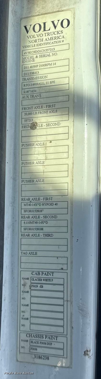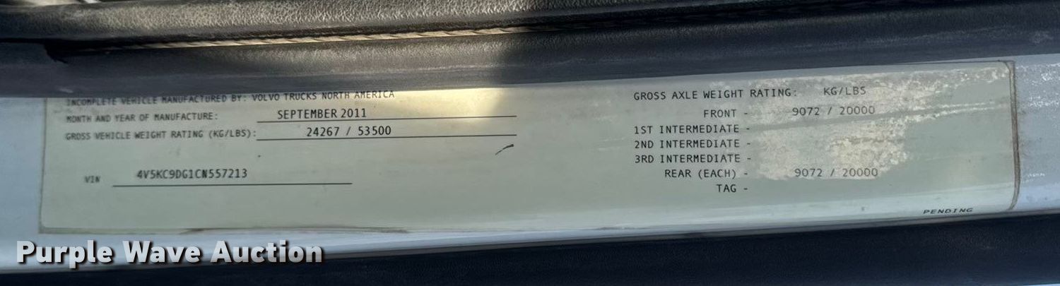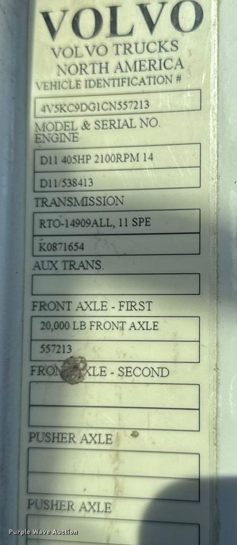 2012 Volvo Truck VHD ready mix truck. Miles: 139,227 on odometer, Hours: 2,935 on meter, VIN: 4V5KC9DG1CN557213. Engine Volvo D11H405, Displacement: 10.8L, Cylinders: 6, Fuel type: Diesel. Transmission RTO-14909ALL, Manual, Speed: 11. Chassis Axles: Triple, Tag axle Steerable, Differential lock: Full, Suspension: Spring over walking beam, Brakes: Air, PTO, GVWR: 73,020 lbs FAWR: 20,000 lbs, IAWR: 20,000 lbs, RAWR: 20,000 lbs, Lift axle GAWR: 13,020 lbs. Interior AC, Heat. Features Mixer Kimbal mixer company, Discharge: Rear, In-cab controls, Rear drum controls, Chute Extensions: 3.. Tires Front: 425/65R22.5, Rear: 11R22.5, Lift axle: 11R22.5. Missouri title. Title distribution may be delayed up to 30 days from verification of funds. Bleigh Ready Mix. Hannibal, MO 63401
