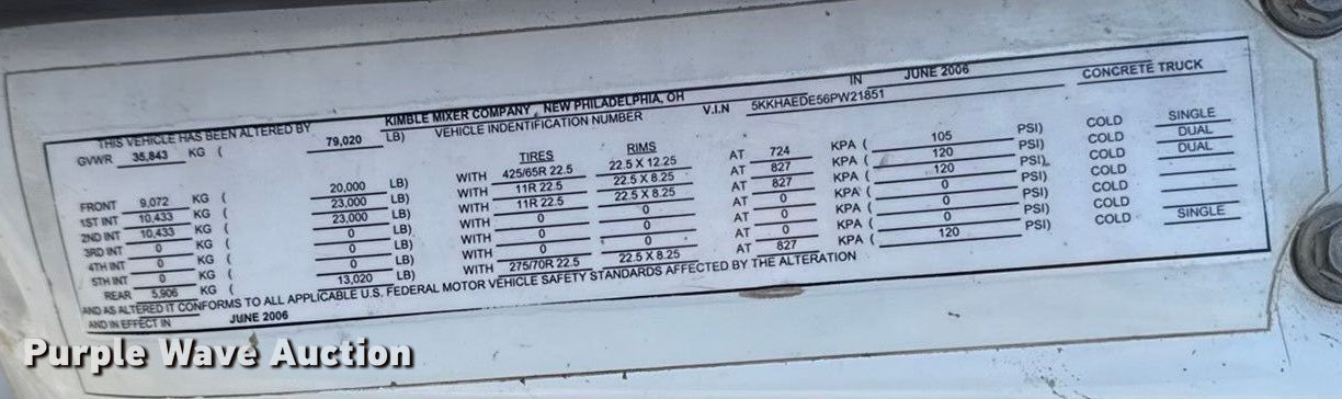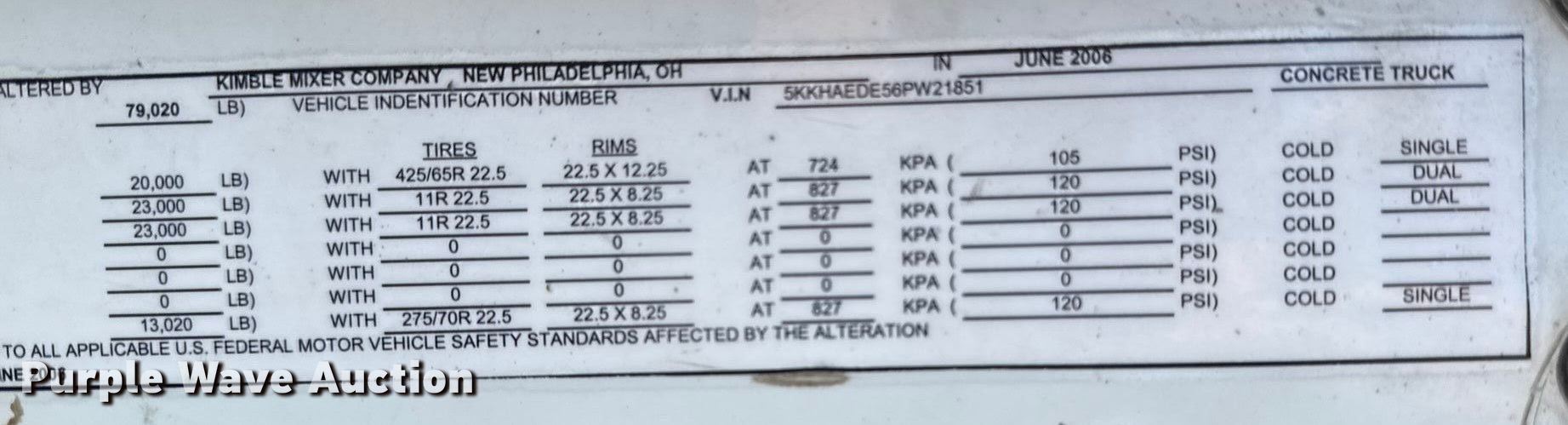 2006 Western Star 4900 ready mix truck. Miles: 224,141 on odometer, Hours: 16,953 on meter, VIN: 5KKHAEDE56PW21851. Engine Caterpillar C13, Displacement: 12.5L, Cylinders: 6, Fuel type: Diesel. Transmission Eaton Fuller 8LL, Manual, Speed: 10. Chassis Axles: Triple, Steerable, Tag axle, Differential lock: Full, Suspension: Spring over walking beam, Brakes: Air, PTO, GVWR: 79,020 lbs FAWR: 20,000 lbs, IAWR: 23,000 lbs, RAWR: 23,000 lbs, Lift axle GAWR: 13,020 lbs. Interior AC, Heat, Heated mirrors, Cruise control, Passenger power window. Features Mixer Kimber mixer company, Discharge: Rear, In-cab controls, Rear drum controls, Water tank capacity: 120 gallons, Chute Extensions: 3.. Tires Size: 425/65R22.5, Rear: 11R22.5, Lift axle: 275/70R22.5. Notes Dash warning indicator: ABS. Missouri title. Title distribution may be delayed up to 30 days from verification of funds. Bleigh Ready Mix. Hannibal, MO 63401