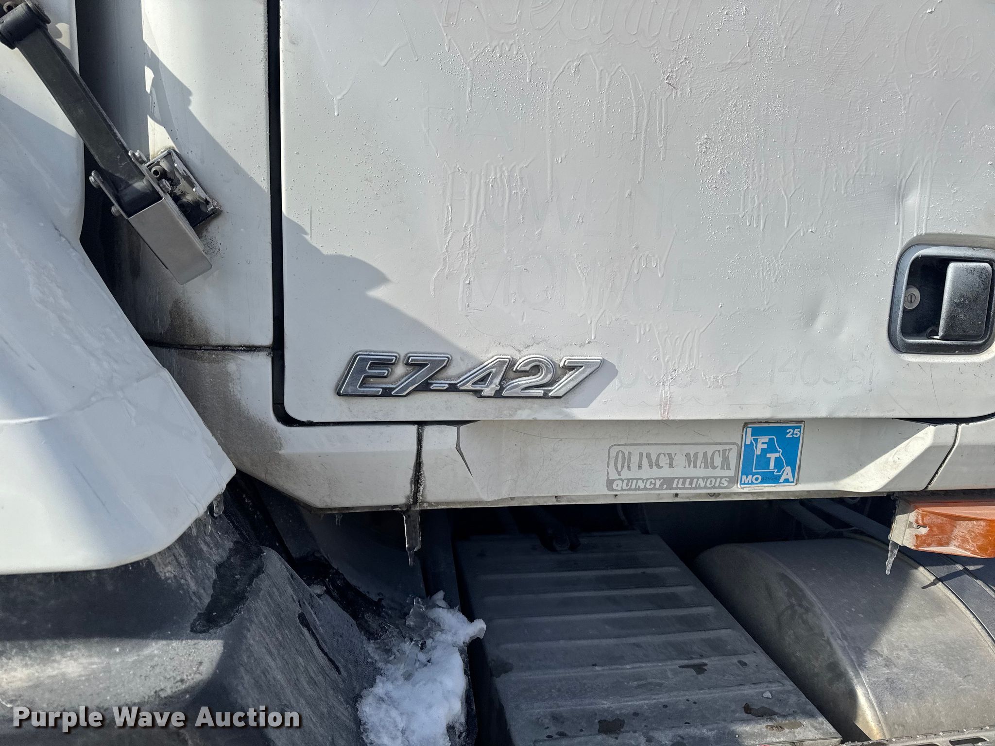 2000 Mack CH613 semi truck. Miles: 1,334,960 on odometer, Hours: 24,408 on meter, VIN: 1M1AA18Y9YW127047. Engine Mack E7-427, Displacement: 12.0L, Cylinders: 6, Fuel type: Diesel, Engine brake. Transmission Eaton Fuller, Manual, Speed: 9. Chassis Differential lock: Inter-axle, Suspension: Air Dump valves, Brakes: Air, PTO, Wet kit, Truck chassis: 198", GVWR: 52,000 lbs FAWR: 12,000 lbs, IAWR: 20,000 lbs, RAWR: 20,000 lbs. Interior AC, Heat, Heated mirrors, Cruise control. Features Deck plate: Aluminum, Fifth wheel type: Sliding, Fuel tank: Dual. Tires Size: 11R22.5. Missouri title. Title distribution may be delayed up to 30 days from verification of funds. Bleigh Ready Mix. Hannibal, MO 63401