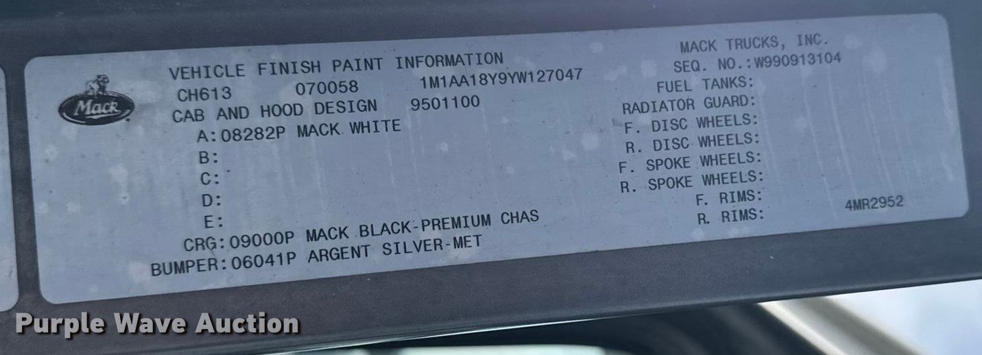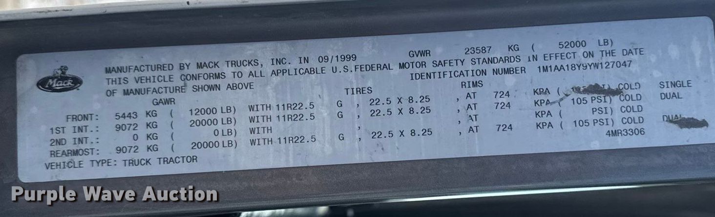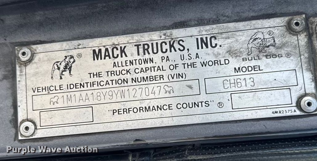 Purple Wave is selling a used Truck Tractor in Missouri. This item is a 2000 Mack CH613 semi truck with the following: Miles: 1,334,960 on odometer, Hours: 24,408 on meter, VIN: 1M1AA18Y9YW127047