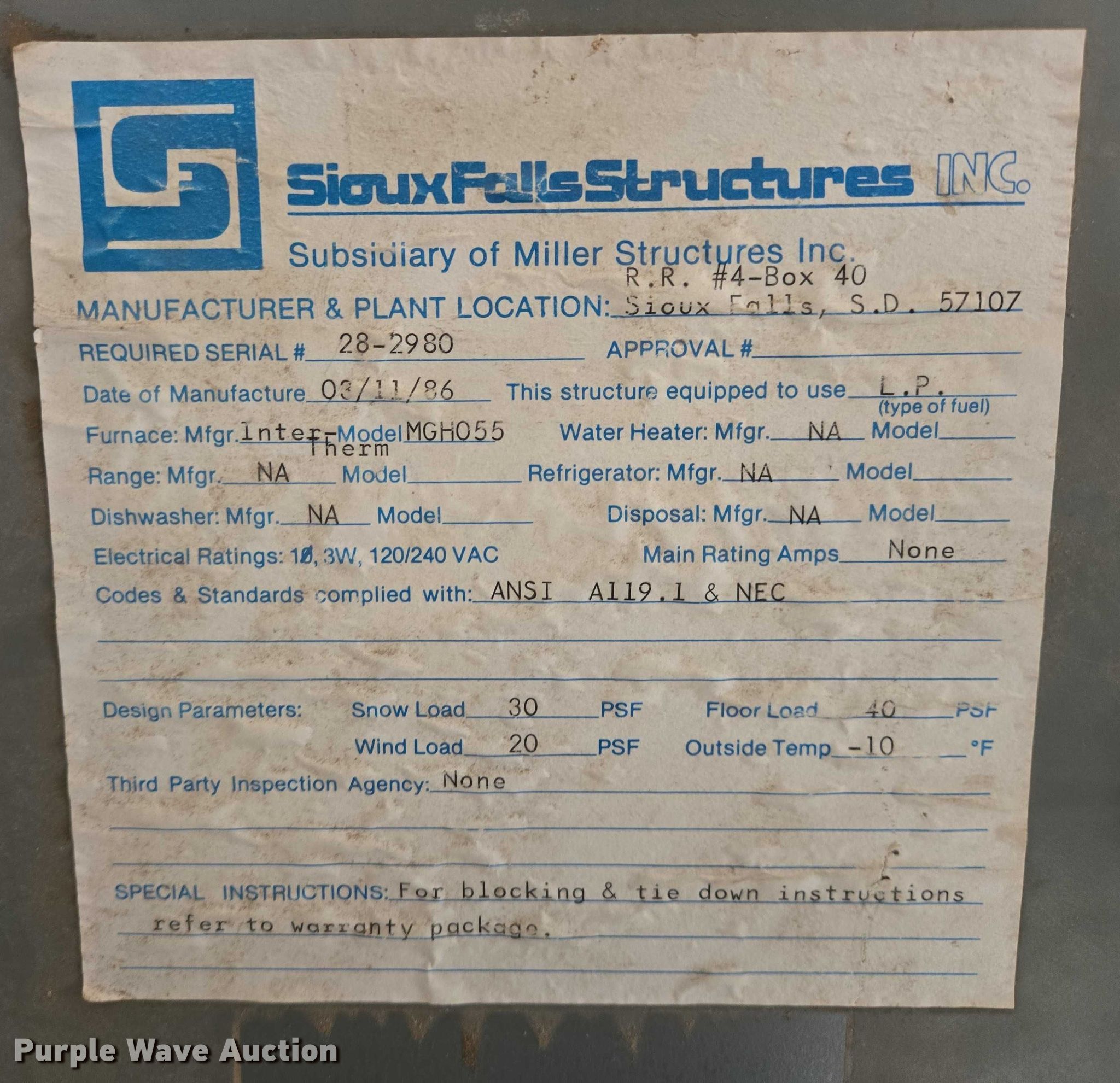 Purple Wave is selling a used Manufactured Home or Office in South Dakota. This item is a 1986 Sioux Falls Structures mobile office trailer with the following: VIN: 282980