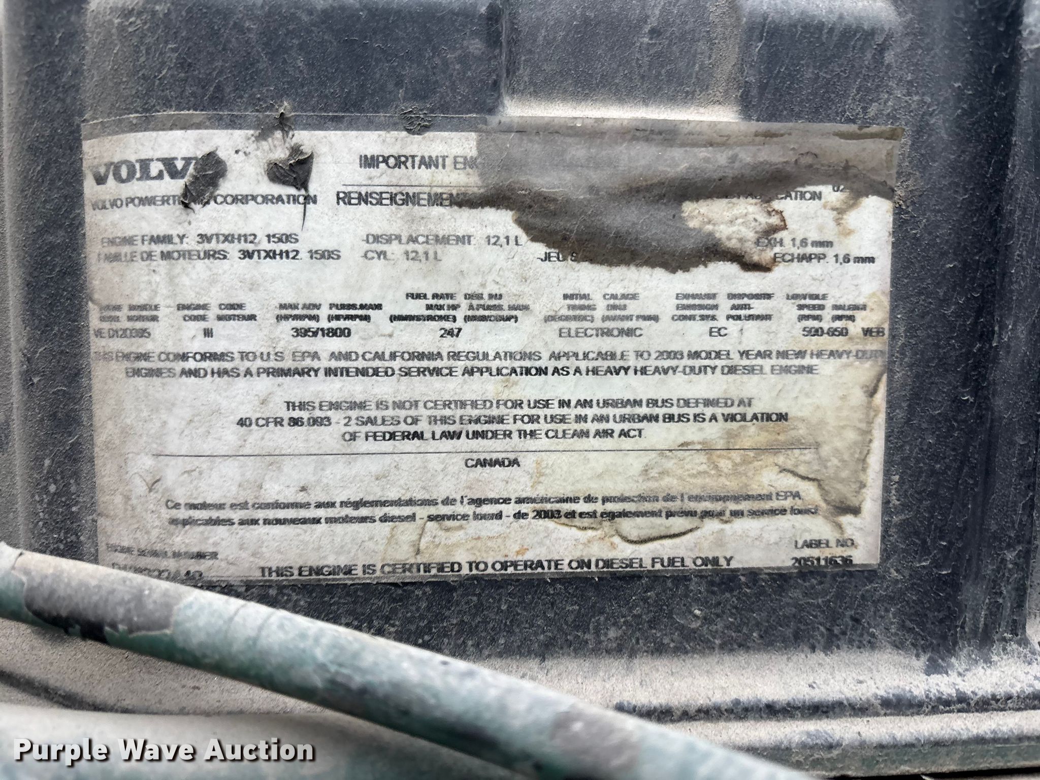 2003 Volvo Truck VHD sewer jetter truck. Miles: 110,353 on odometer, VIN: 4V5KC9GG93N350533. Engine Volvo VE D12, Displacement: 12.1L, Cylinders: 6, Fuel type: Diesel, HP: 395. Transmission Allison, Automatic. Chassis Axles: Triple, Pusher axle, Differential lock: Full, Suspension: Spring, Brakes: Air. Interior Heat, Auxiliary controls. Features Bed Tank bed, Length: 12' 6", Width: 96", Engine Perkins, Cylinders: 6, Water pump Praussoli MKSRS65, PSI: 150, Hose reel Front, Diameter: 1.25", Telescopic boom Diameter: 8".. Tires Front: 425/65R22.5, Rear: 11R22.5. Notes Windshield chipped or cracked. Missouri title. Title distribution may be delayed up to 14 days from verification of funds. Ace Pipe Cleaning, Inc.. Kansas City, MO 64120