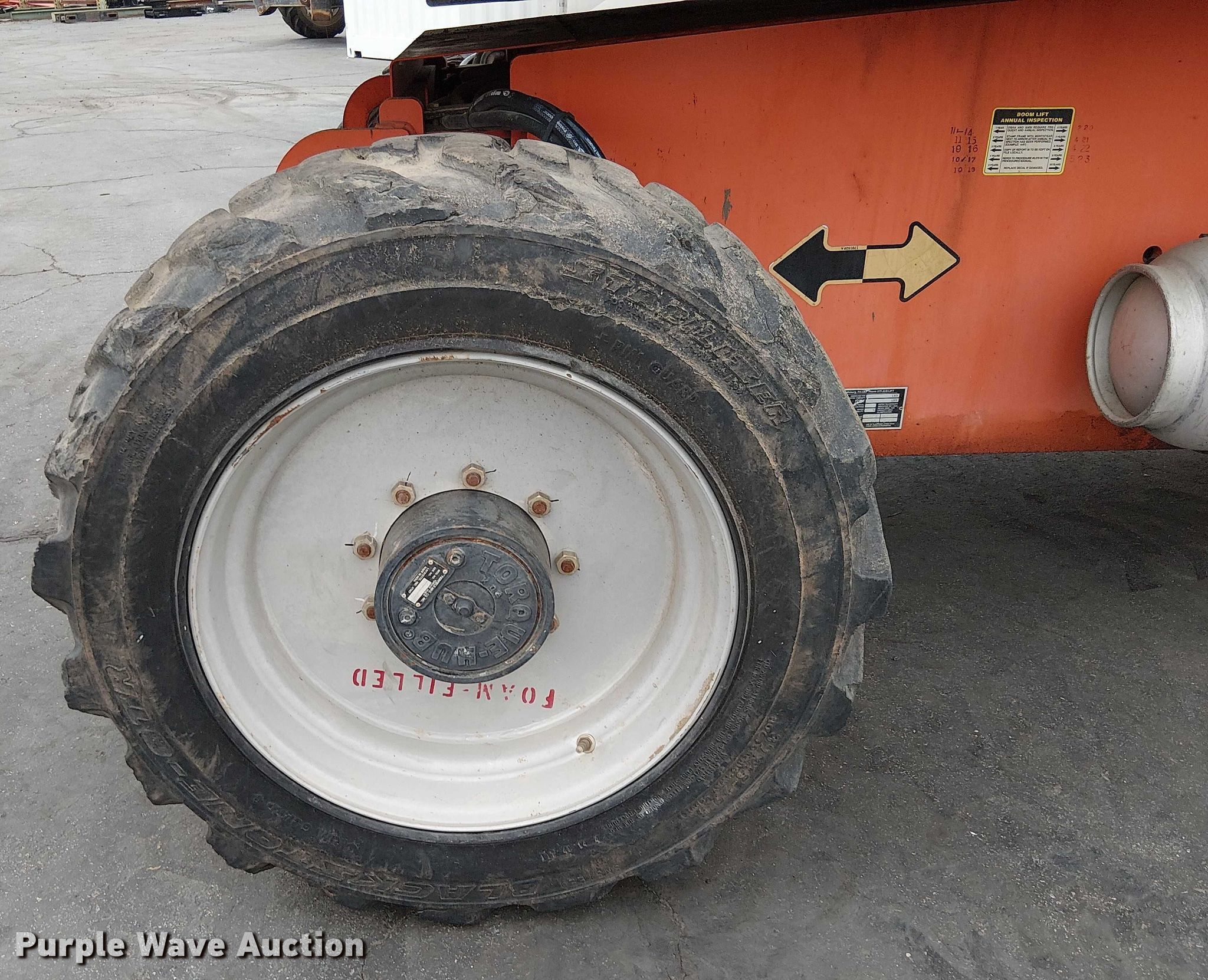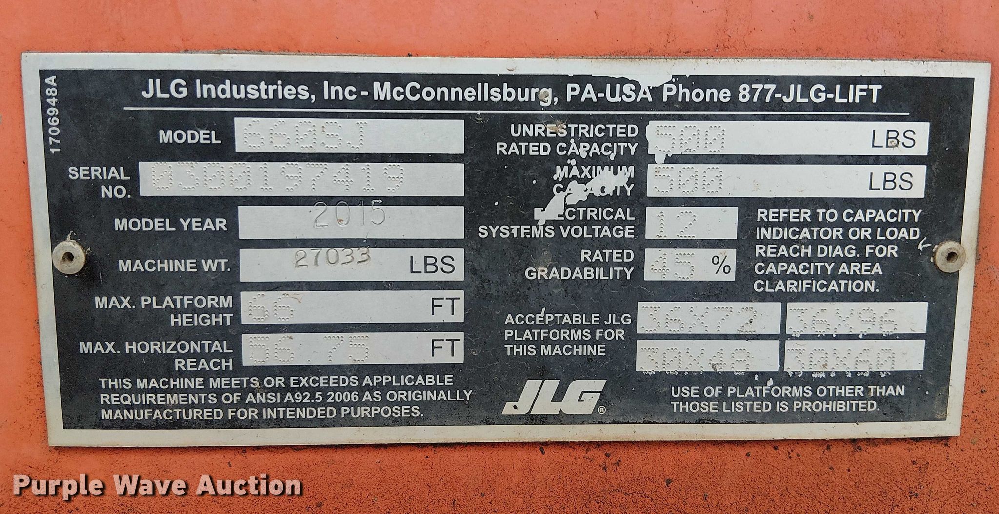 2015 JLG 660SJ boom lift. Hours: 4,578 on meter, Serial: 0300197419. Engine PSI, Fuel type: LPG LP bottle: Included. Features Boom type: Telescopic, Maximum lift capacity: 500 lbs, Maximum reach length: 56.75', Maximum lift height: 66', Hydraulic extendable jib, Platform: 96" L x 36" W, AC power outlet, Air outlet, Controls: Platform, Ground, Platform rotation: Hydraulic, Safety alarm. Tires Tire size: 39x15-22.5. Notes Jump start required during on-site data collection. SPC Equipment Brokers. Riverside, CA 92501