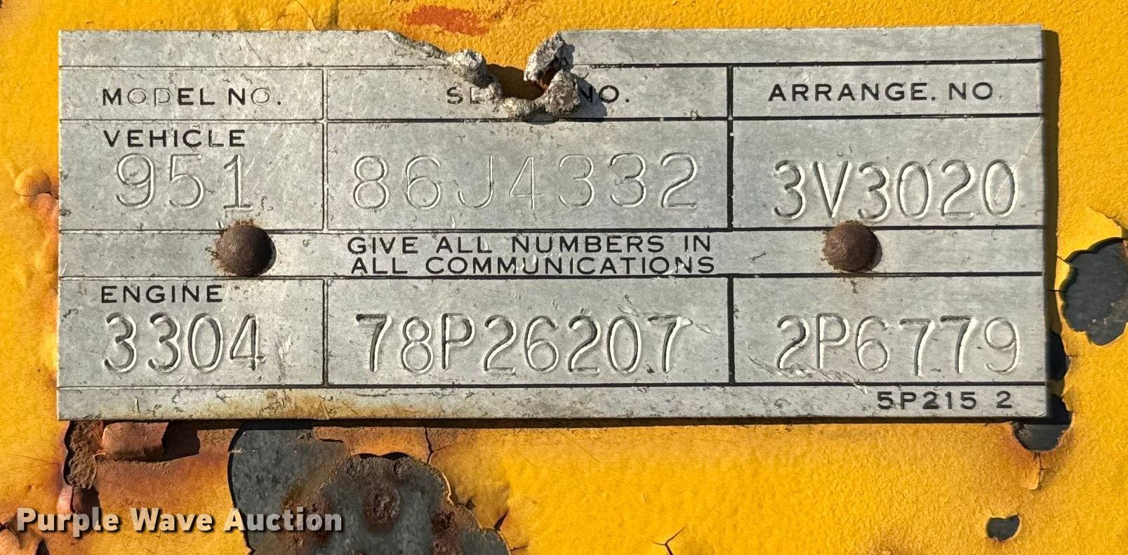 Caterpillar 951C track loader. Hours: 8,254 on meter, Serial: 86J4332. Engine Caterpillar 3304, Cylinders: 4, Fuel type: Diesel. Transmission Powershift, 3F - 3R. Operators station Bucket controls: Two-lever. Features Bucket Width: 80", Teeth: 8. Tracks Width: 15", Grouser pads: Double. Notes Non-operational unit. Buyer responsible for all aspects of removal. Langton Group. Woodstock, IL 60098