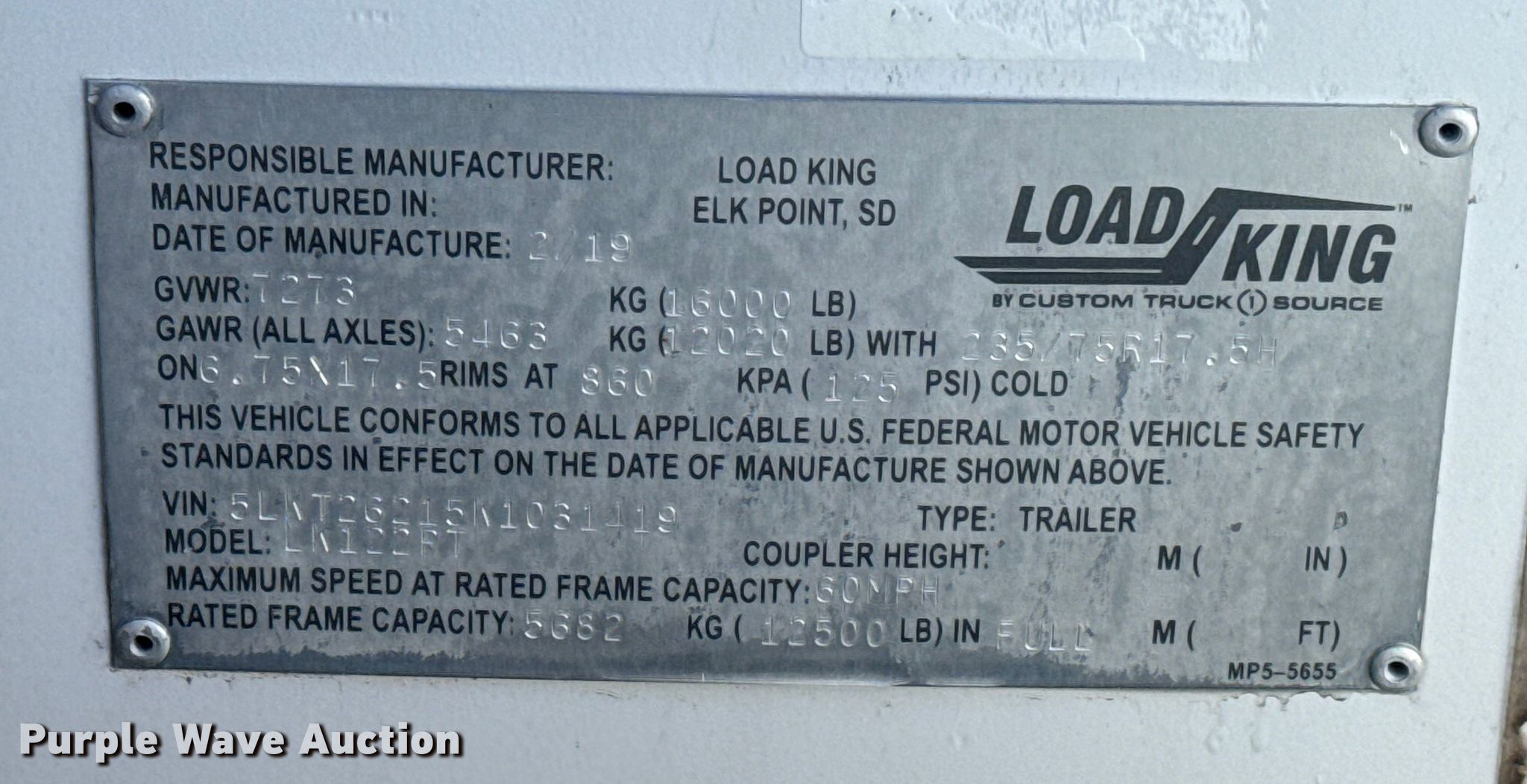 Purple Wave is selling a used Car or Utility Trailer in Oklahoma. This item is a 2019 Load King LK122PT utility trailer with the following: VIN: 5LKT26215K103419