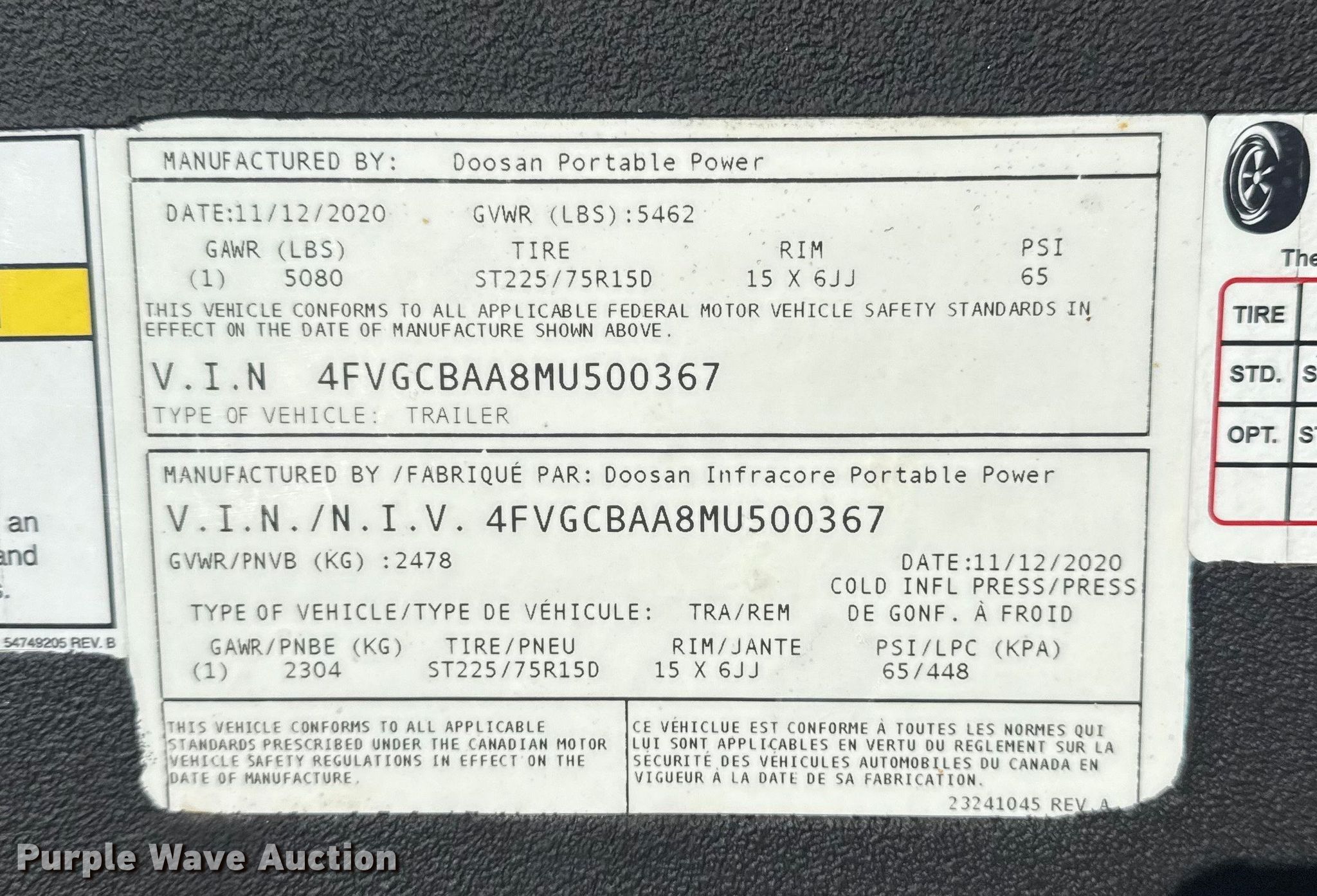 Purple Wave is selling a used Generator Set in Oklahoma. This item is a 2021 Doosan Portable Power G25WDO-T4F generator with the following: Hours: 299 on meter, VIN: 4FVGCBAA8MU500367, Serial: 500367UKAEH45