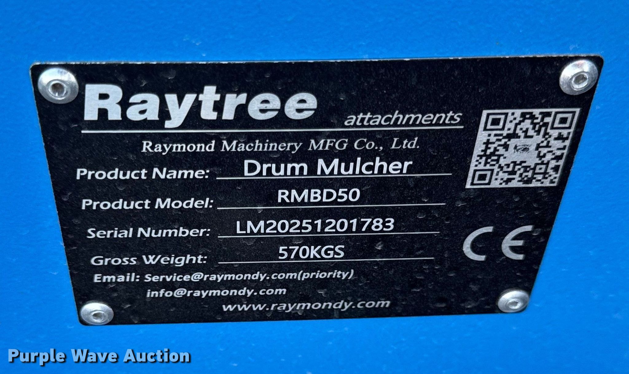 Purple Wave is selling a used Skid Steer Attach. in Kansas. This item is a 2025 Raytree RMBD50 skid steer mulcher with the following: Serial: LM20251201783, Width: 50"