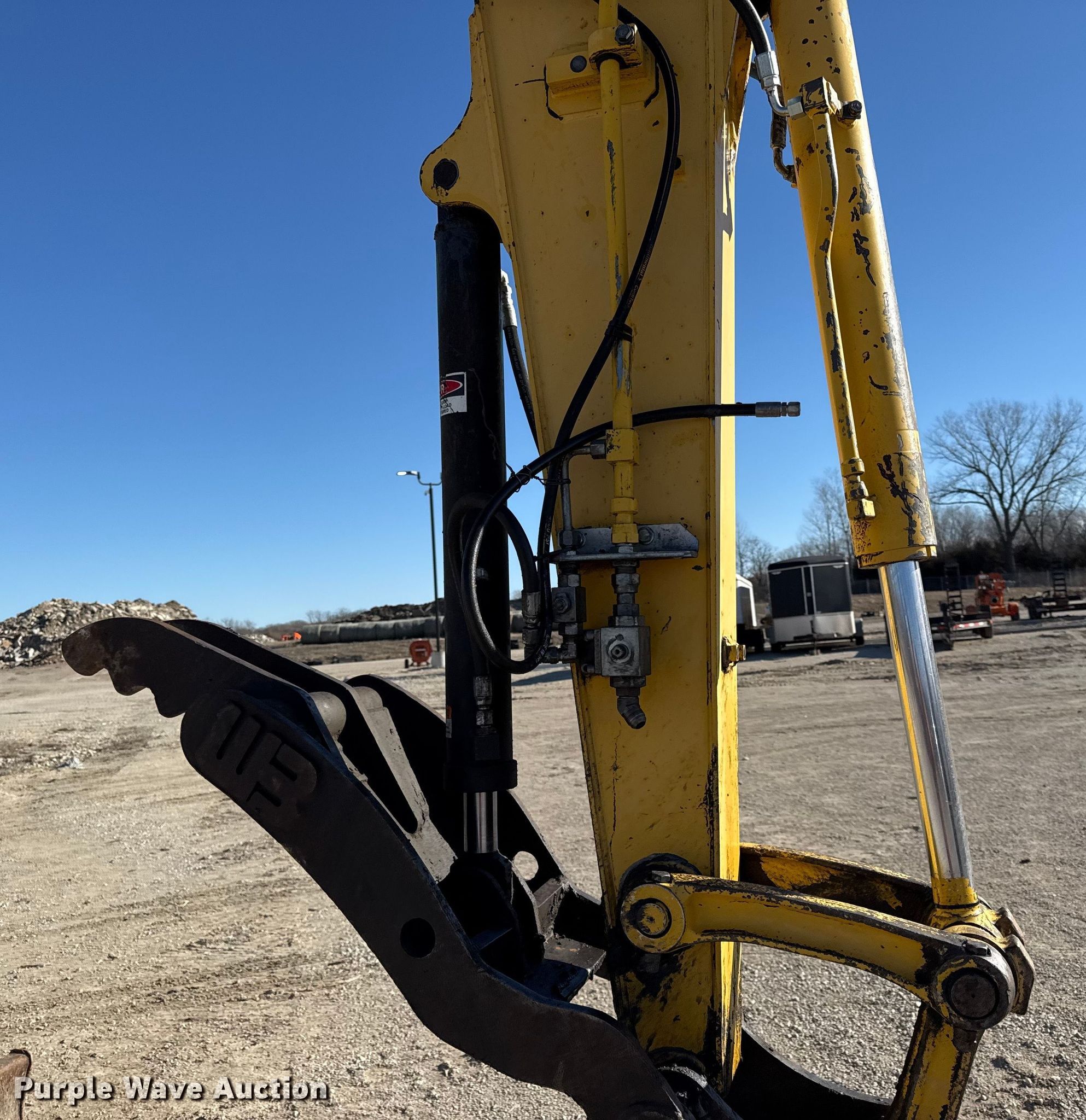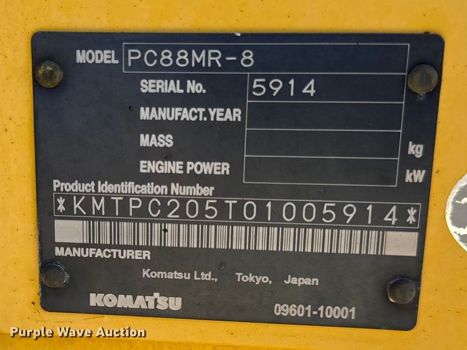2012 Komatsu PC88MR-8 mini excavator. Hours: 6,855 on meter, Serial: KMTPC205T01005914. Engine Komatsu SAA4D95LE-5, Displacement: 3.26L, Cylinders: 4, Fuel type: Diesel. Transmission Hydrostatic, Two speed travel. Operators station Enclosed cab, AC, Heat. Features Auxiliary hydraulics Standard, Two-way, Backfill blade Width: 92", Boom Swing, Stick Stick length: 7' 2", Quick coupler: Hydraulic JRB WB, Thumb: Hydraulic, Bucket WB, Width: 24", Teeth: 5. Tracks Width: 17.5", Track pads: Rubber. Linaweaver Construction, Inc.. Lansing, KS 66043