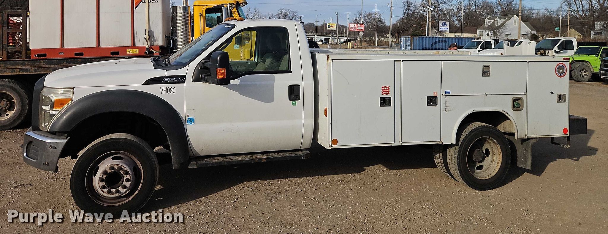 2015 Ford F550 utility / service truck. Miles: 99,220 on odometer, VIN: 1FDUF5GY2FEB10502, Unit #: VH080. Engine Displacement: 6.8L, Cylinders: 10, Fuel type: Gas, HP: 362. Transmission Automatic. Interior AC, Heat, Heated mirrors, Power windows, Power locks, Cruise control, Auxiliary controls, Brake controller. Features Bed Utility bed, Reading, Length: 11', Width: 95". Tires Size: 225/70R19.5. Notes Jump start required during on-site data collection. Missouri prior salvage motor vehicle title. Title distribution may be delayed up to 14 days from verification of funds. Magnum Boring LLC. Kansas City, MO 64131