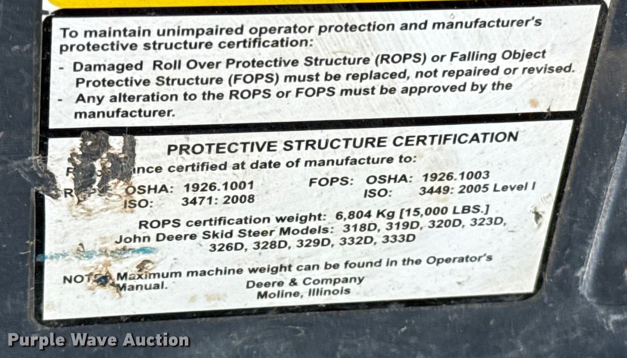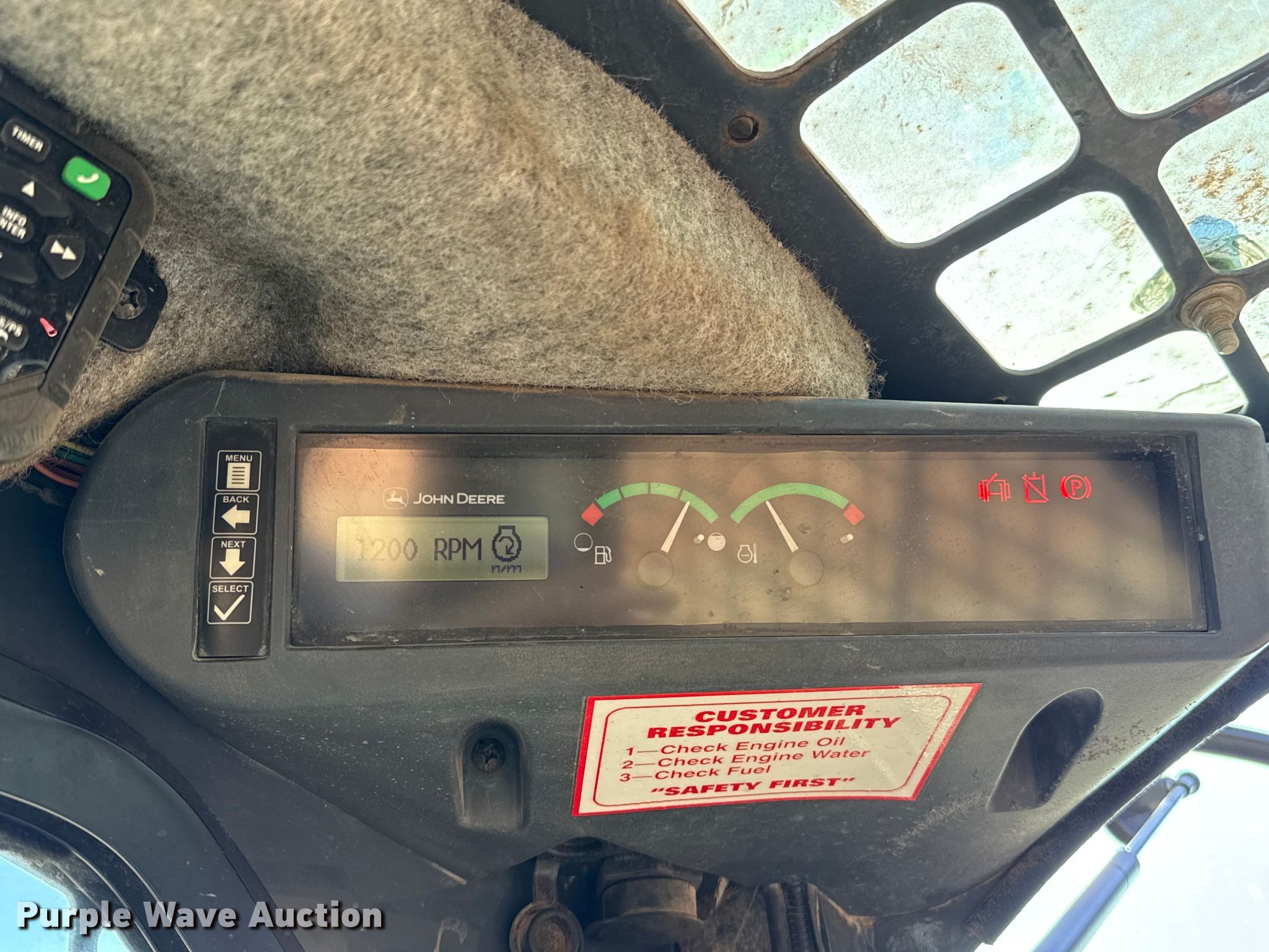 2013 John Deere 323DT tracked skid steer loader. Hours: 2,662 on meter, Serial: 1T0323DAECG235708. Engine John Deere 4024HT015, Serial: PE4024R105648, Cylinders: 4, Fuel type: Diesel. Transmission Hydrostatic. Operators station Enclosed cab, AC, Heat, Bucket control: Foot. Features Auxiliary hydraulics, Quick coupler: Manual, Counter weights, Bucket Bobcat, Width: 72", Low profile, Cutting edge: Bolt-on. Tracks Width: 12.5". Blanchard, OK 73010