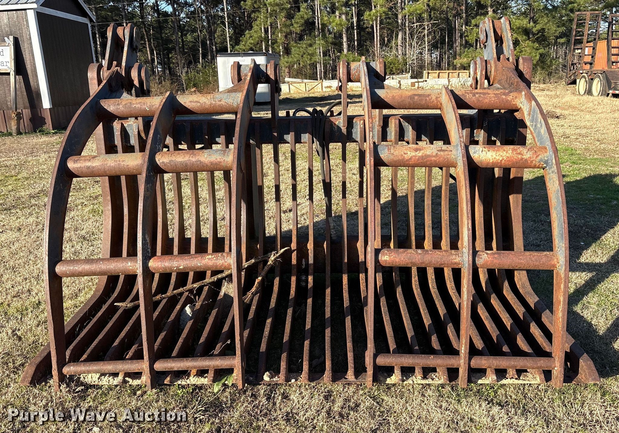 JRB 544H wheel loader root grapple bucket. Serial: 1201-83096-1/2, Width: 8' 6". Daingerfield Iron Inc. Naples, TX 75568