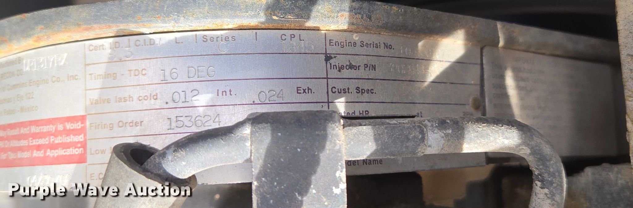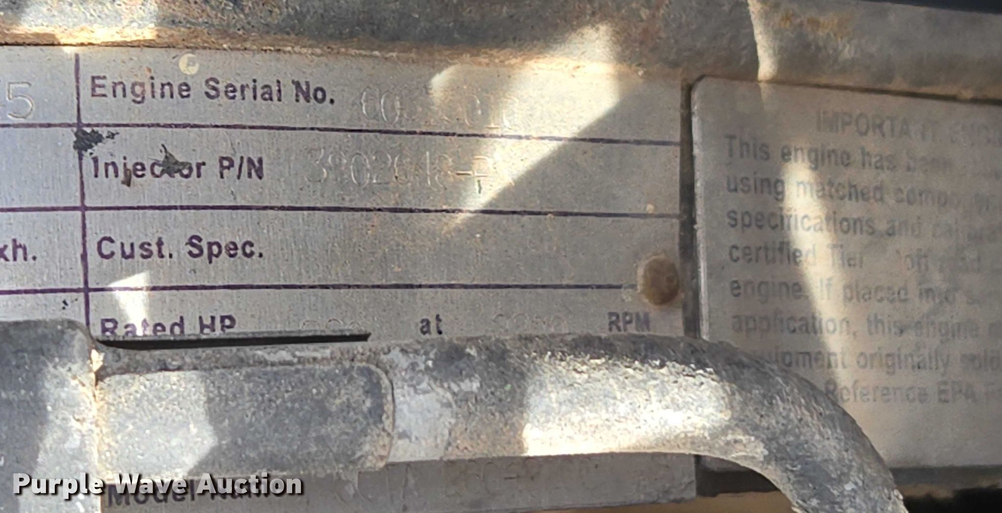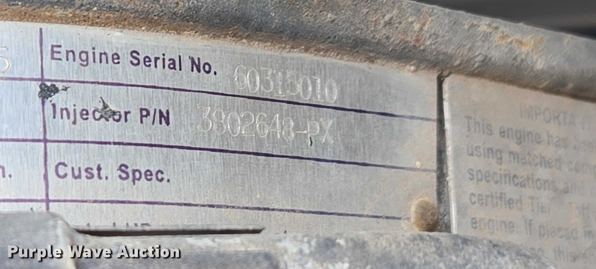 VMI INC. 615 dredge. Hours: 896 on meter, Serial: 636. Dimensions Overall Length: 37', Width: 9'. Engine Cummins 260-2200, Serial: 60315010, Displacement: 8.6, Cylinders: 6, Fuel type: Diesel. Notes Hydraulic leak, Windshield chipped or cracked. CP Materials. Mustang, OK 73064