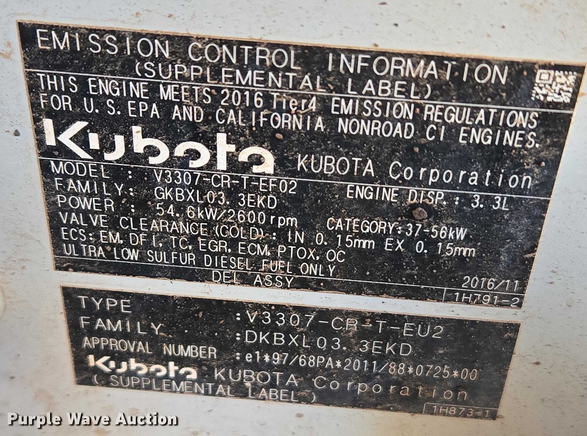 2017 Takeuchi TL8 tracked skid steer loader. Hours: 2,259 on meter, Serial: 200805011. Engine Kubota V3307-CR-T-EF02, Displacement: 3.3L, Cylinders: 4, Fuel type: Diesel. Transmission Hydrostatic, Two speed travel. Operators station Enclosed cab, AC, Heat, Bucket control: Hand. Features Auxiliary hydraulics, Auxiliary electrical outlet, Quick coupler: Hydraulic, Bucket Caterpillar, Width: 75", Low profile, Cutting edge: Bolt-on. Tracks Brand: KTSU, Width: 15.5". 4M Trenching Inc.. Oklahoma City, OK 73128