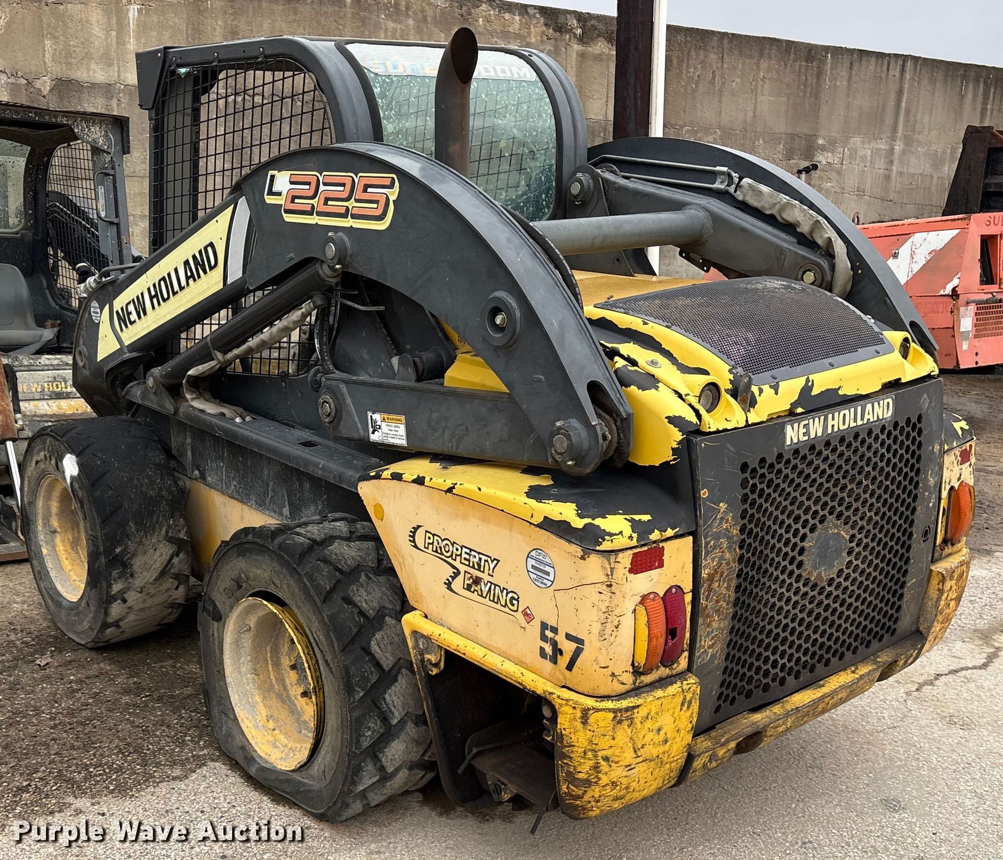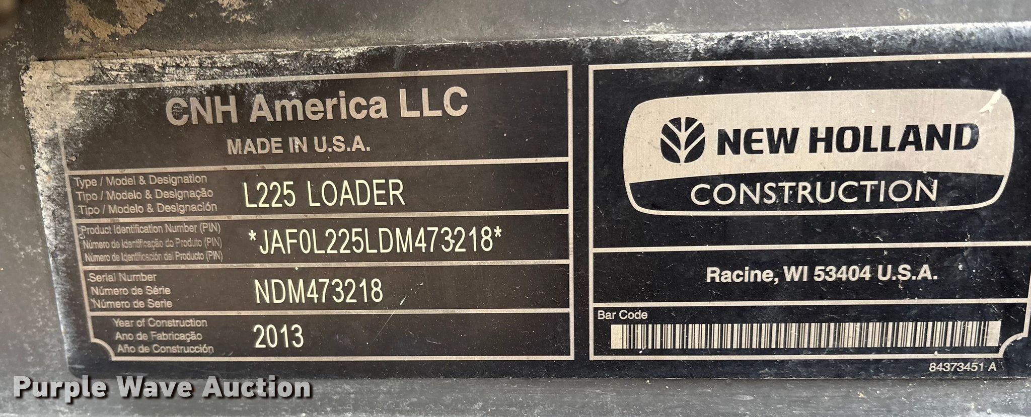 Purple Wave is selling a used Skid Steer Loader in Texas. This item is a 2013 New Holland L225 skid steer loader with the following: Hours: Unknown, Serial: JAF0L225LDM4733218
