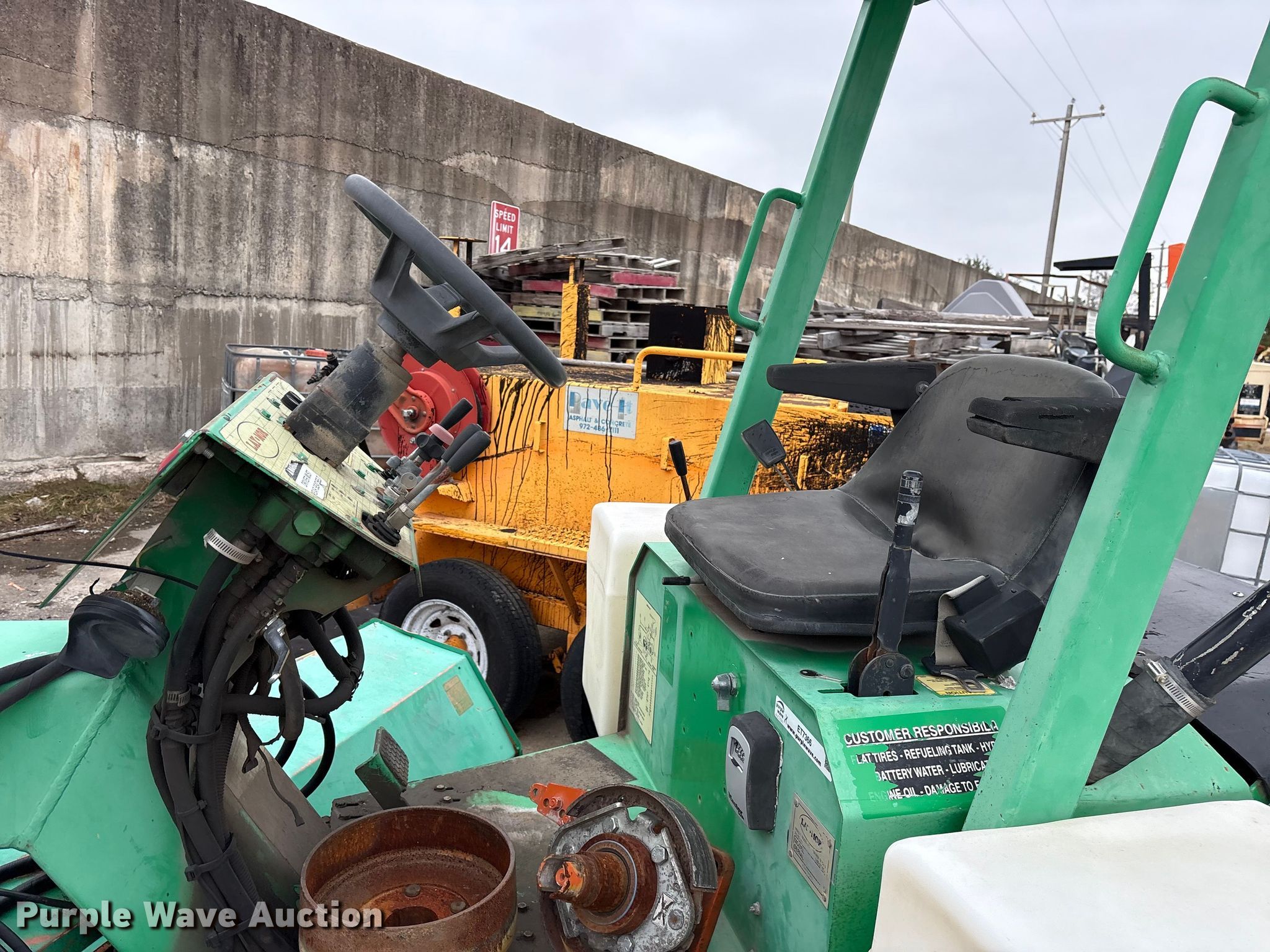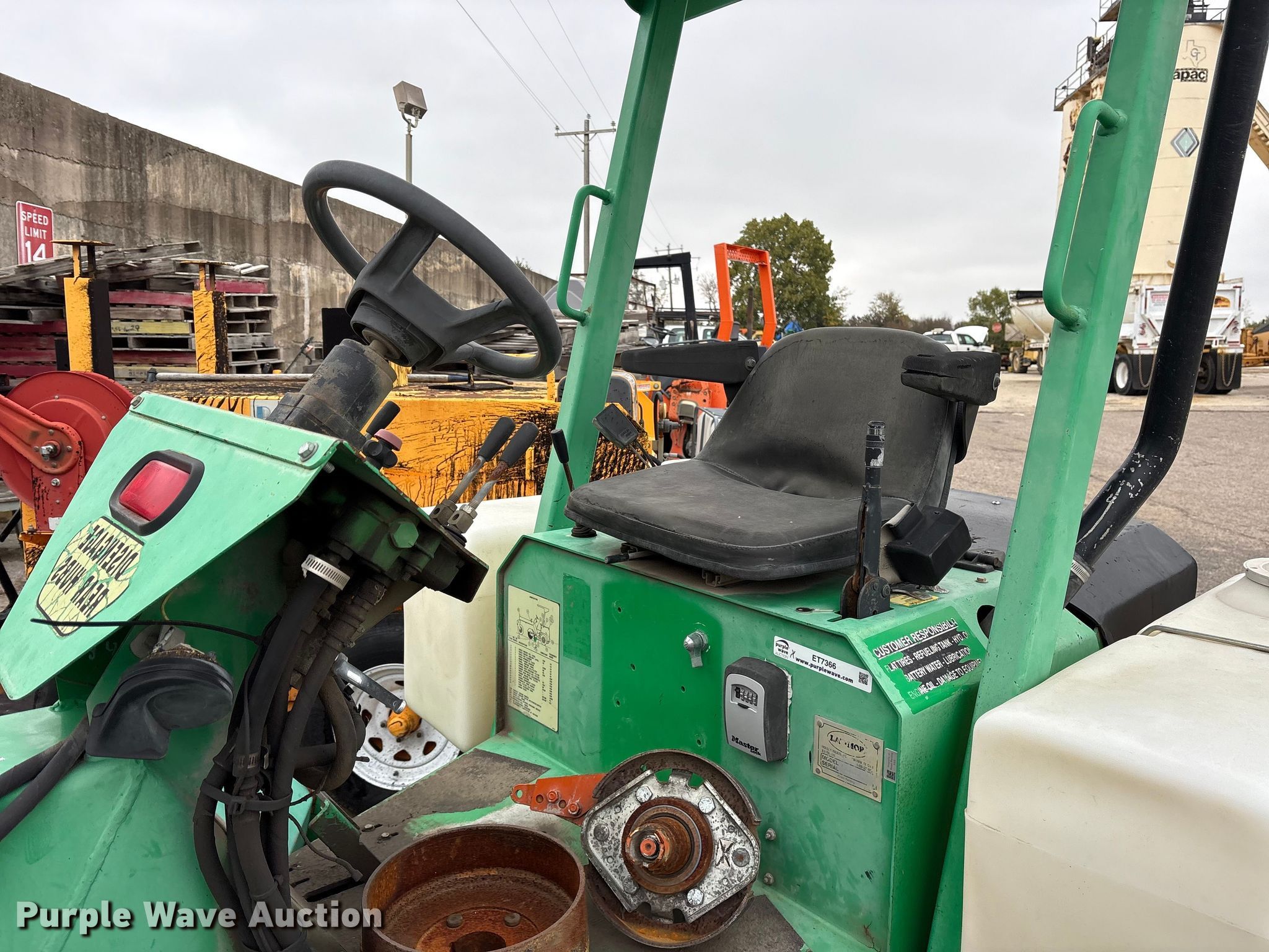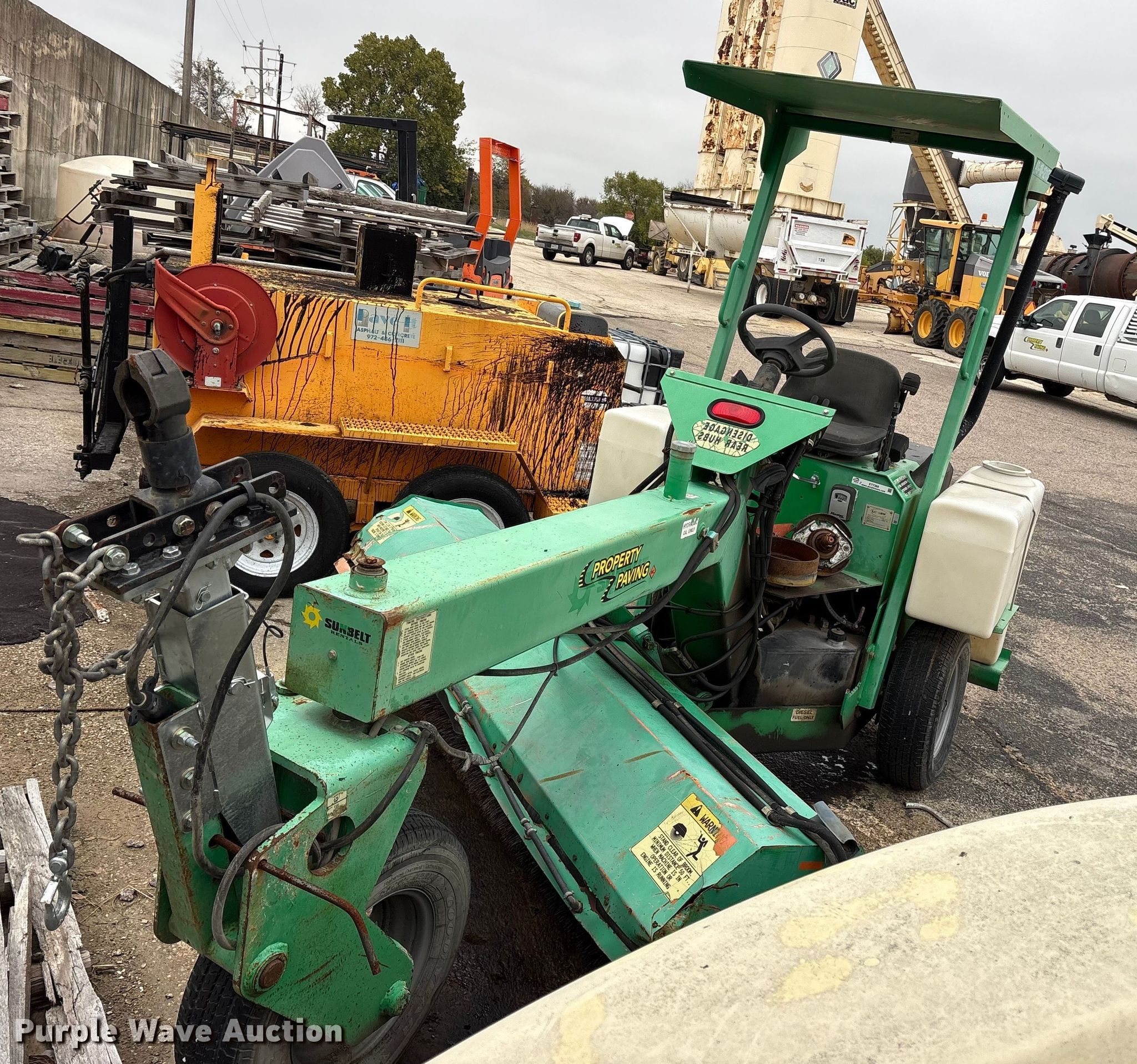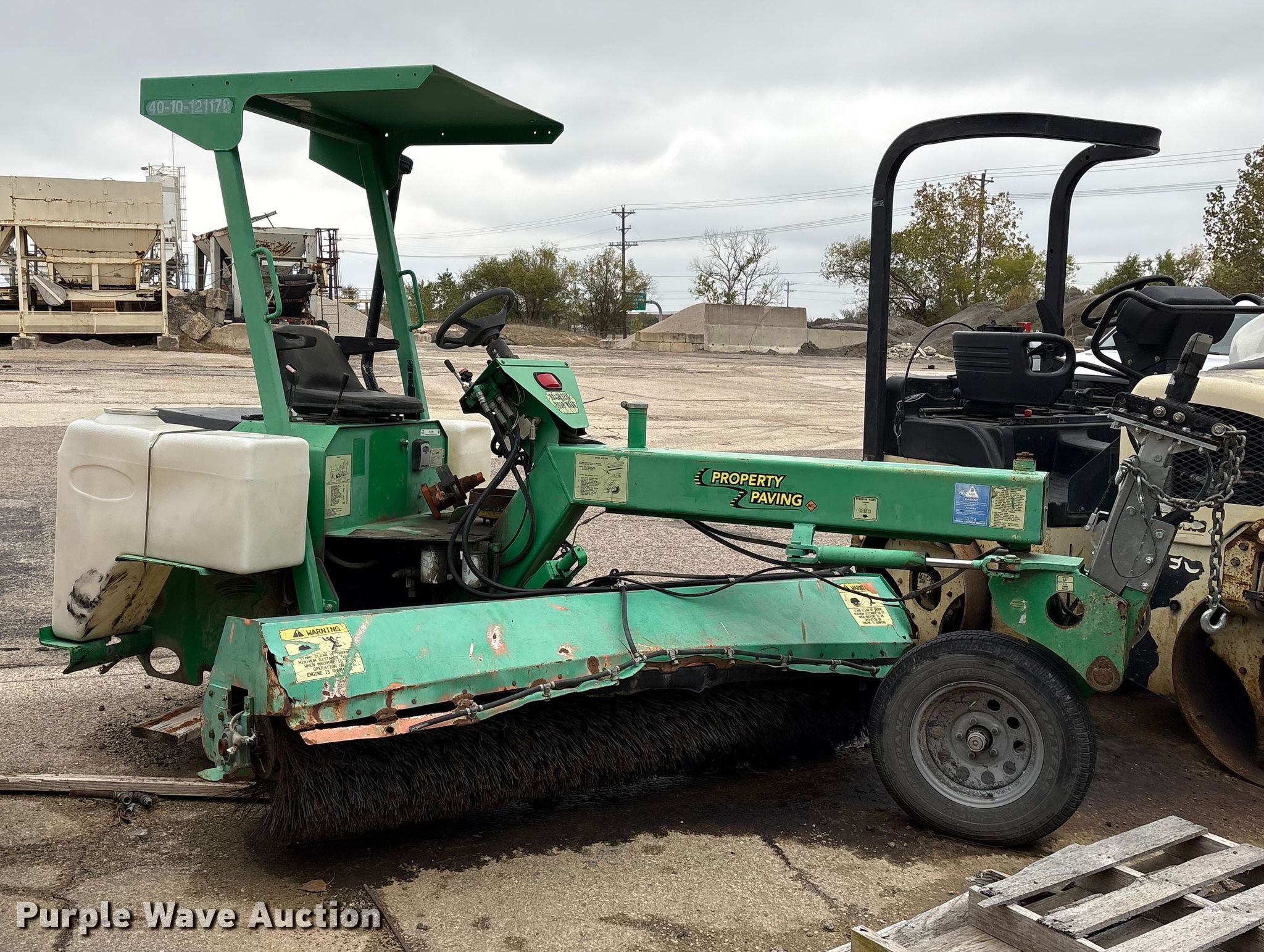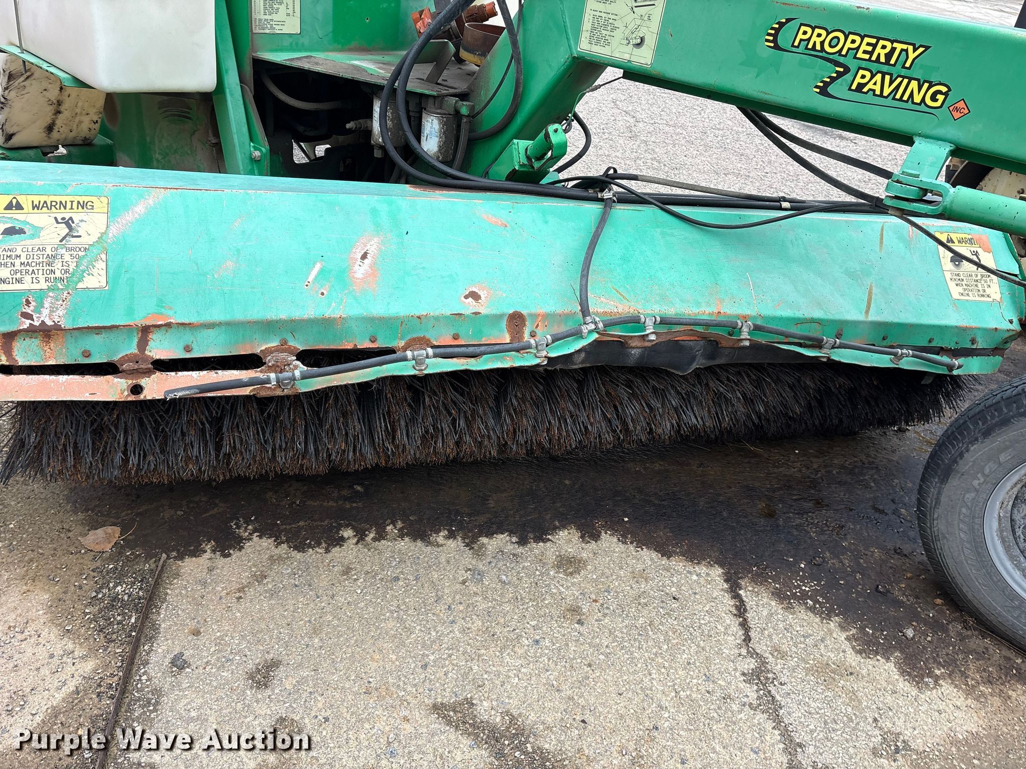 Lay-Mor 8HC broom. Hours: 1,982 on meter, Serial: 31691. Engine Kubota, Cylinders: 4, Fuel type: Diesel. Transmission Hydrostatic. Chassis Brakes: Hydraulic, Suspension: Torsion. Features Broom Width: 96". Tires Size: ST205/75R14. Notes Tire missing, Dead battery, Non-operational unit. Rose Paving. Frisco, TX 75035