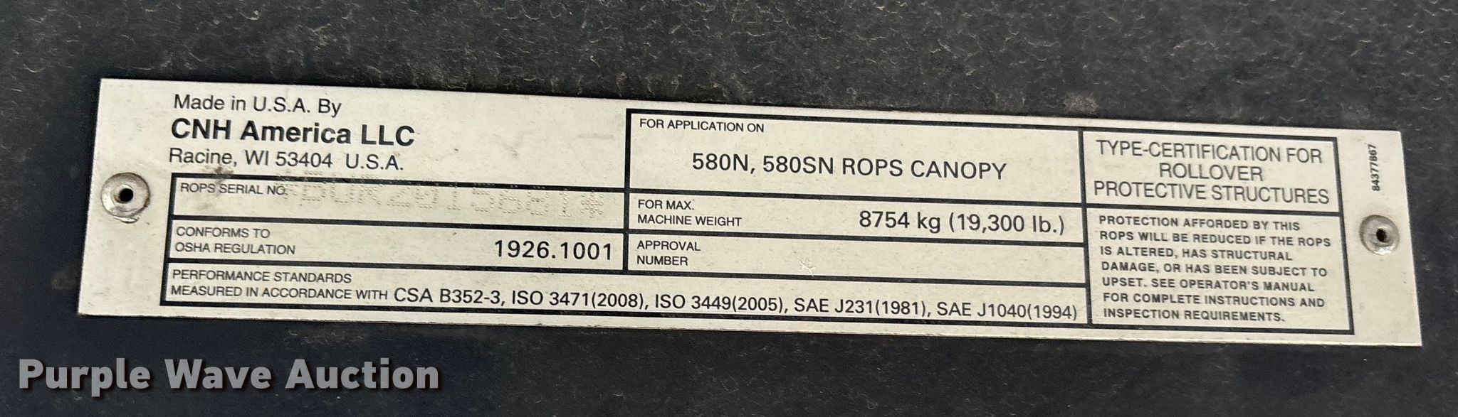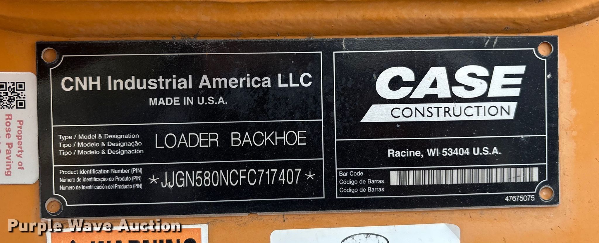 2015 Case 580N backhoe. Hours: 3,622 on meter, Miles or hours may vary, unit still in use, Serial: JJGN580NCFC717407. Engine FPT, Displacement: 3.4L, Cylinders: 4, Fuel type: Diesel. Transmission Shuttle shift, 4F - 4R. Operators station OROPS, Backhoe controls: Wobble stick / two stick. Features Loader Bucket Bucket leveler, Width: 83", Cutting edge: Bolt-on, Backhoe Bucket ASCO, Width: 24", Teeth: 5.. Tires Front: 11L-16, Rear: 19.5L-24 IND. Notes Warning indicator: Stop engine, Exhaust warning, Key not included, Possible engine issues, idle issues. Rose Paving. Frisco, TX 75035
