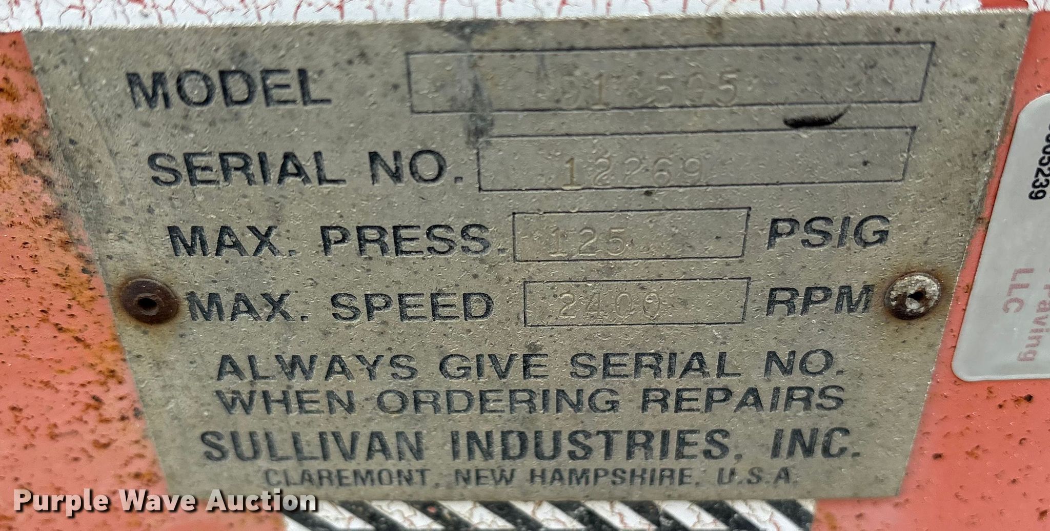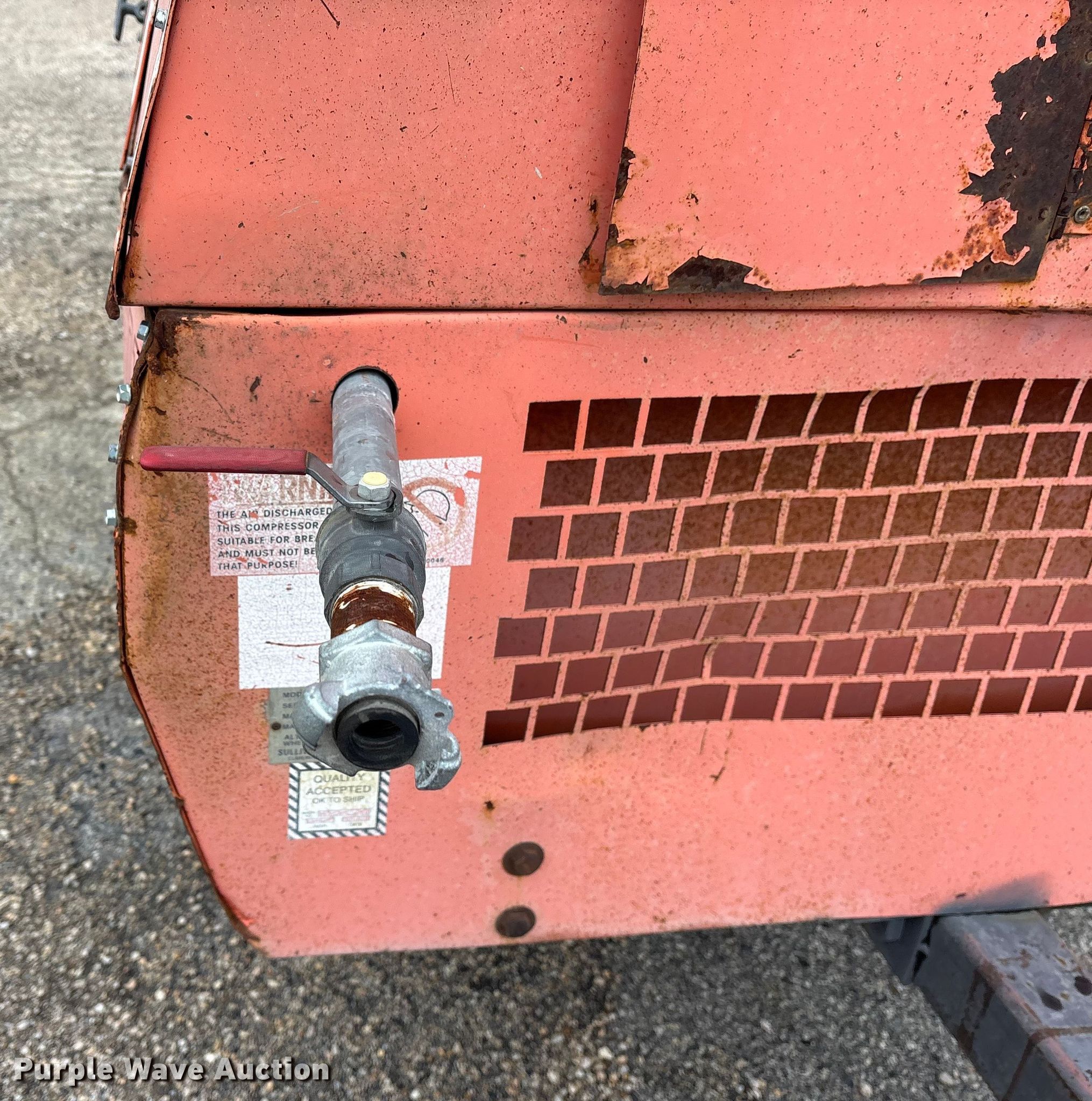 Purple Wave is selling a used Air Compressor in Texas. This item is a Sullivan D18505 air compressor with the following: Hours: 1,386 on meter, Serial: 12269