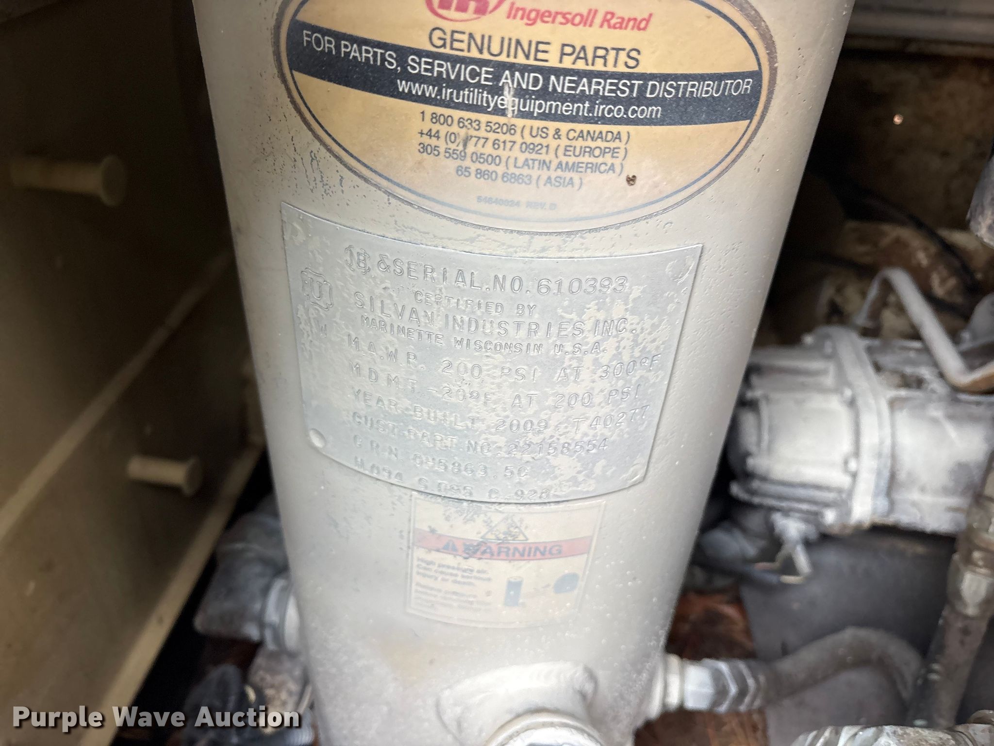 Purple Wave is selling a used Air Compressor in Texas. This item is a 2009 Ingersoll Rand P185WJD air compressor with the following: Hours: 1,022 on meter, Serial: 40S343JETD08
