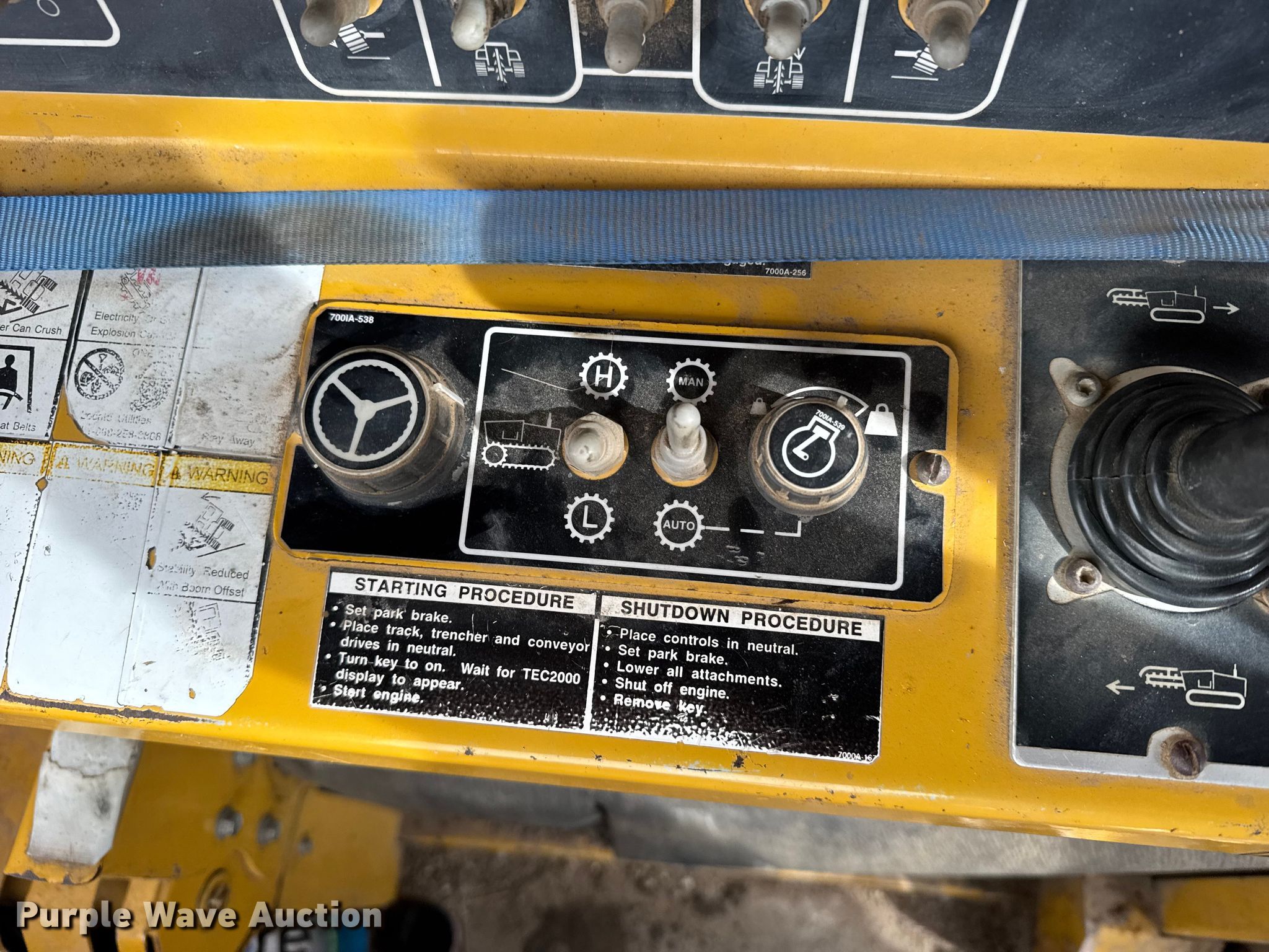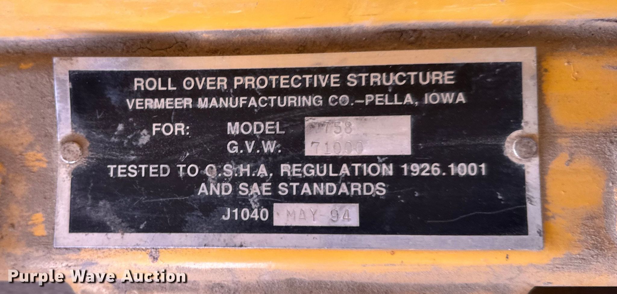 2001 Vermeer T758TR trencher. Hours: 4,520 on meter, Serial: 1VRN080R411000159. Engine Cylinders: 6, Fuel type: Diesel. Transmission Hydrostatic, Two speed travel. Operators station Enclosed cab. Features Trencher Estimated dig depth: 96", Cutting width: 16", Side shift, Teeth: Rock, Manual crumber, Conveyor Width: 24", Length: 84". Tracks Width: 21", Steel. Hoisington, KS 00000