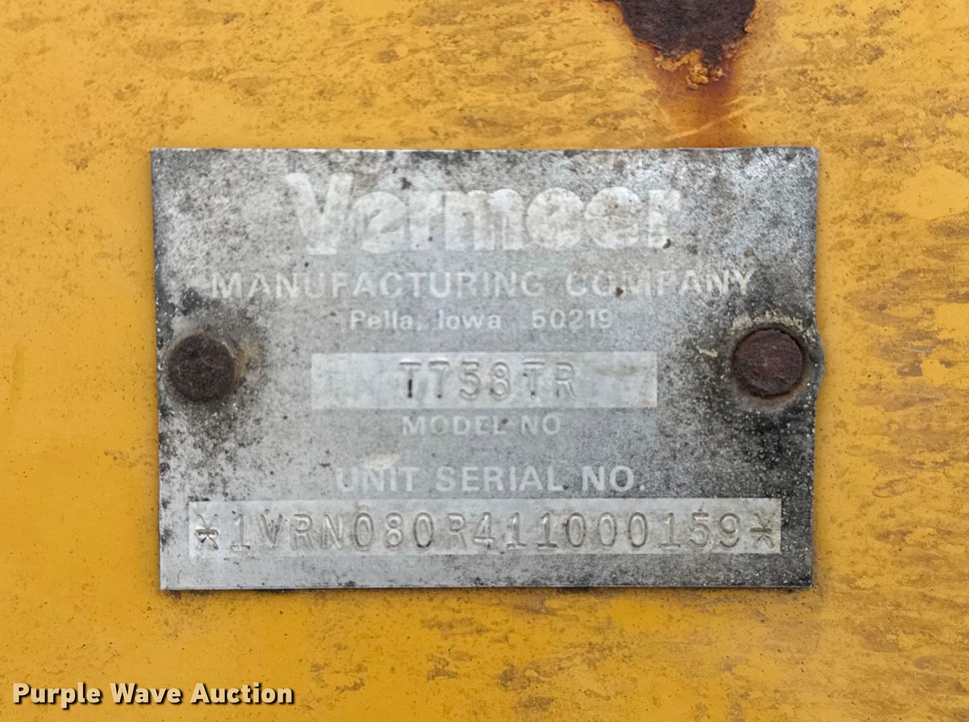 Purple Wave is selling a used Trencher or Rock Saw in Kansas. This item is a 2001 Vermeer T758TR trencher with the following: Hours: 4,520 on meter, Serial: 1VRN080R411000159