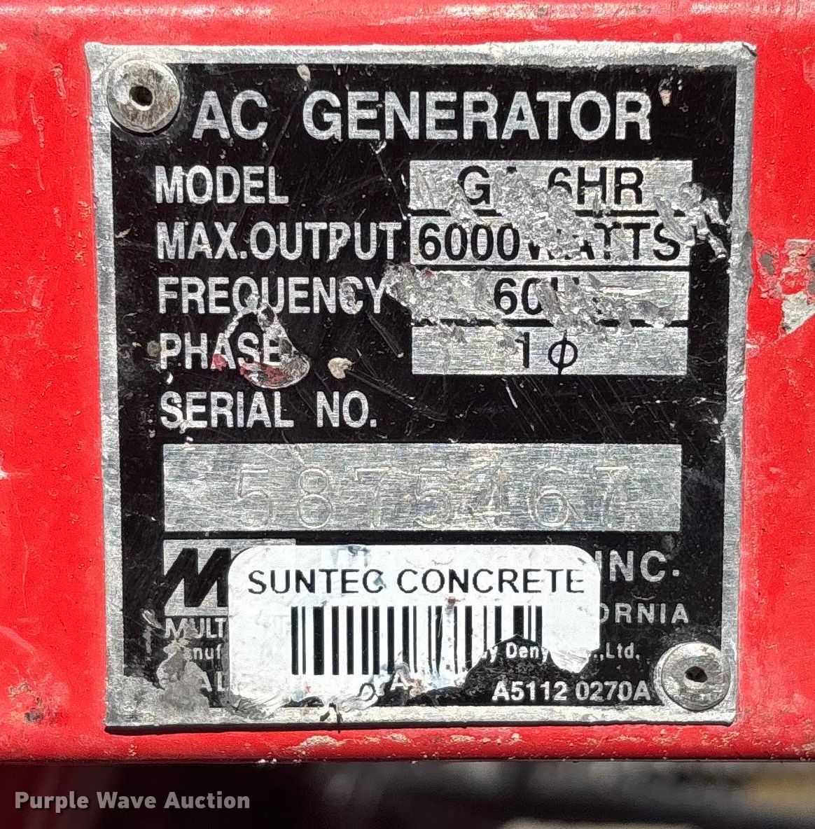 (6) generators. (3) Honda EB6500X, (3) Multiquip GA-6HR. Notes Parts may be missing, Non-operational unit. Suntec Concrete. Phoenix, AZ 85034