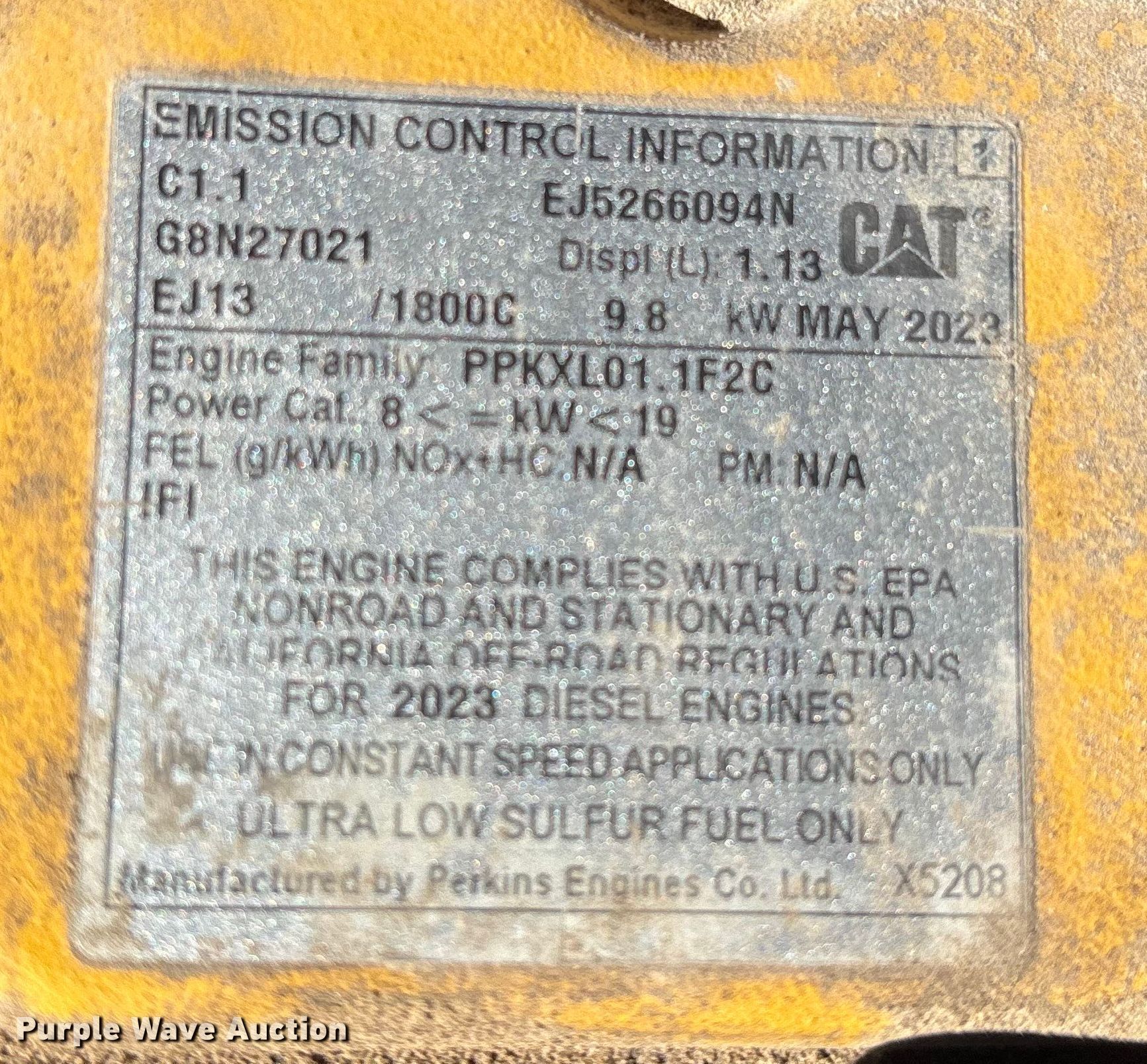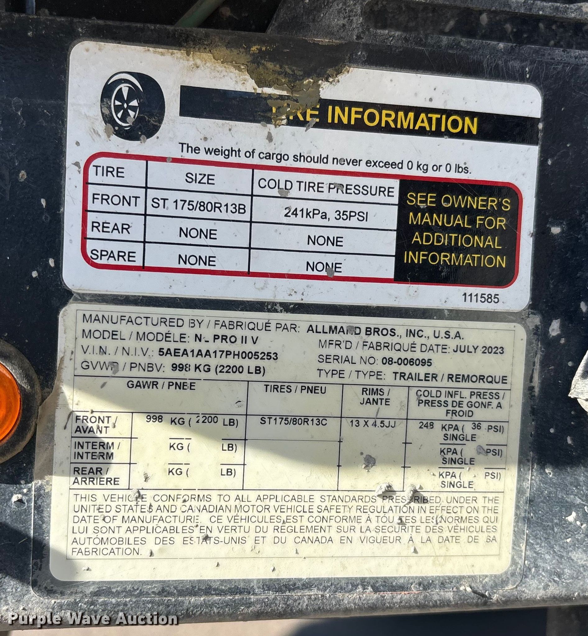 2023 Allmand Night Lite Pro II light plant. Hours: 3,093 on meter, VIN: 5AEA1AA17PH005253, Serial: 08-006095. Engine Caterpillar C1.1, Serial: EJ266094N, Displacement: 1.13L, Cylinders: 3, Fuel type: Diesel, kW: 9. Features Generator Pancake 201CSA5420, kVA: NaN, kW: NaN, Phase: Single, Light plant Bulbs: 4, Watts: 3,500, Hoist: Power. Trailer Allmand Bros N_ Pro II V, 10' L x 52" W, Ball hitch size: 2", Suspension: Spring, Axles: Single, Tire size: ST175/80R13, GVWR: 2,200 lbs, GAWR: 2,200 lbs. Notes Battery missing, Unknown operating condition. This is worksite support equipment and will not come with a title. Transfer of ownership documentation will be a bill of sale. Suntec Concrete. Phoenix, AZ 85034