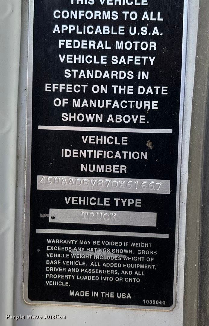 2007 Sterling SC8000 street sweeper truck. Miles: 64,432 on odometer, Miles: 74,963 on second odometer, Hours: 10,859 on meter, VIN: 49HAADBV87DX61667, Serial: MV1324D. Engine Cummins, Displacement: 5.9L, Cylinders: 6, Fuel type: Diesel. Transmission Automatic. Chassis Suspension: Spring, Brakes: Air, GVWR: 33,000 lbs. Operators station AC, Heat, Dual operating station. Features Bed Elgin Whirlwind, Length: 10' 10", Width: 89", Sweeper bed type: Vacuum, Broom Width: 55", Left gutter broom Hours: 154, Diameter: 24", Right gutter broom Hours: 1,000, Diameter: 24", Water spray system, Engine Cylinders: 4. Tires Size: 11R22.5. Notes Oil leak, Bed issues, Hydraulic issues, Control panel issues, Rust damage, Non-operational AC, Heat. Missouri title. Title distribution may be delayed up to 14 days from verification of funds. Hartman & Co, Inc. Springfield, MO 65803