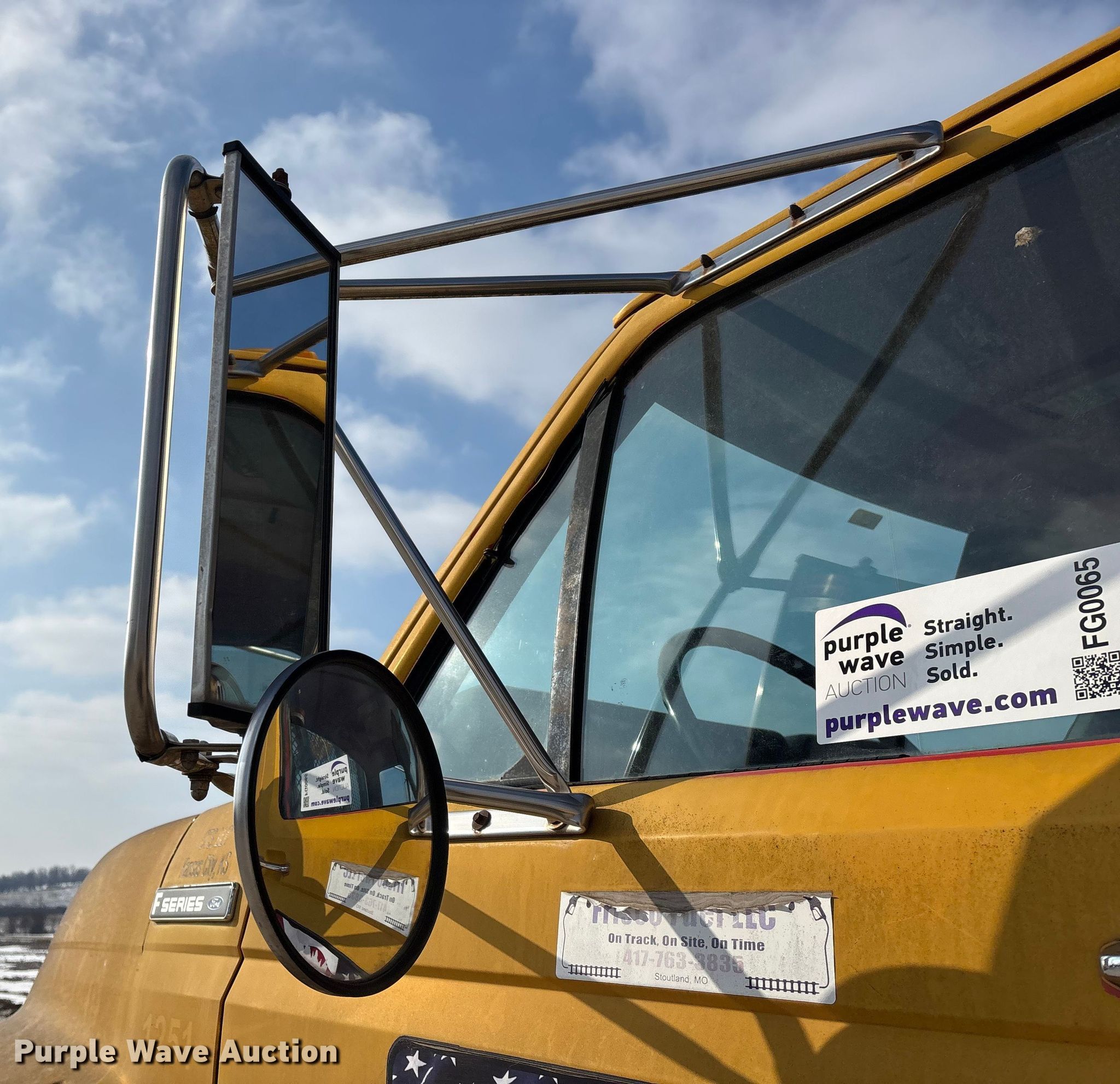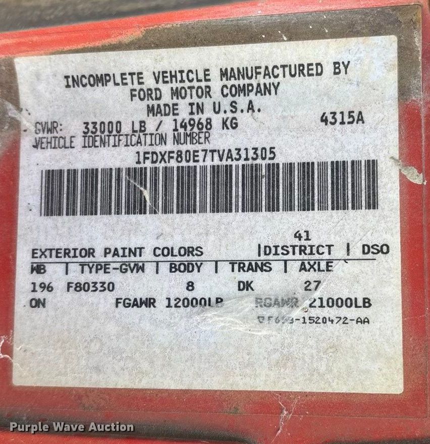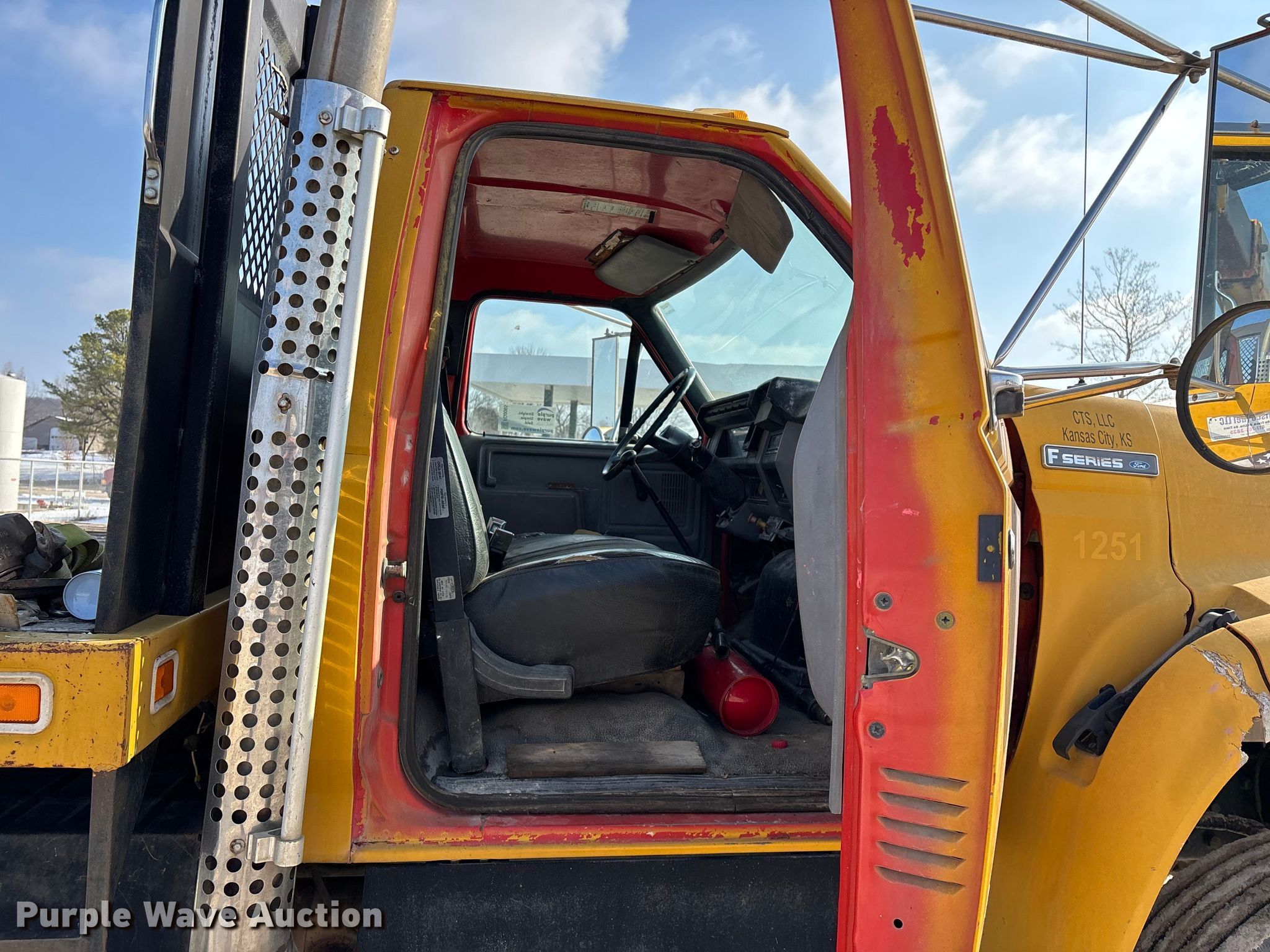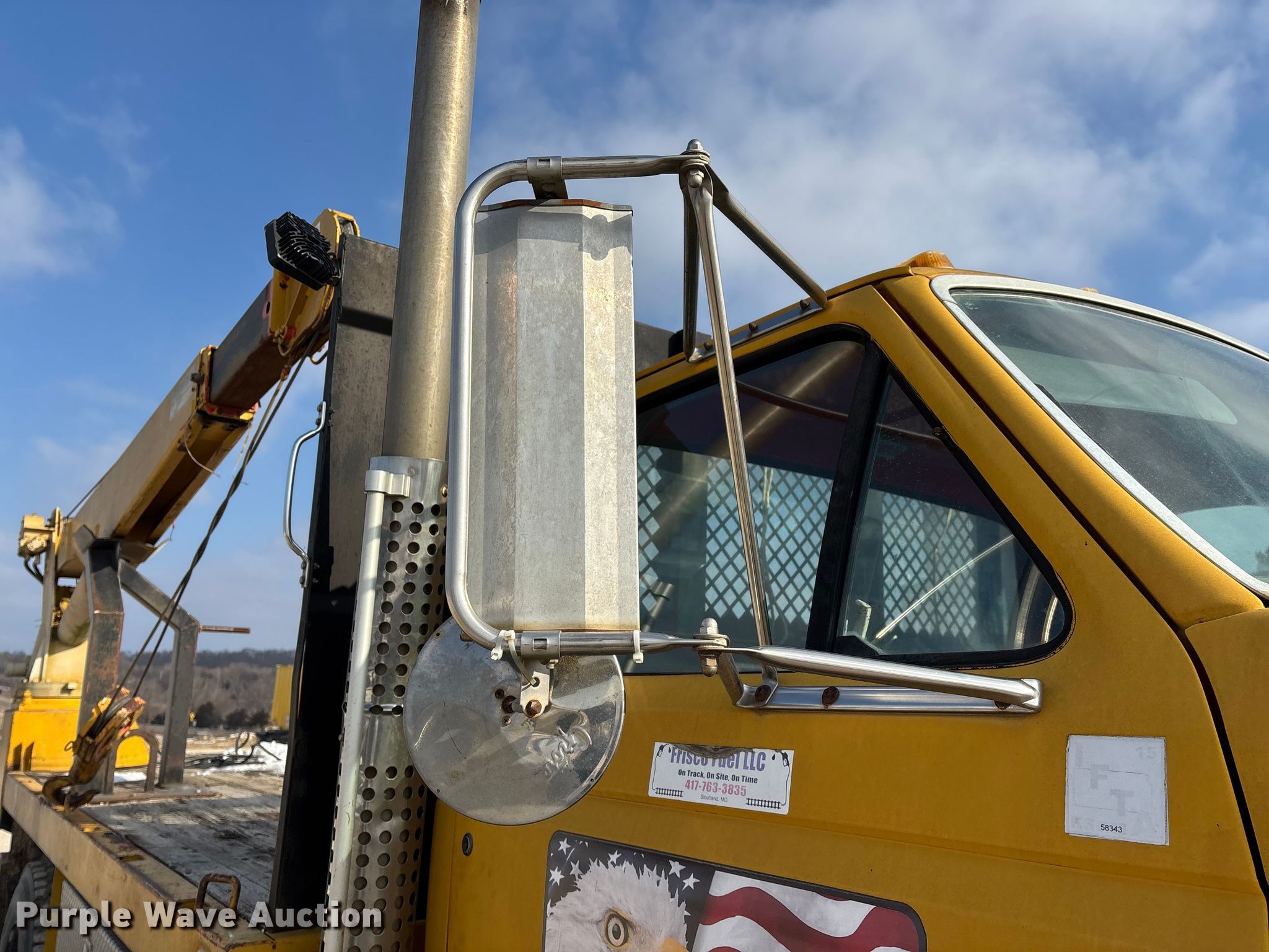 1996 Ford F-Series Flat bed truck with crane. Miles: 132,361 on odometer, VIN: 1FDXF80E7TVA31305. Engine Cummins C8.3-210, Displacement: 8.3L, Cylinders: 6, Fuel type: Diesel. Transmission Manual. Chassis Axles: Single, Suspension: Spring, Brakes: Air, PTO, GVWR: 33,000 lbs. Interior Heat, Brake controller. Features Bed Flatbed, Length: 16' 3", Width: 96", Crane Serial: 028G0296, Boom length: 12' 6". Tires Size: 11R22.5. Notes Contents not included, License plate will be removed prior to auction. Missouri title. Title distribution may be delayed up to 14 days from verification of funds. Fleet Fuels LLC. Camdenton, MO 65020