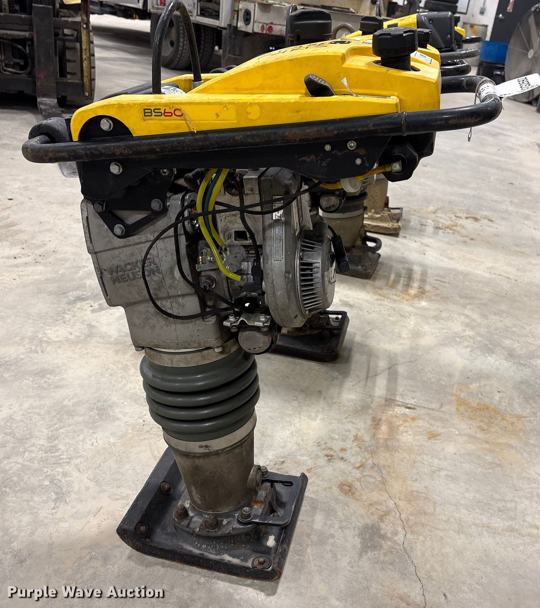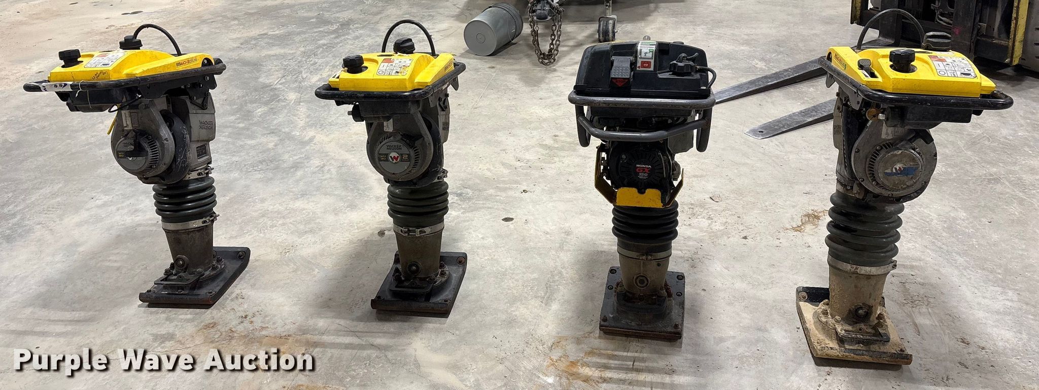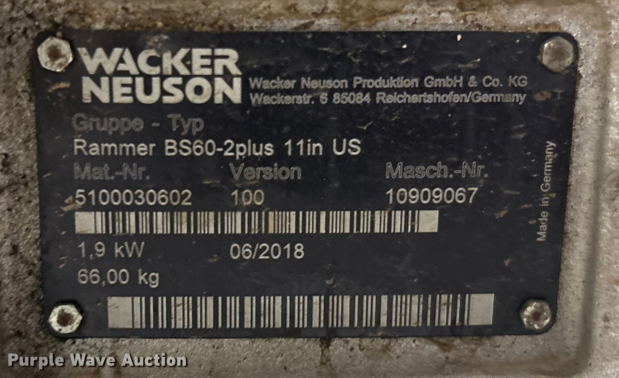 Purple Wave is selling a used Walk Behind Compactor in Nebraska. This item is a (4) plate compactors with the following: Wacker Neuson Rammer BS60-2plus, Serial: 10909062, Hours: 100 on meter, Plate size: 11", Wacker Neuson Rammer BS60-2plus, Serial: 10909067, Hours: 56 on meter, Plate size: 11", Wacker Neuson Rammer BS60-2plus, Serial: 10885396, Hours: 89, Plate size: 11", Parts only, 2012 Atlas Copco Rammer LT6004, Honda GX 100 gas engine