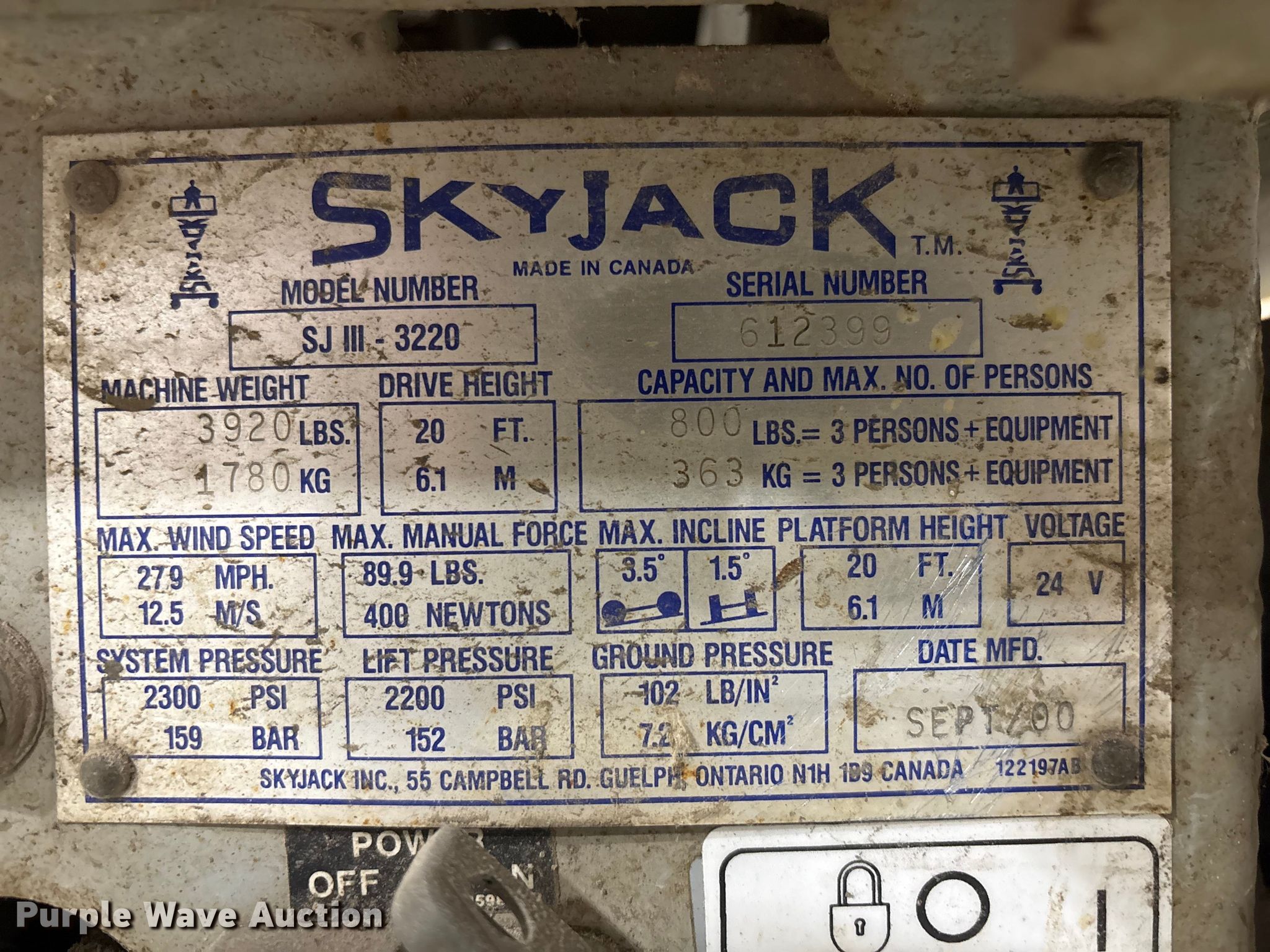 Purple Wave is selling a used Scissor or Vertical Lift in Nebraska. This item is a 2000 Skyjack SJ III-3220 scissor lift with the following: Hours: 482 on meter, Serial: 612399