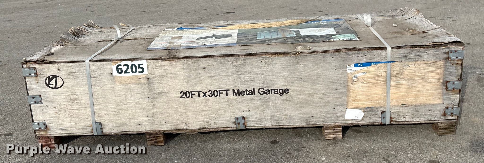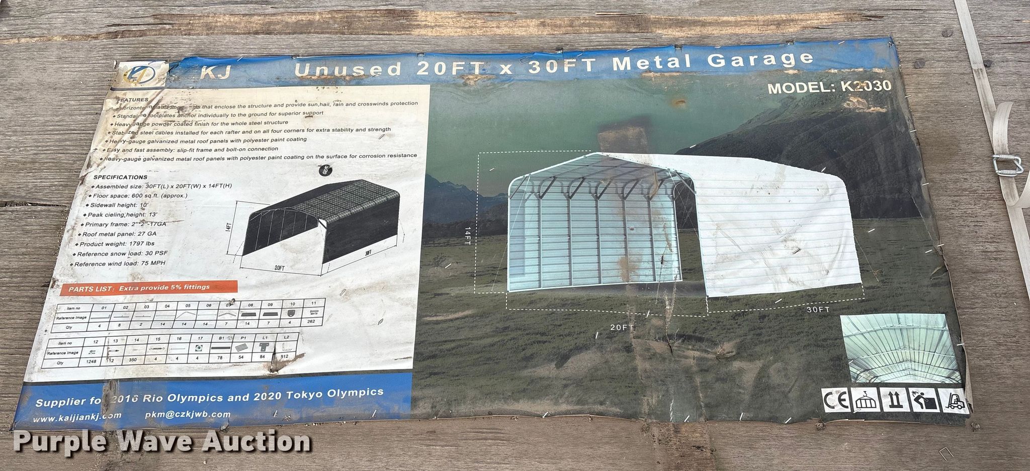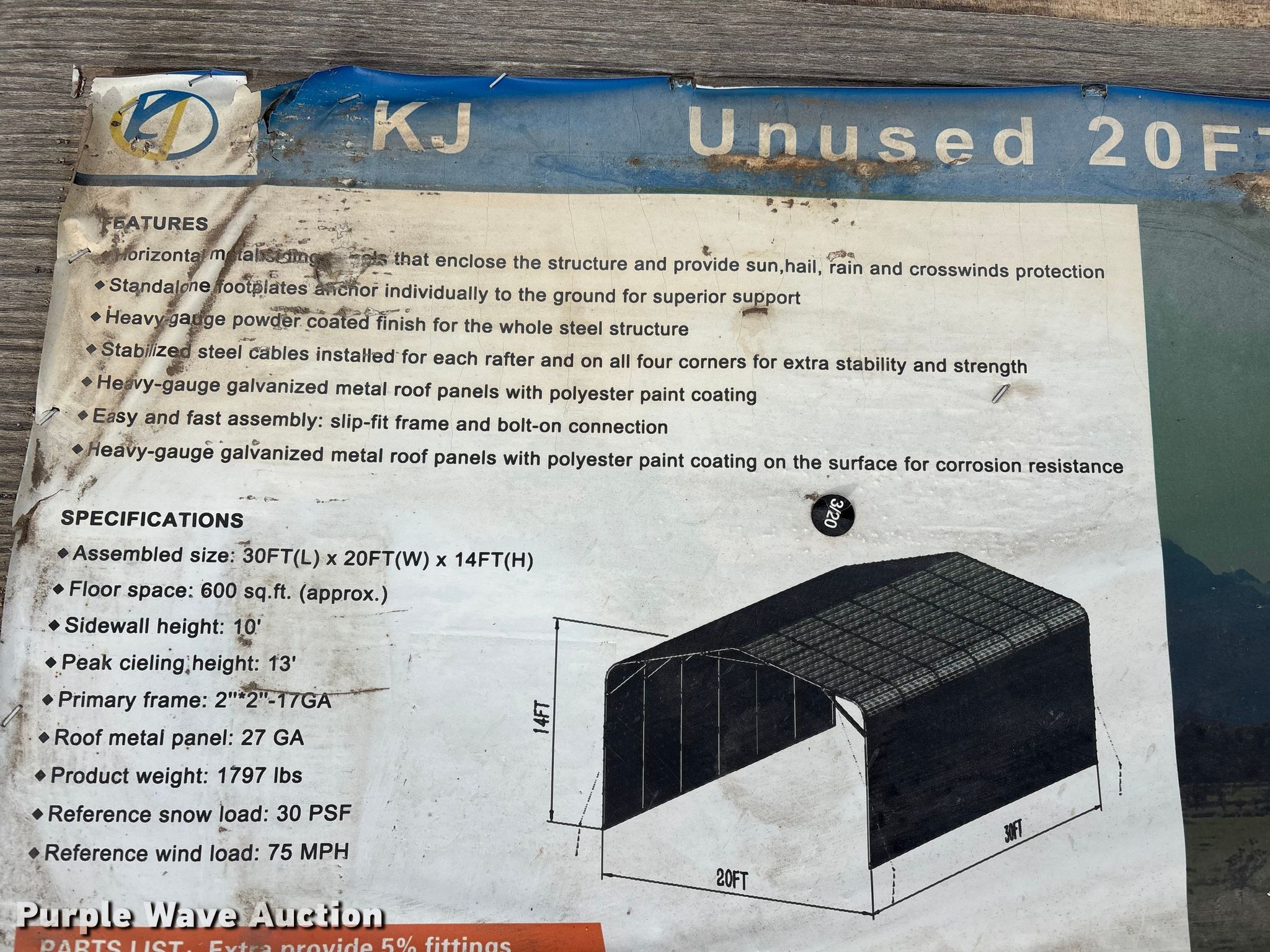 Purple Wave is selling a used Building Materials in Nebraska. This item is a KJ K2030 metal garage with the following: Dimensions: 20' x 30' x 14', Sidewall height: 10', Peak ceiling height: 13', Roof metal: 27 GA, Product weight: 1797lbs, Wind load: 75mph