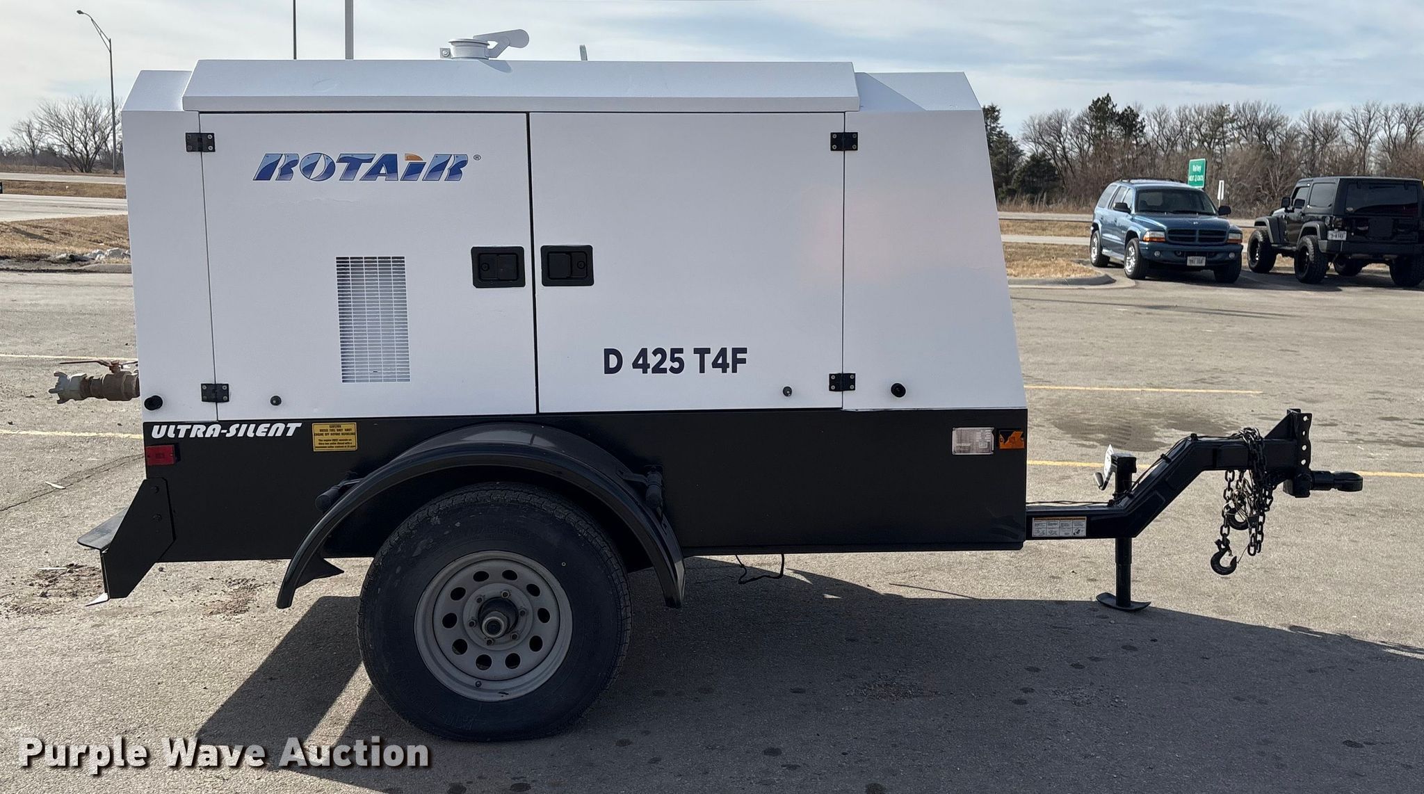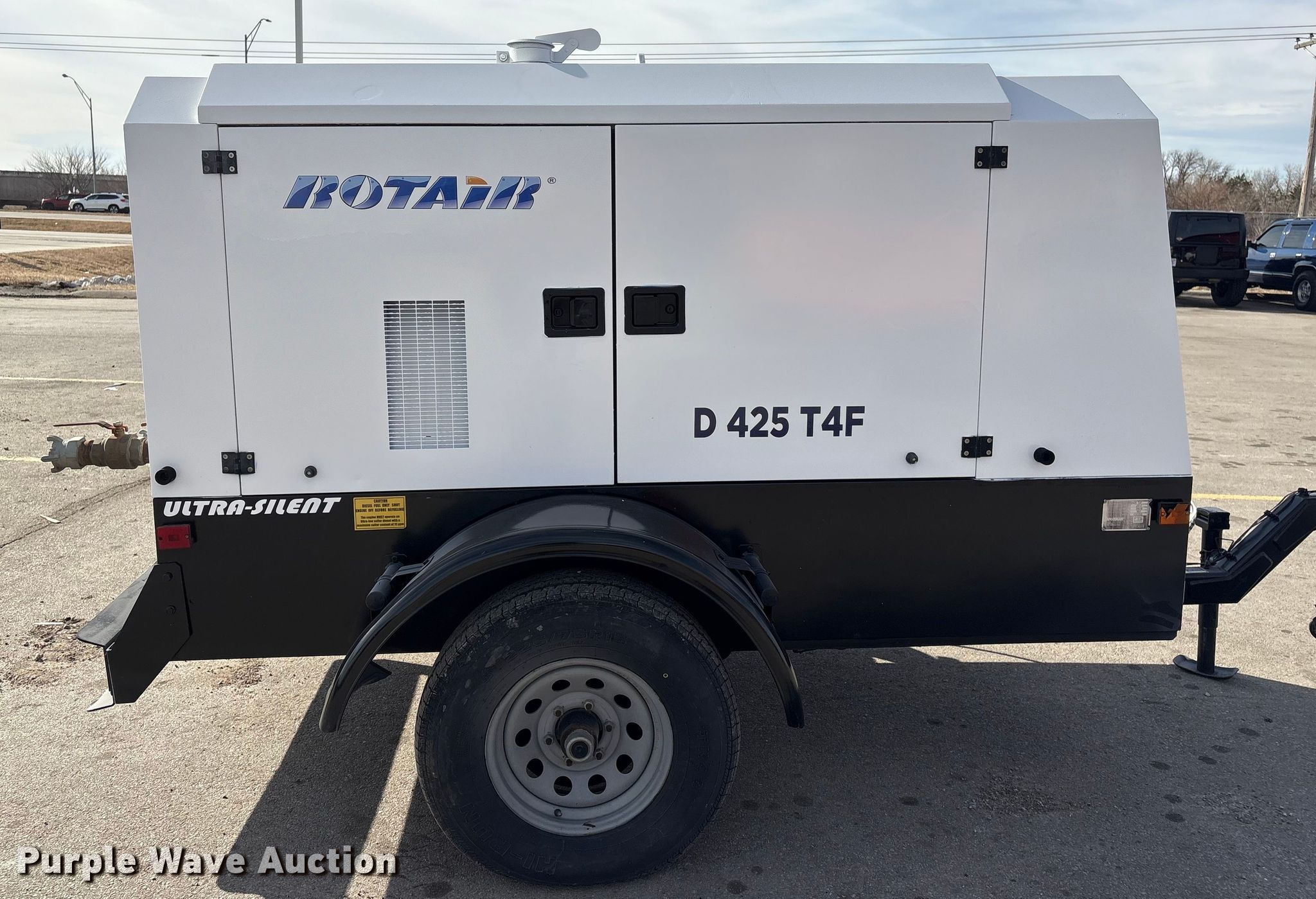 2017 Rotair D425T4F air compressor. Hours: 1,163 on meter, Serial: C41150. Engine Cummins QSF 3.8, Serial: 89964624, Displacement: 3.8L, Cylinders: 4, Fuel type: Diesel. Features Air compressor CFM: 425, PSI: 100, (3) 3/4" air outlets, (1) 2" air outlet. Trailer 13' L x 76" W, Ball hitch size: 2 5/16", Suspension: Torsion, Brakes: Electric, Axles: Single, Tire size: 225/75R15, GVWR: 952 lbs. This is worksite support equipment and will not come with a title. Transfer of ownership documentation will be a bill of sale. Jordan Truck and Equipment. Waterloo, NE 68069