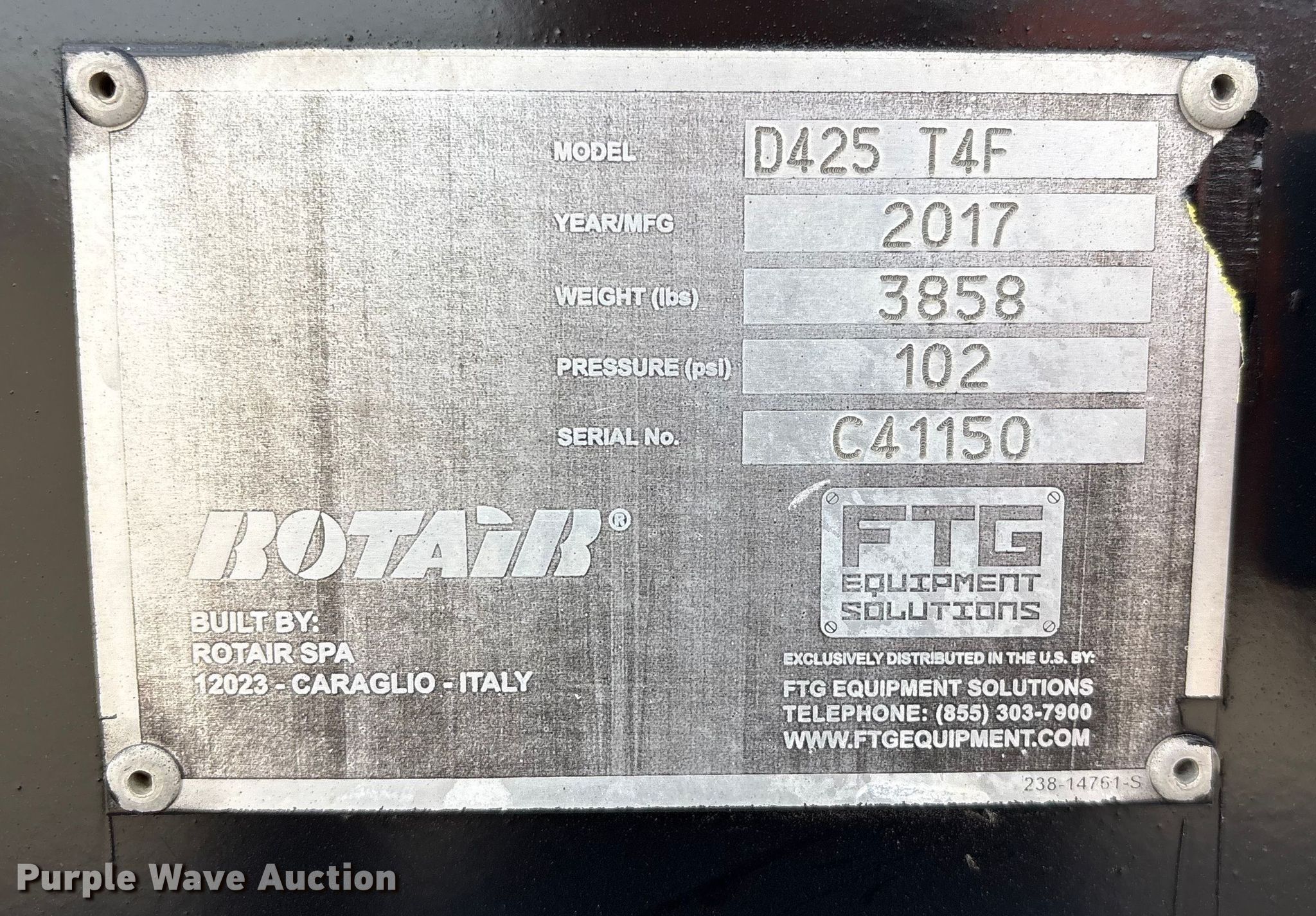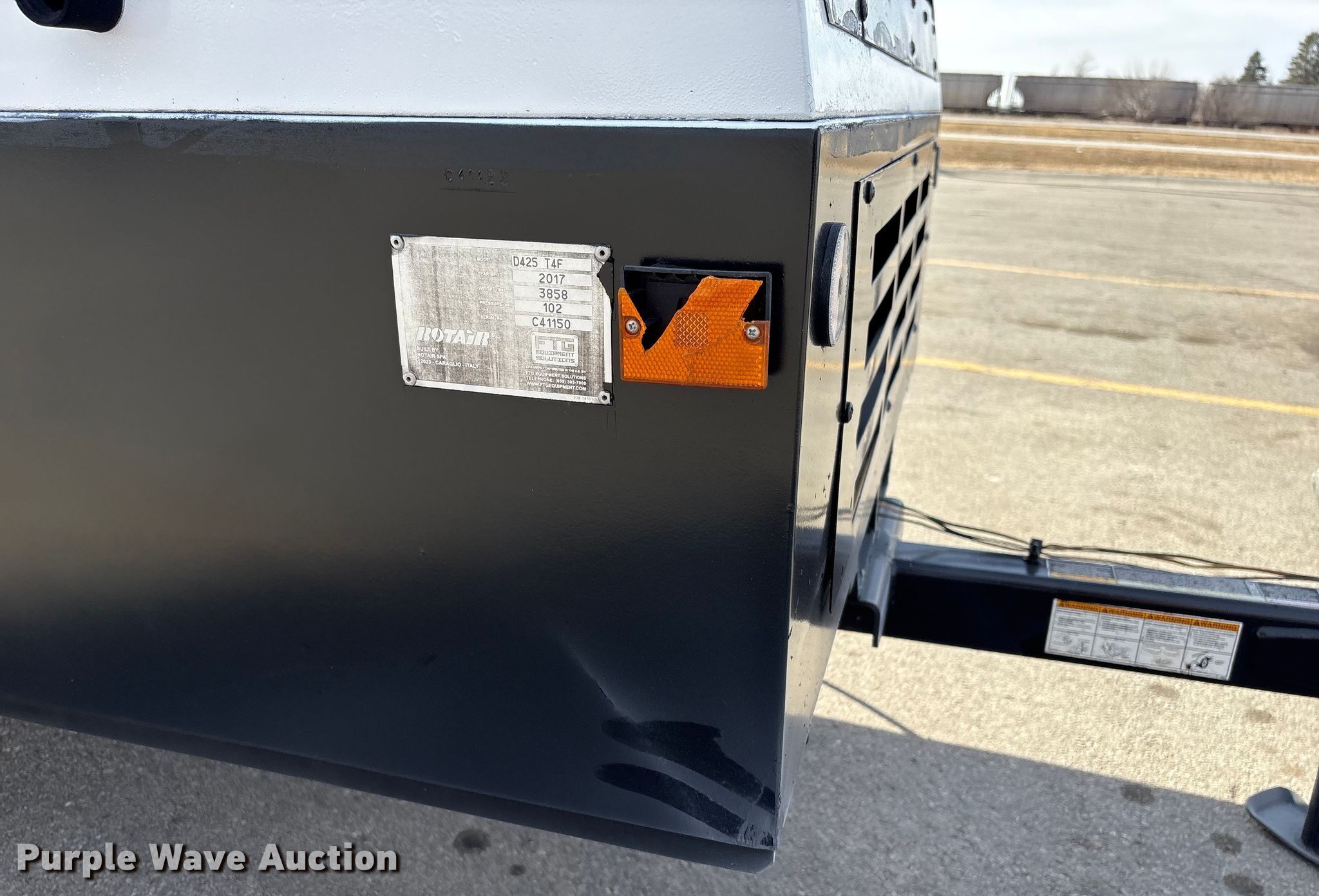 Purple Wave is selling a used Air Compressor in Nebraska. This item is a 2017 Rotair D425T4F air compressor with the following: Hours: 1,163 on meter, Serial: C41150