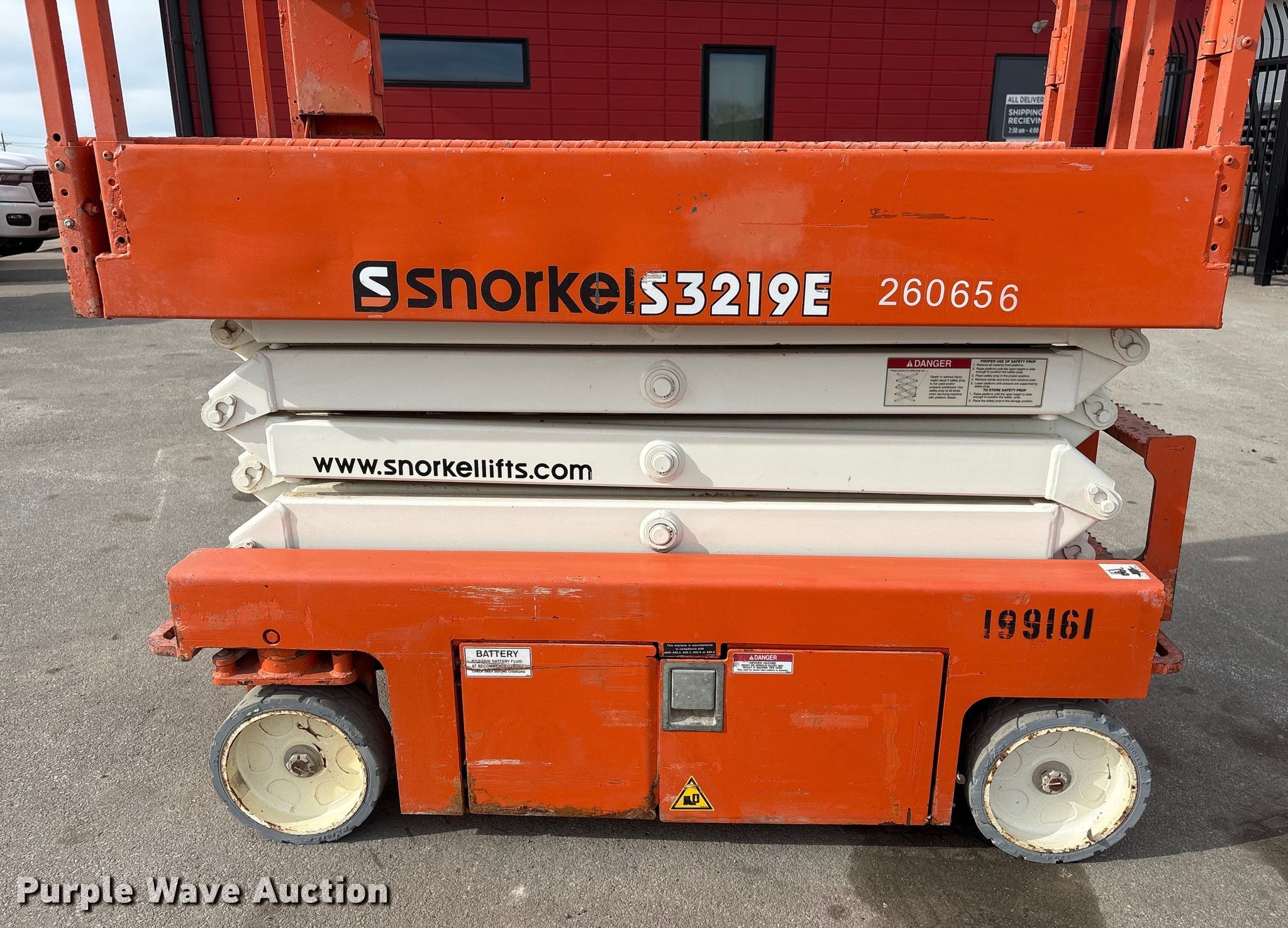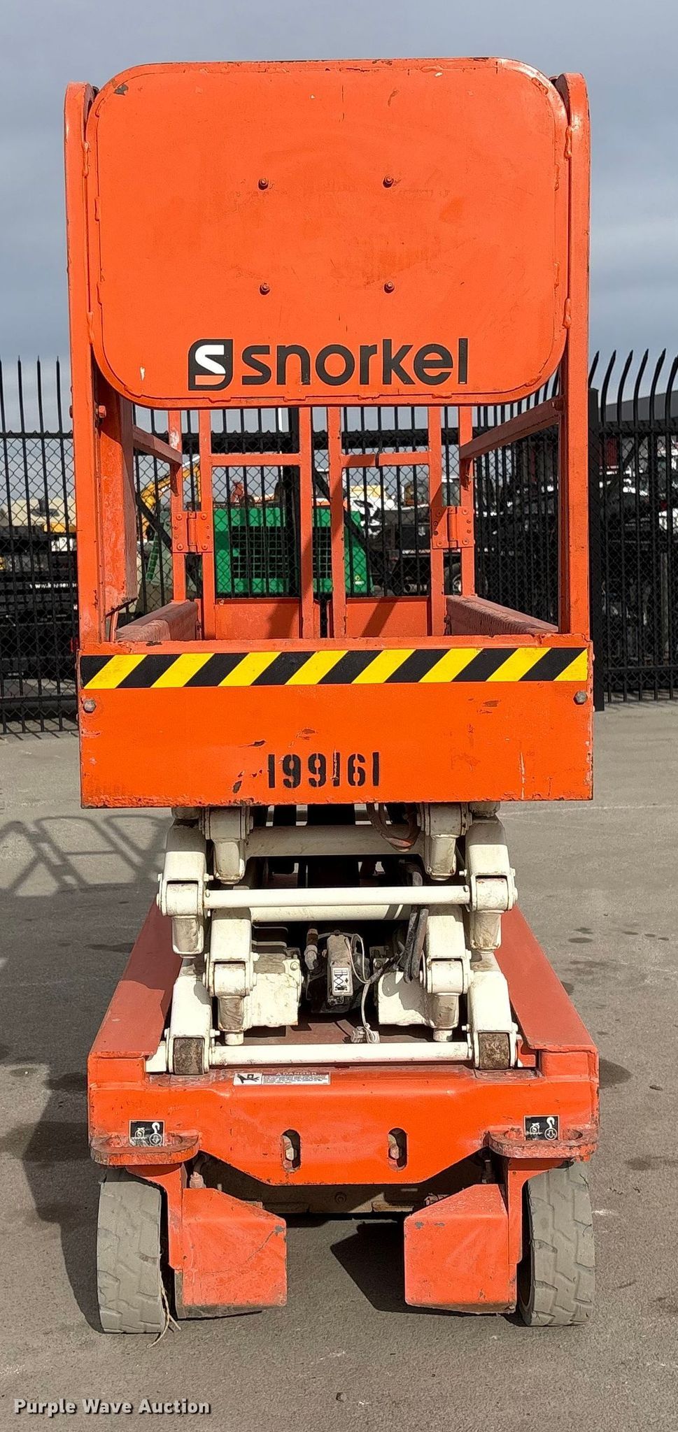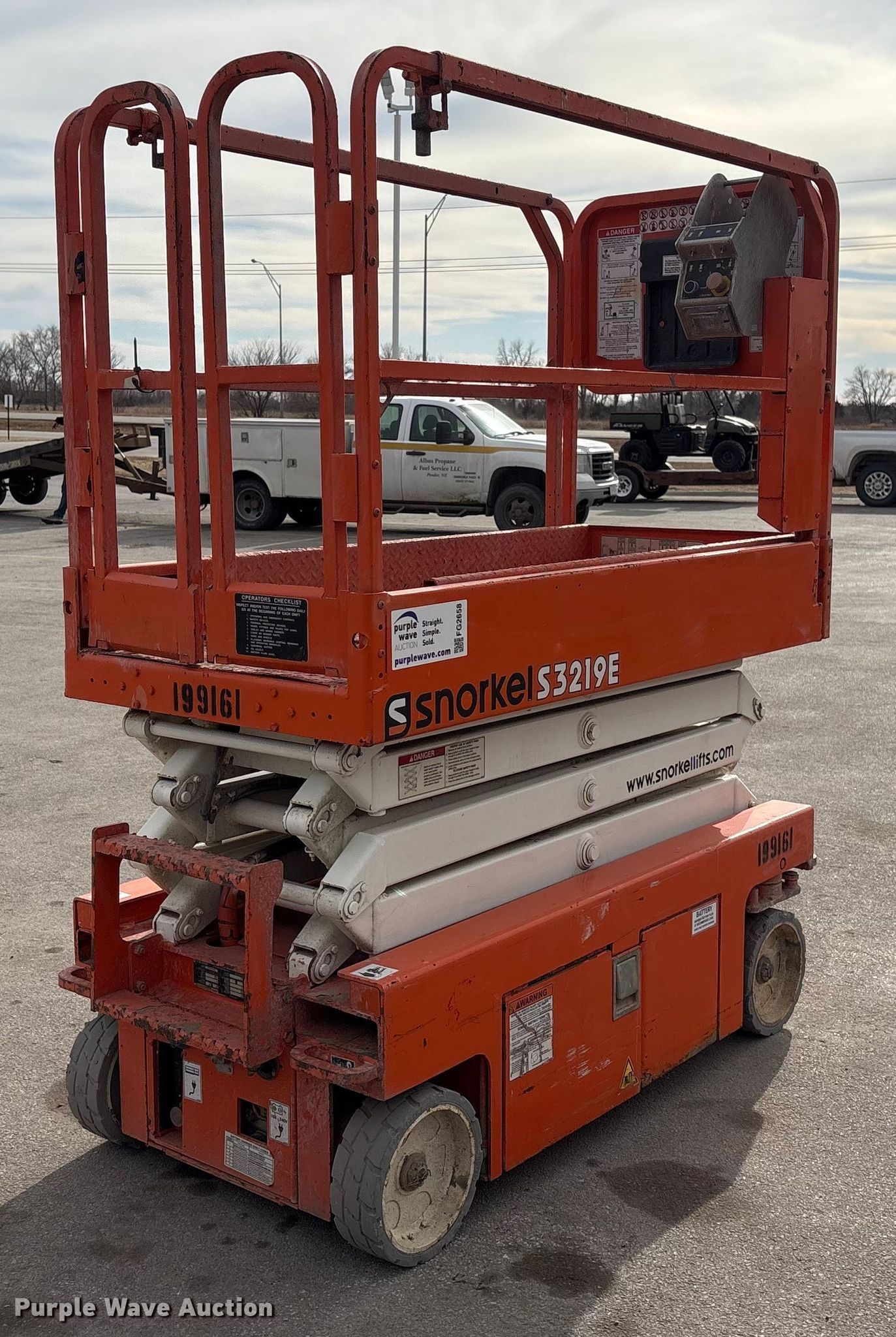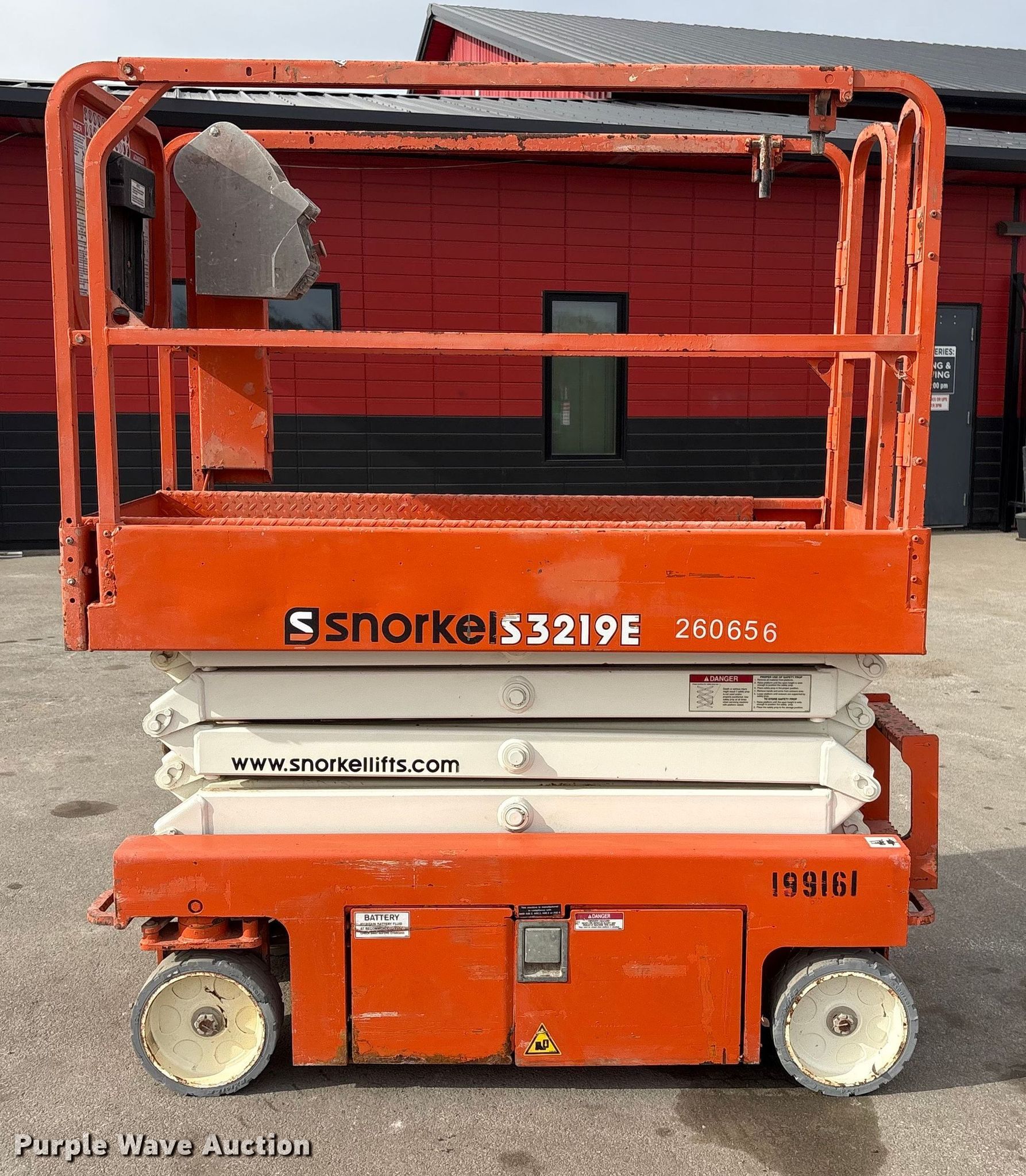 Purple Wave is selling a used Scissor or Vertical Lift in Nebraska. This item is a 2017 Snorkel S3219EANSI scissor lift with the following: Dimensions, 5'10" L x 32.5" W x 6'8" H, Hours: 346 on meter, Serial: S3219E-04-171104787