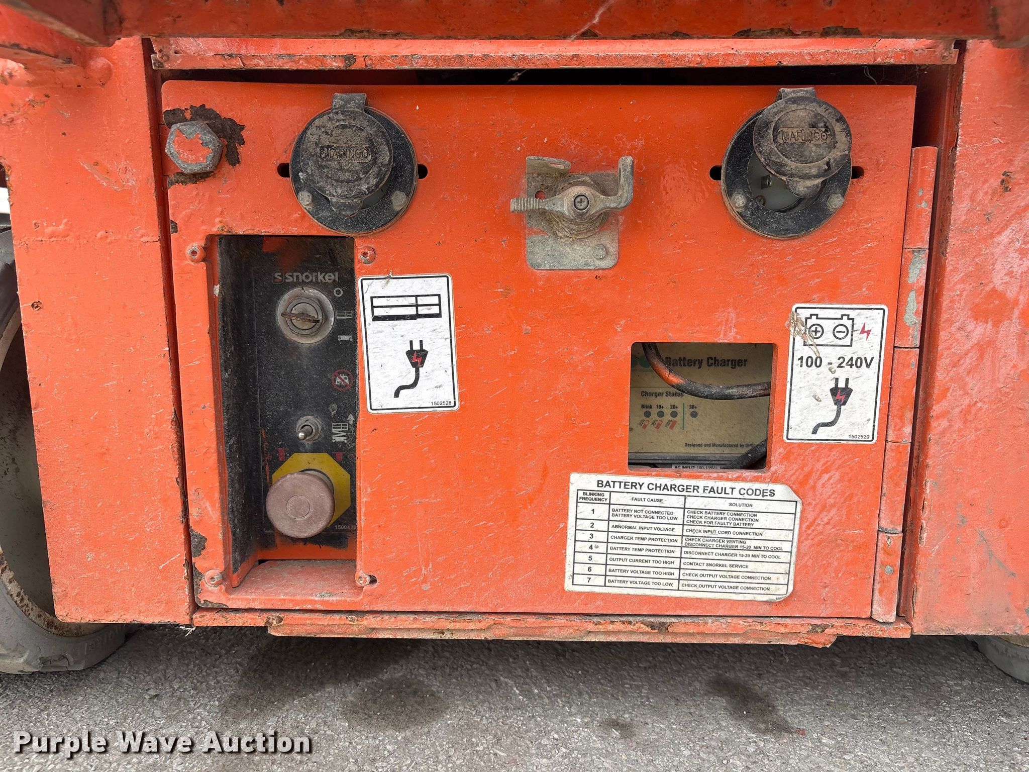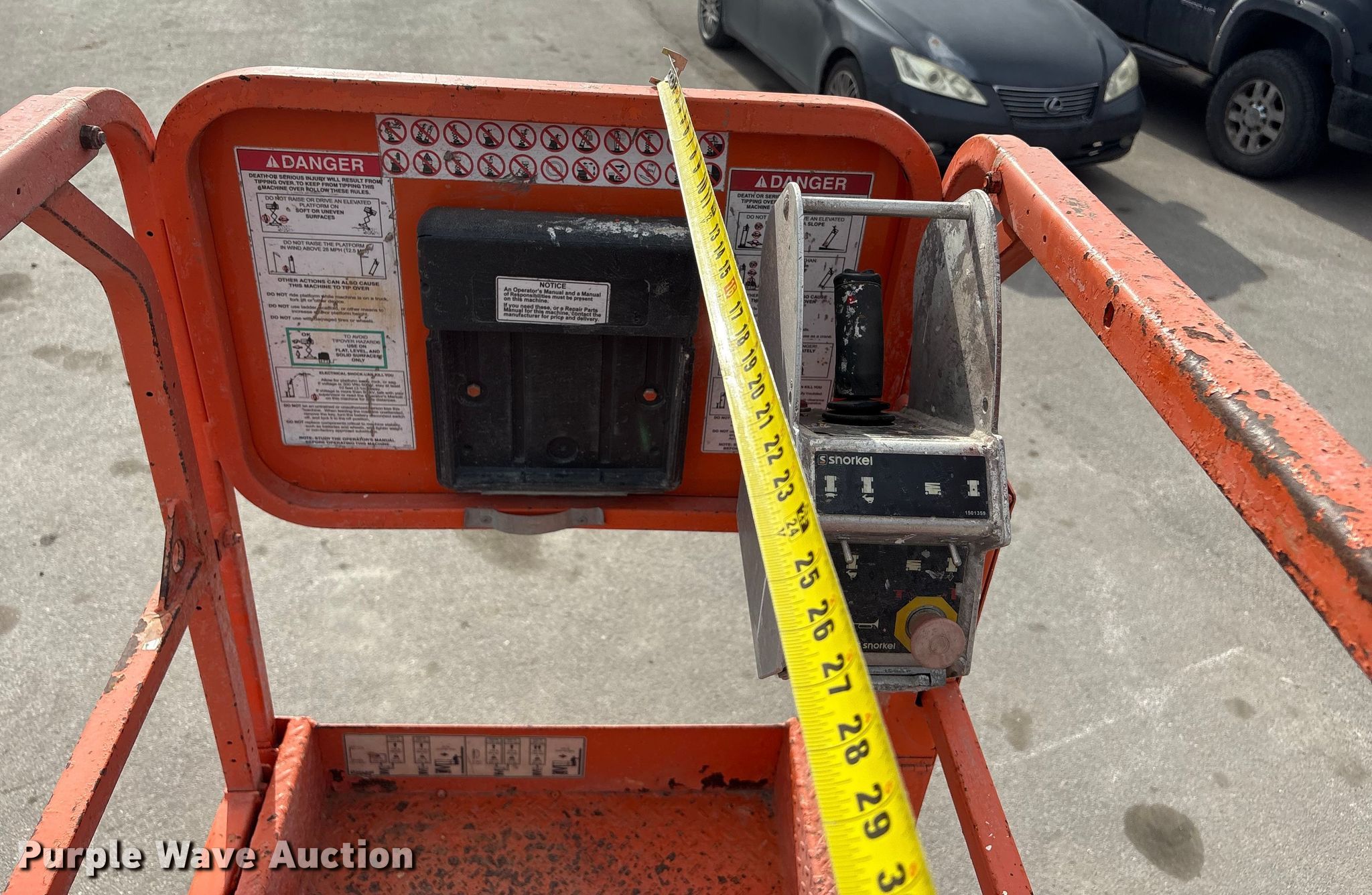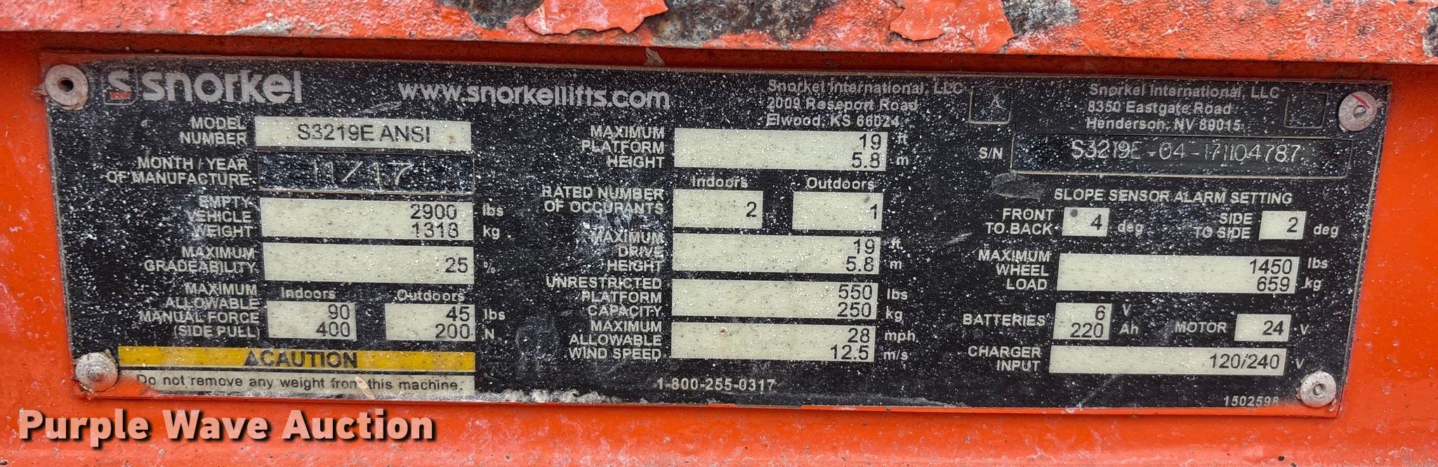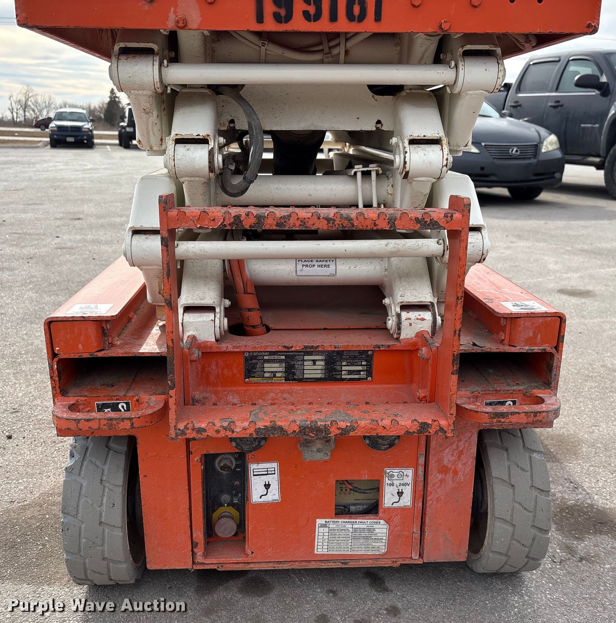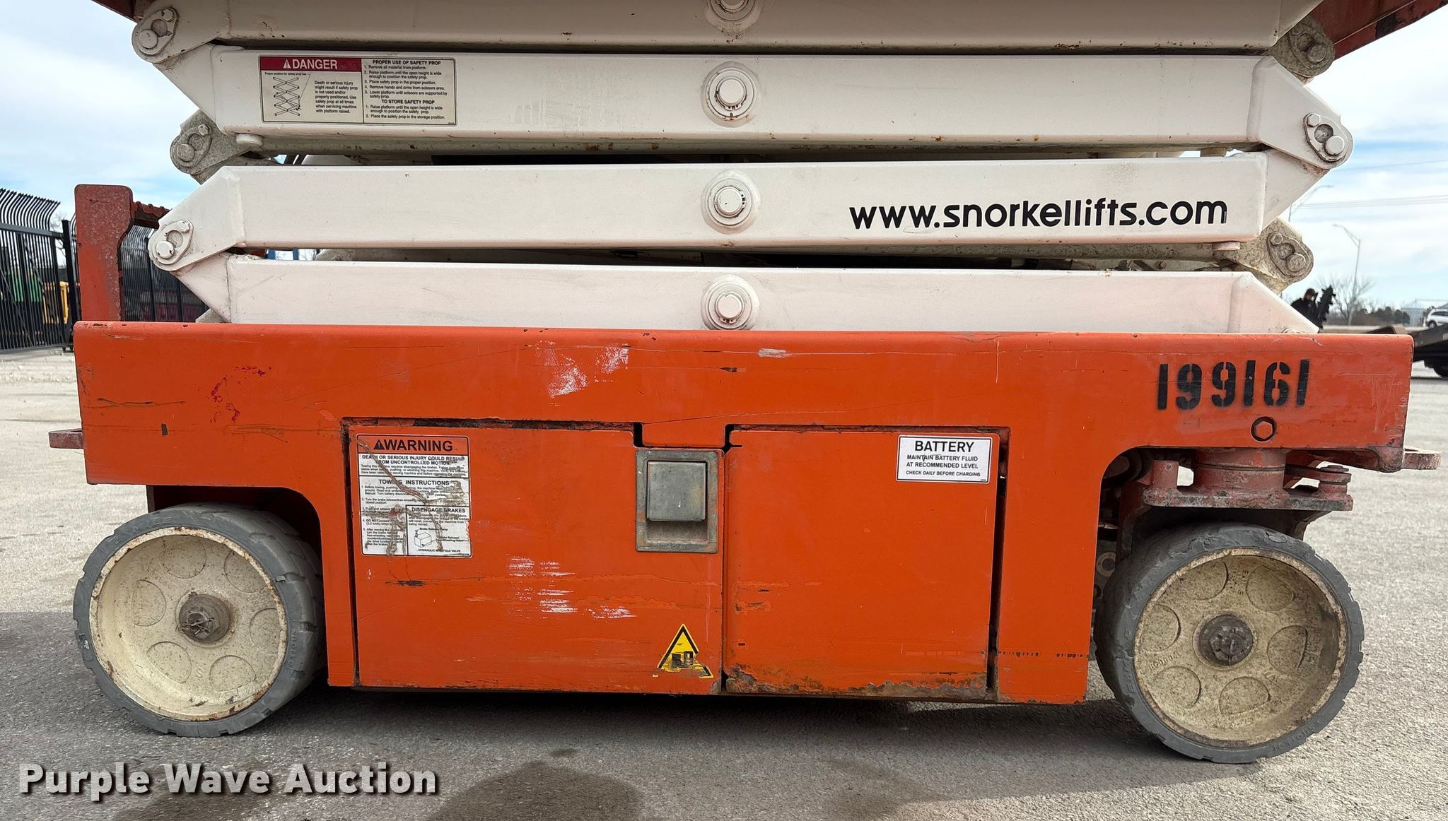Purple Wave is selling a used Scissor or Vertical Lift in Nebraska. This item is a 2017 Snorkel S3219EANSI scissor lift with the following: Dimensions, 5'10" L x 32.5" W x 6'8" H, Hours: 346 on meter, Serial: S3219E-04-171104787