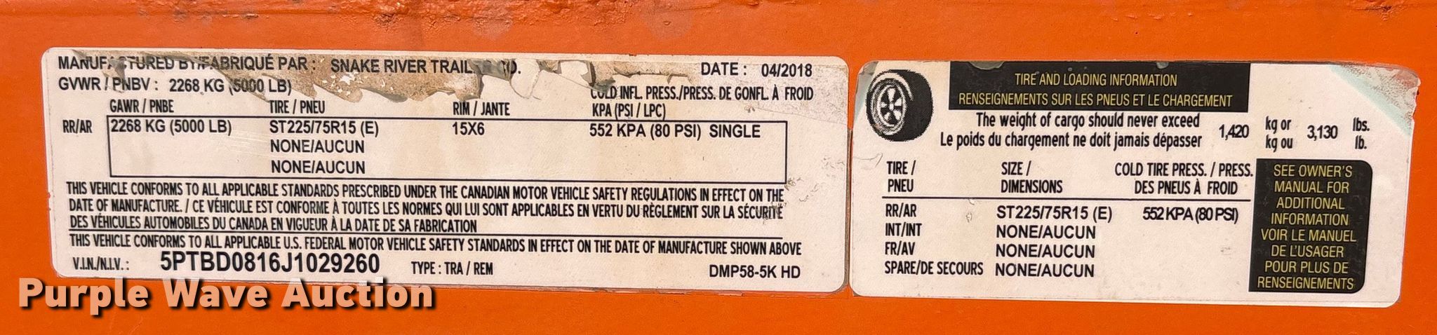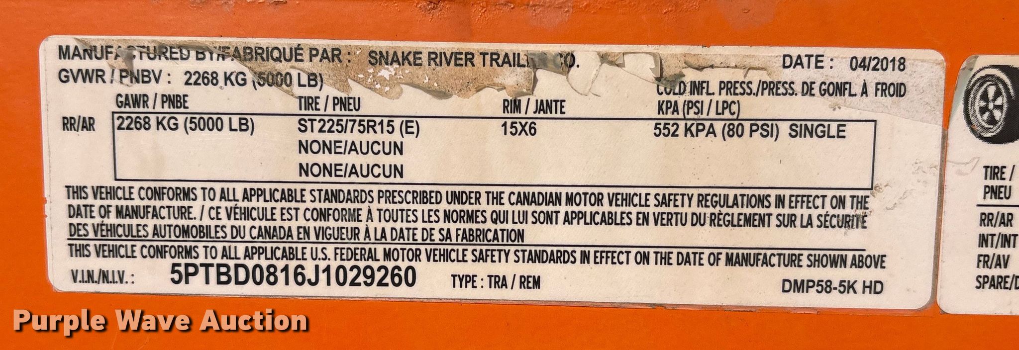 Purple Wave is selling a used Dump Trailer in Nebraska. This item is a 2018 Snake River DMP58-5KHD dump trailer with the following: VIN: 5PTBD0816J1029260