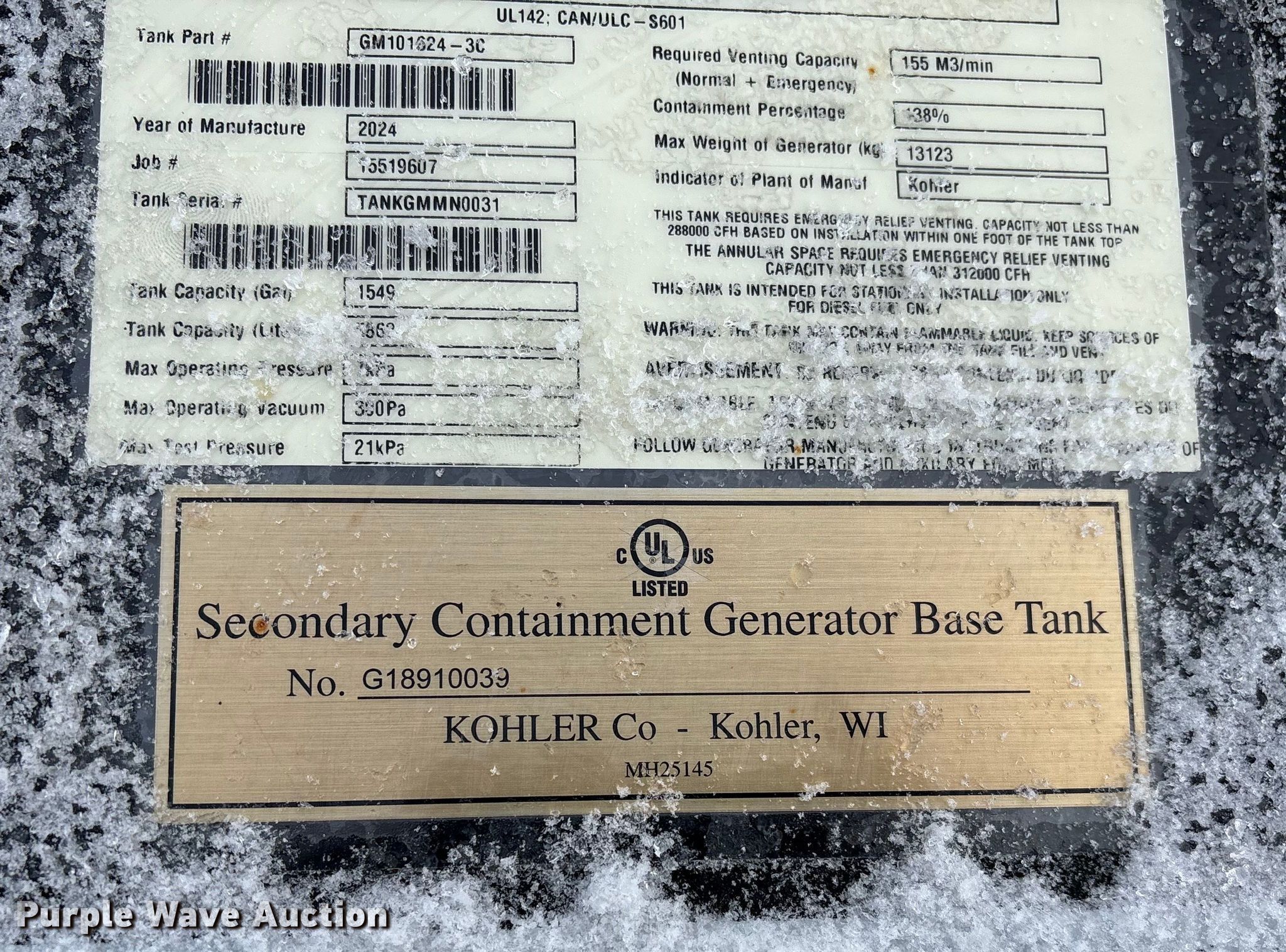 Purple Wave is selling a used Tanks in Wisconsin. This item is a 2024 Kohler GM101624-3C with the following: Tank capacity (GAL) : 1549, (LITERS): 5863, Serial: TANKGMMN0031