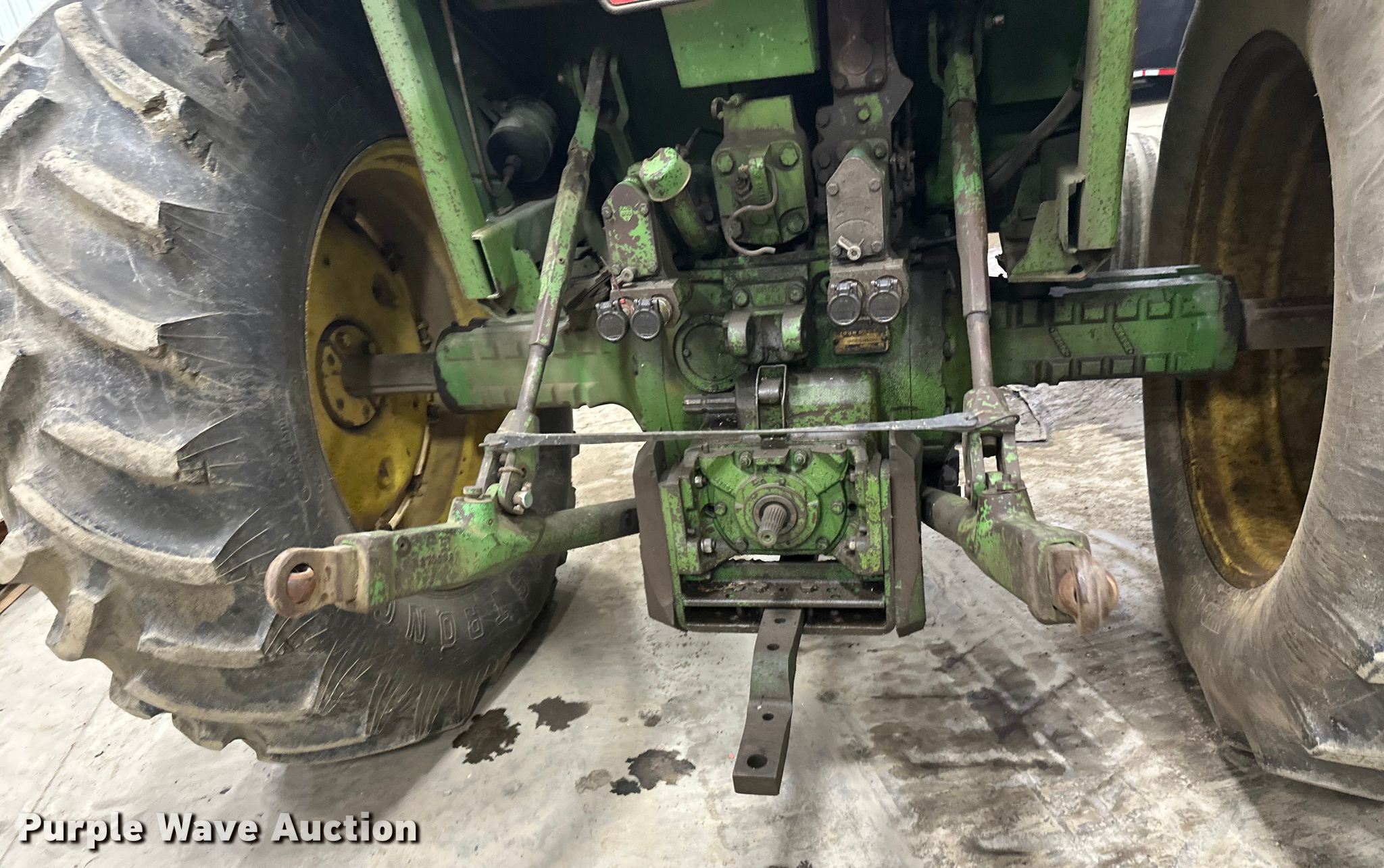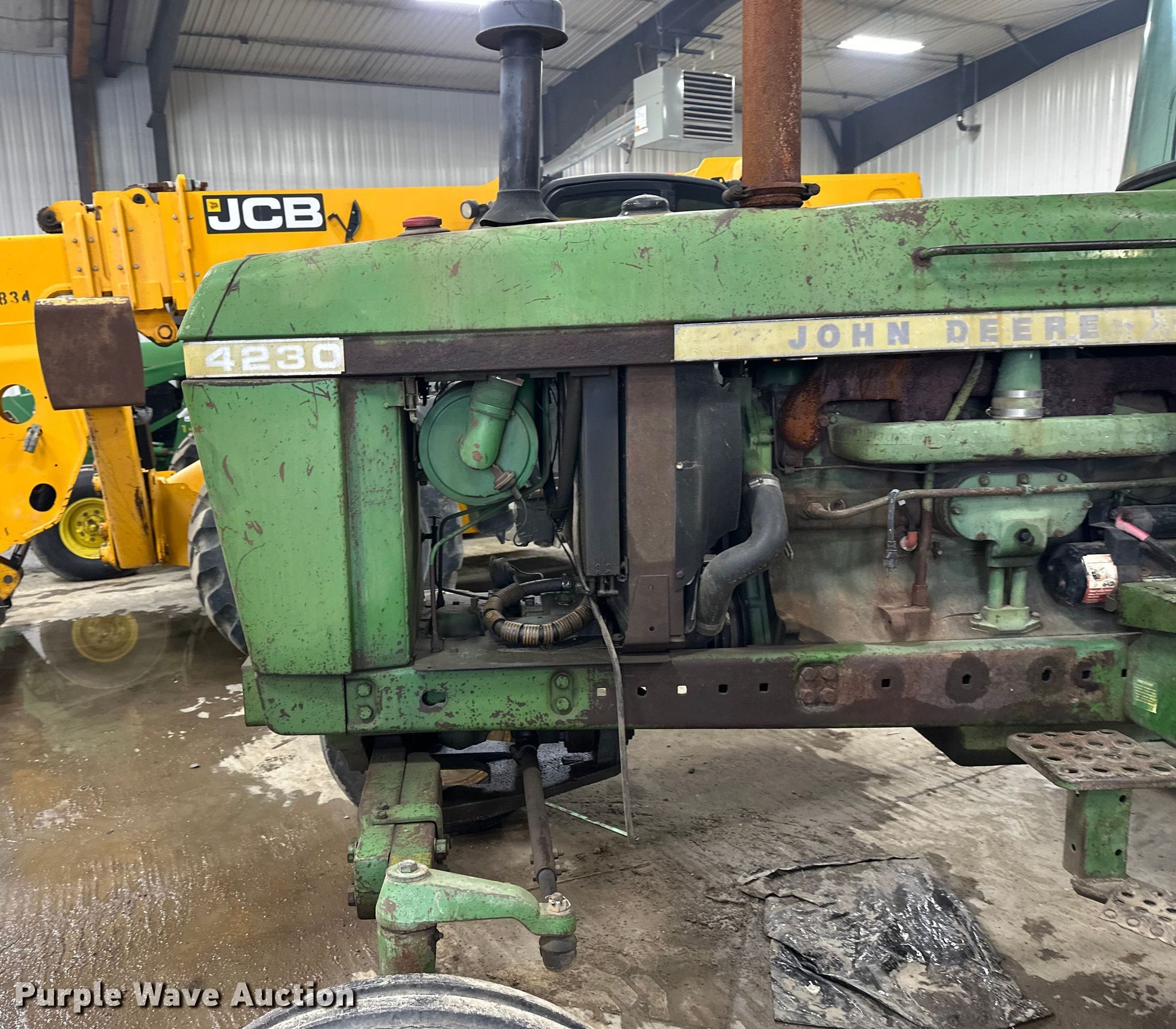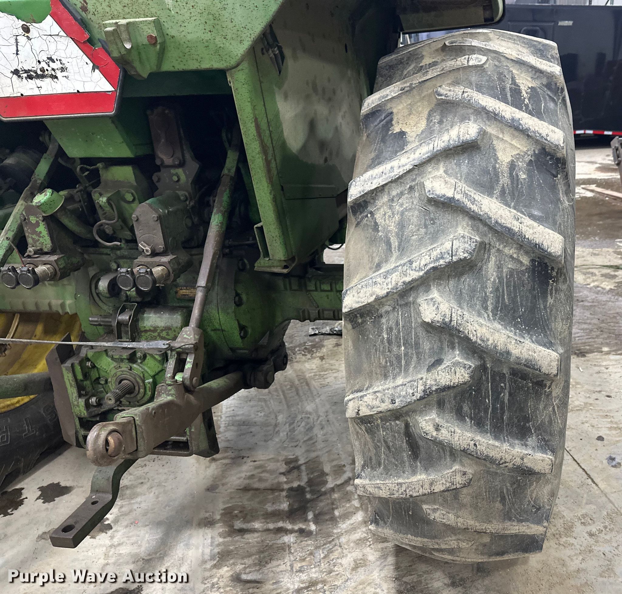 1973 John Deere 4230 tractor. Hours: 1,446 on meter, Serial: 011009. Engine John Deere 6404AR11, Serial: 339637B, Cylinders: 6, Fuel type: Diesel. Transmission Quad-range, 16F - 6R. Operators station Heat. Features PTO: 540, 1000, Three point Top link, Hydraulic remote sets Rear: 2. Tires Front: 11L-15, Rear: 18.4-34, Wheelbase: 105". Christensen Family Farms. Sleepy Eye, MN 56085