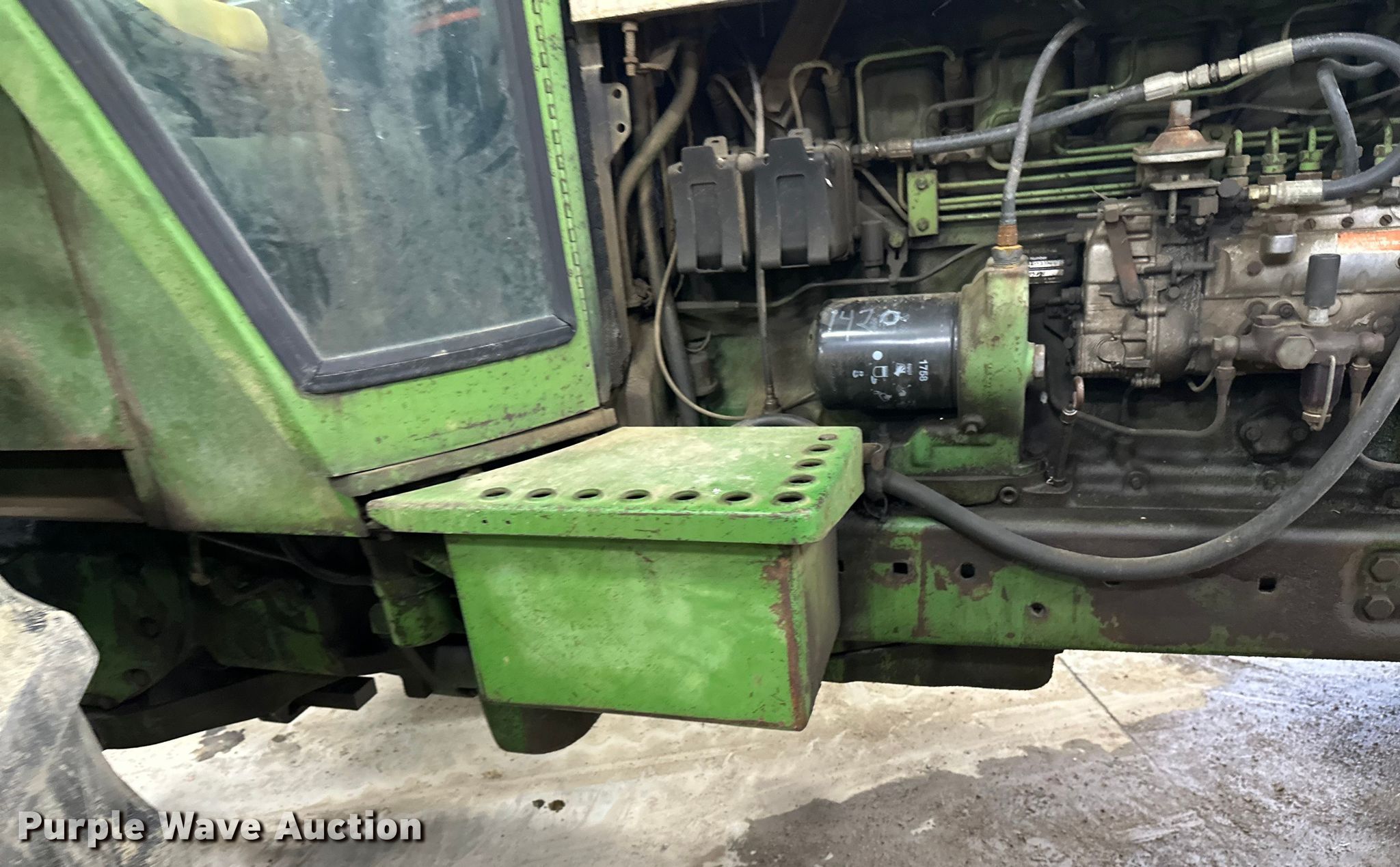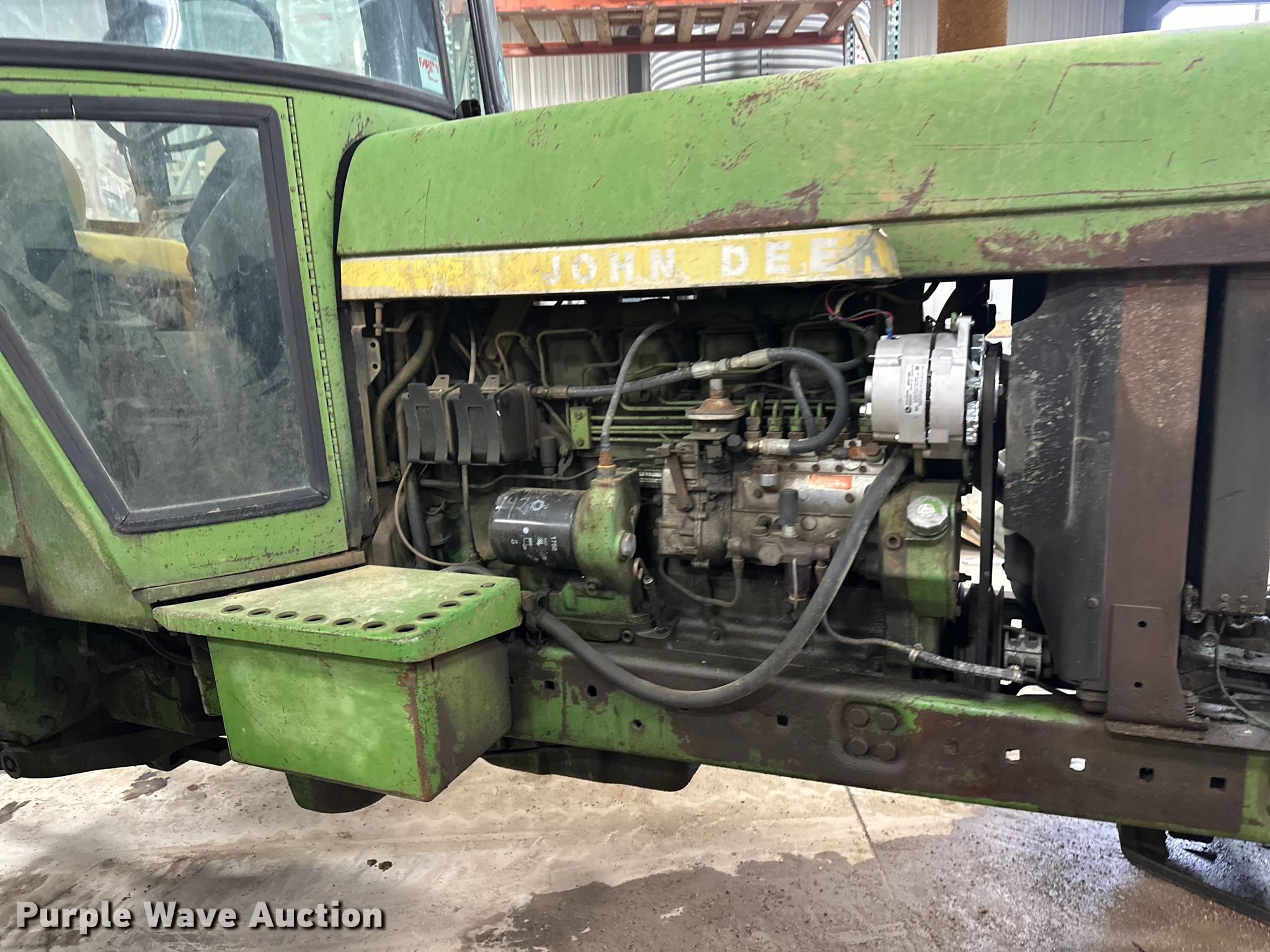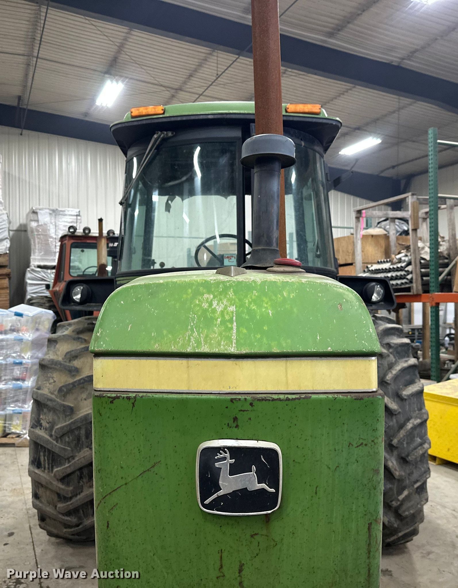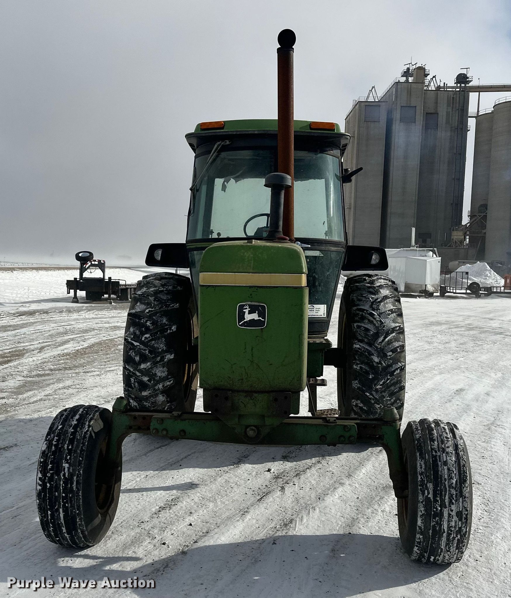 1973 John Deere 4230 tractor. Hours: 1,446 on meter, Serial: 011009. Engine John Deere 6404AR11, Serial: 339637B, Cylinders: 6, Fuel type: Diesel. Transmission Quad-range, 16F - 6R. Operators station Heat. Features PTO: 540, 1000, Three point Top link, Hydraulic remote sets Rear: 2. Tires Front: 11L-15, Rear: 18.4-34, Wheelbase: 105". Christensen Family Farms. Sleepy Eye, MN 56085