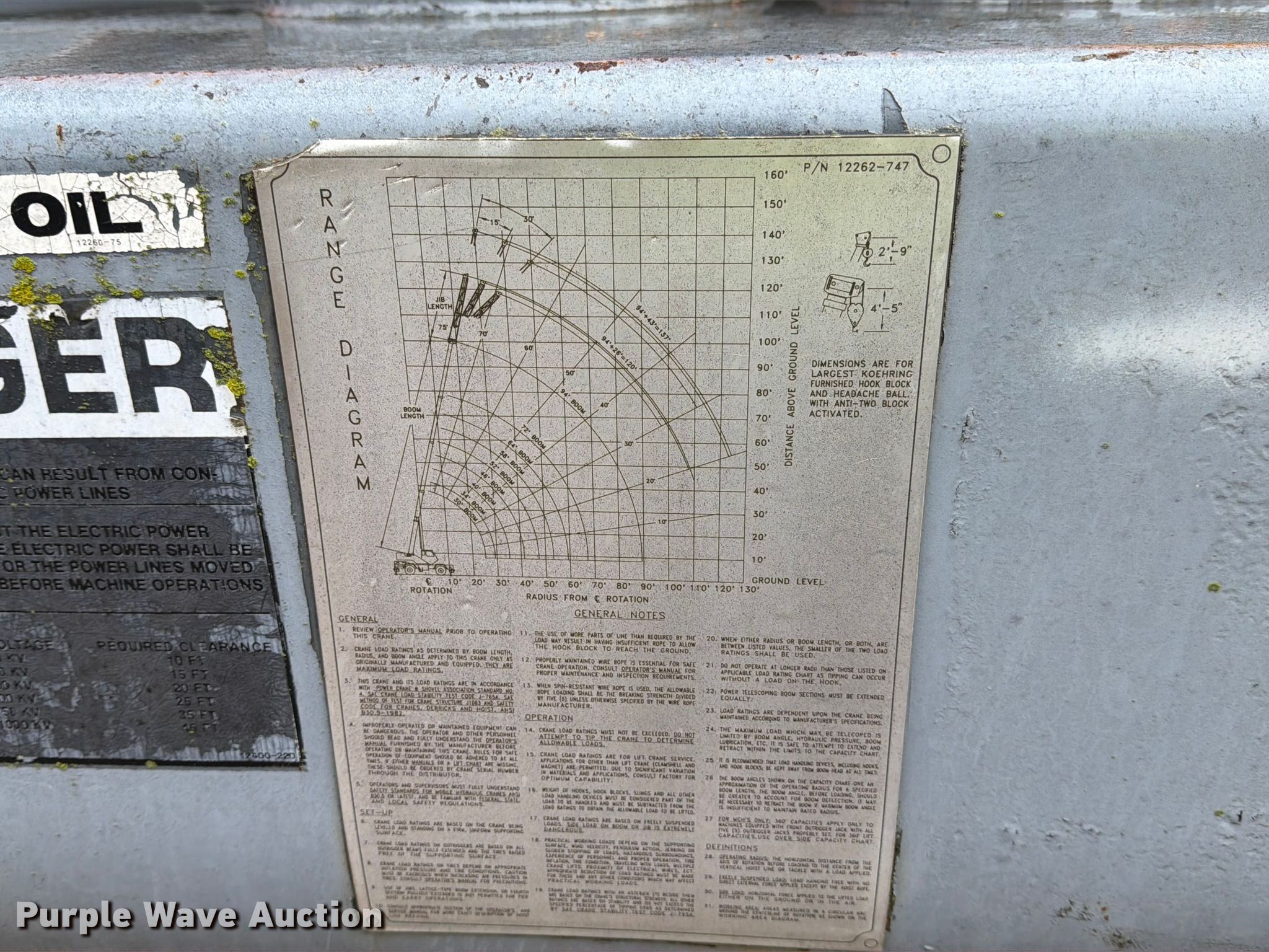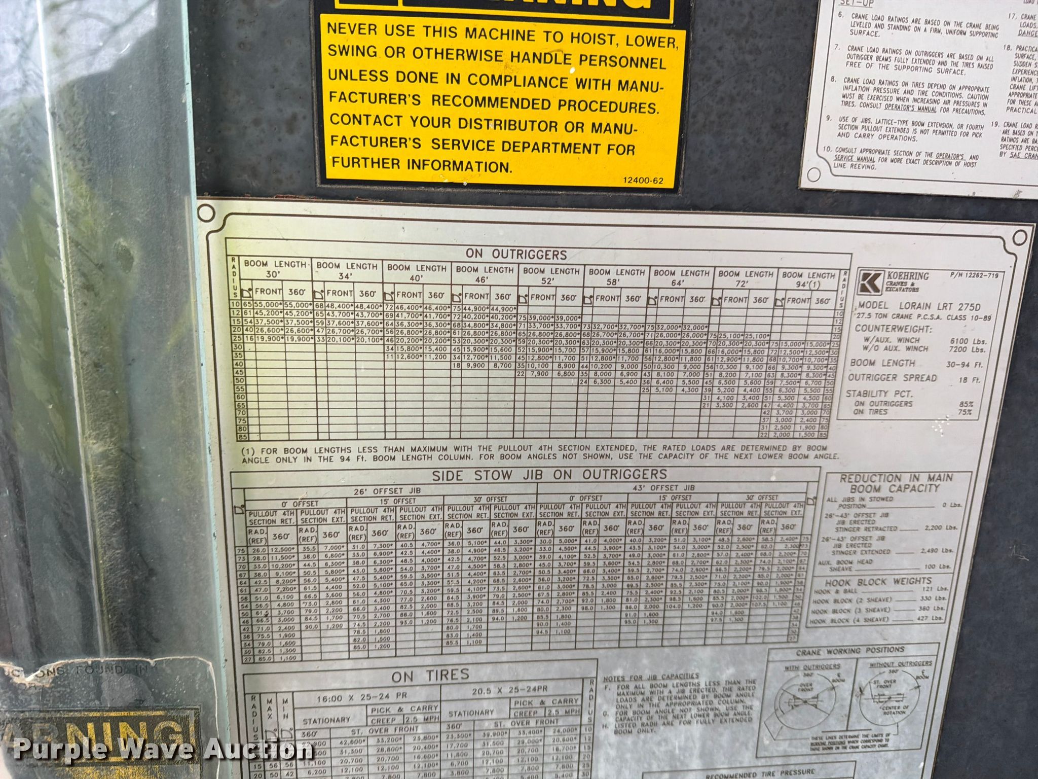 Lorain LRT 275D crane. Hours: 5,167 on meter, Serial: 79927. Engine Cummins, Displacement: 5.9L, Cylinders: 6, Fuel type: Diesel, HP: 130. Transmission 3F - 3R. Chassis Axles: Single, Brakes: Hydraulic. Operators station Enclosed cab, Heat, Crane controls: Stick. Features Boom Telescopic, Maximum boom length: 94' Sections: 4, Maximum lift capacity: 55,000 lbs, Stabilizers: 4, Boom controls In-cab, Removable counter weight, Crane block Sheaves: 4, Lift chart. Tires Size: 20.5-25. Notes Door issues, does not fully close, Non-operational unit. This is worksite support equipment and will not come with a title. Transfer of ownership documentation will be a bill of sale. CTC Transportation. Euless, TX 76040