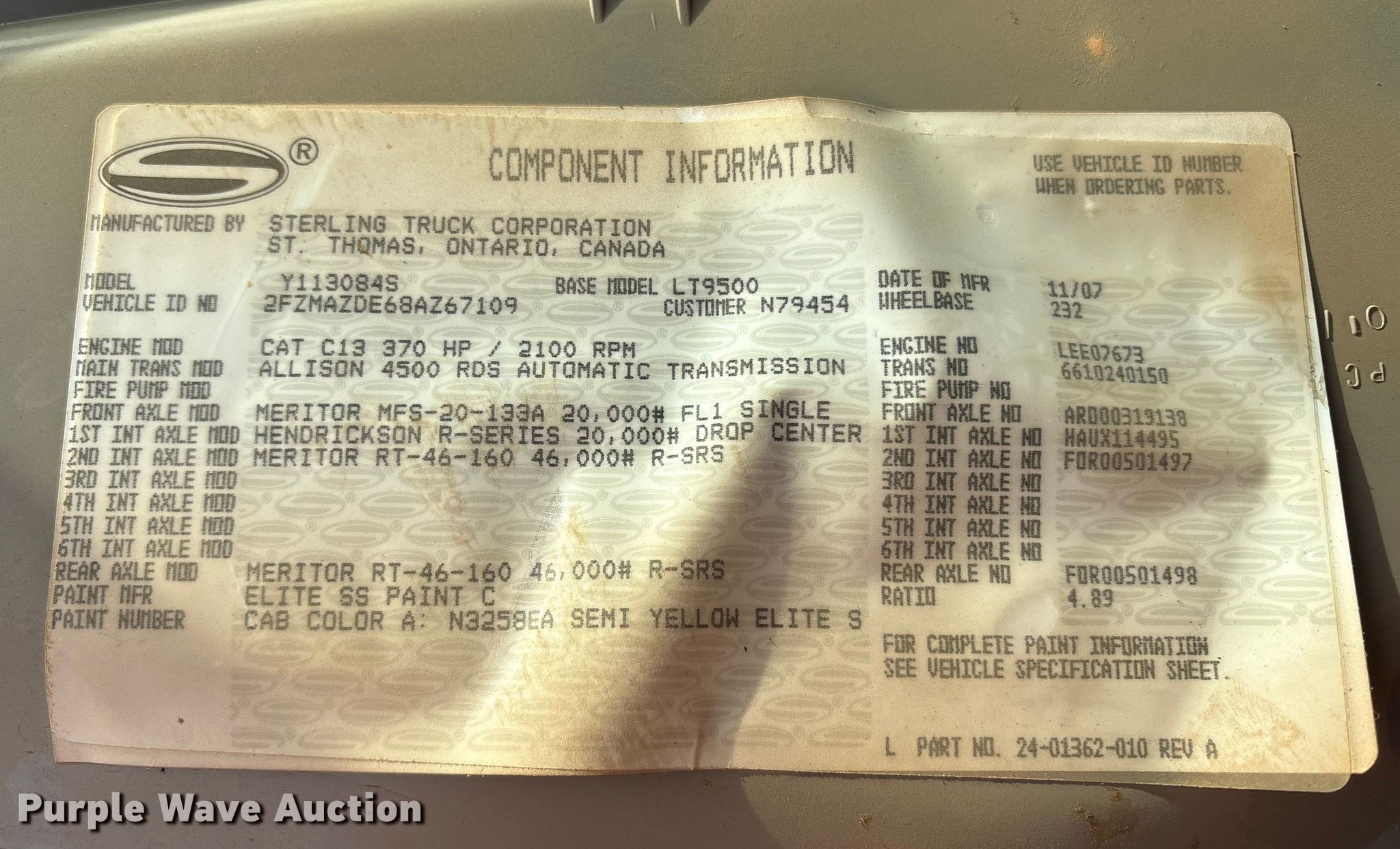 2008 Sterling L9500 dump truck. Miles: 178,549 on odometer, Hours: 7,084 on meter, VIN: 2FZMAZDE68AZ67109, Unit #: 90604315. Engine Caterpillar C13 Acert, Displacement: 12.5L, Cylinders: 6, Fuel type: Diesel, HP: 370. Transmission Allison 4500RDS, Automatic. Chassis Double frame, Axles: Triple, Pusher axle, Differential lock: Inter-axle, Suspension: Spring over walking beam, Brakes: Air, Front mount PTO, GVWR: 82,000 lbs. Interior AC, Heat, Heated mirrors, Power windows, Cruise control. Features Bed Dump bed, Length: 17' 4", Width: 96", Side height: 52", Bed type: Steel, Roll tarp, End gate: Air operated. Tires Front: 315/80R22.5, Rear: 11R22.5, Lift axle: 11R22.5. Notes Dash warning indicator: Check engine, ABS, Brake, Fault code: ECU 128, Windshield chipped or cracked, Rust damage, Air leak, Possible transmission issues, leaks , Possible engine leak. Repossessed item, stored at a secured facility. Please review REQUIRED REMOVAL INSTRUCTIONS. Titles will be distributed after confirmation of payment and removal. North Carolina title. Title distribution may be delayed up to 30 days from verification of funds. Lender Owned. 1081 Recovery Road. China Grove, NC 28023