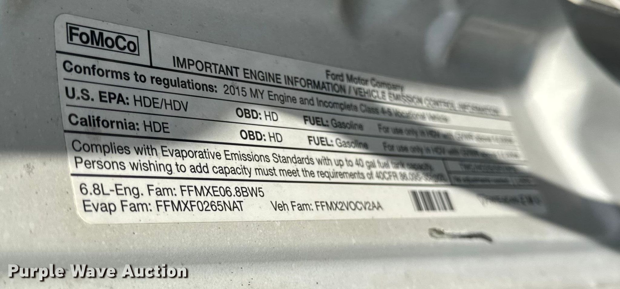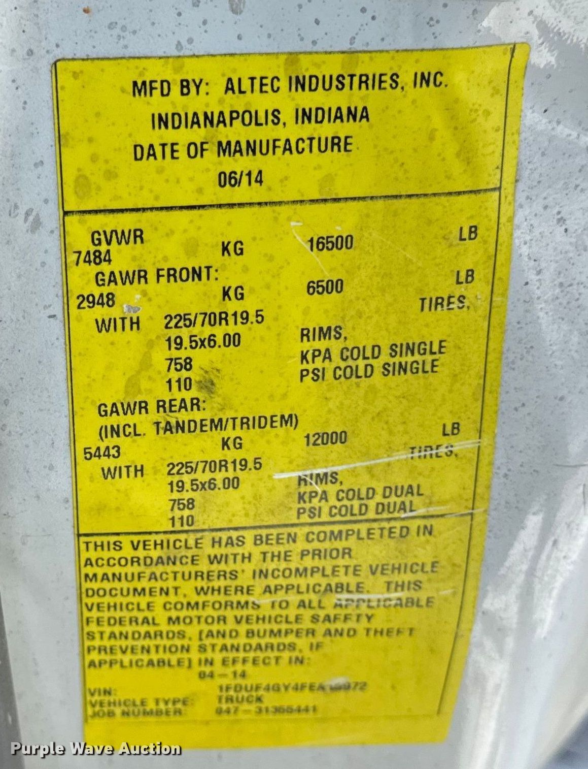 2015 Ford F450 Super Duty bucket truck. Miles: 64,048 on odometer, VIN: 1FDUF4GY4FEA16972, Unit #: 53128535. Engine Ford, Displacement: 6.8L, Cylinders: 10, Fuel type: Gas. Transmission Automatic. Chassis Axles: Single, Suspension: Spring, Brakes: Hydraulic, GVWR: 15,000 lbs. Interior AC, Heat, Cruise control, Auxiliary controls, Brake controller. Features Bed Utility bed, Altec, Serial: 47-31355441, Length: 11', Width: 94", Boom Altec, Boom type: Telescopic, Man basket, Boom controls Lower, Basket.. Tires Size: 225/70R19.5. Notes Boom control compartment issues, will not open, Dash warning indicator: Check engine, ABS, Brake, Traction control, Airbag, Collision damage, Airbags deployed, Parts may be missing, Unknown operating condition of boom, Non-operational unit Unit must be towed or hauled. Fleet inventory reduction, stored at a secured facility. Please review REQUIRED REMOVAL INSTRUCTIONS. Titles will be distributed after confirmation of payment and removal. Illinois title. Title distribution may be delayed up to 30 days from verification of funds. Fleet Inventory Reduction. Chicago Heights, IL 60411