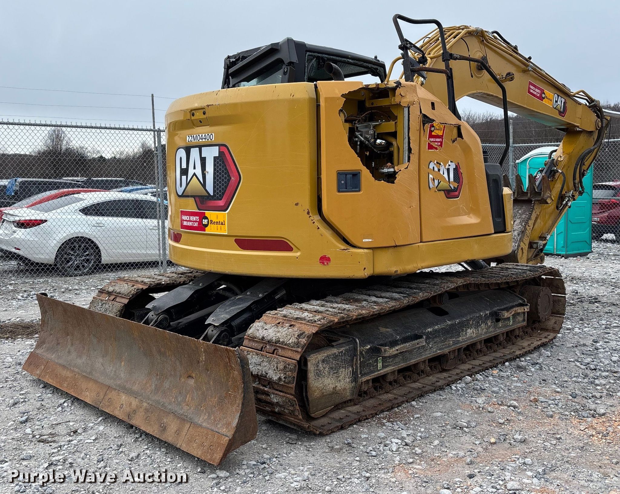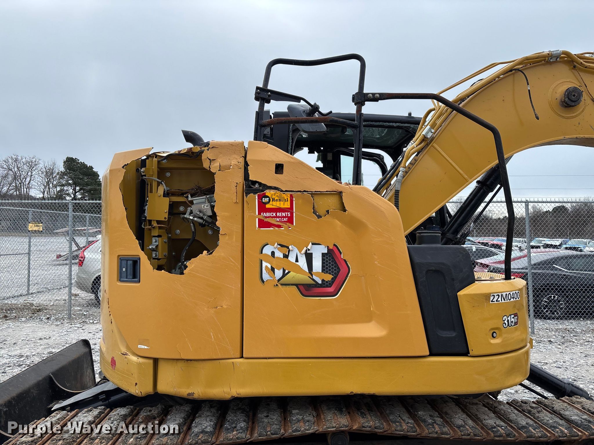 2022 Caterpillar 315 GC excavator. Hours: 2,018 on meter, Serial: CAT00315TFTY20417, Unit #: 99211755. Engine Caterpillar C3.6, Displacement: 3.6L, Cylinders: 4, Fuel type: Diesel. Transmission Hydrostatic, Two speed travel. Operators station Enclosed cab, AC, Heat, Backup camera. Features Auxiliary hydraulics Standard, Counter weights, Backfill blade Width: 98", Boom Standard, Stick Stick length: 9' 10", Quick coupler: Hydraulic, Thumb: Hydraulic Caterpillar.. Tracks Width: 19.75", Steel, Grouser pads: Triple, Track pads: Rubber. Notes Rollover damage, Glass broken, missing, Stick cylinder issues Hydraulic leak, Disconnected, Possible boom lift cylinder issues, disconnected. Buyer responsible for all aspects of loadout and removal. Insurance salvage, stored at a secured facility. Please review REQUIRED REMOVAL INSTRUCTIONS. Insurance Salvage. 15976 Bill Campbell Road. Prairie Grove, AR 72753