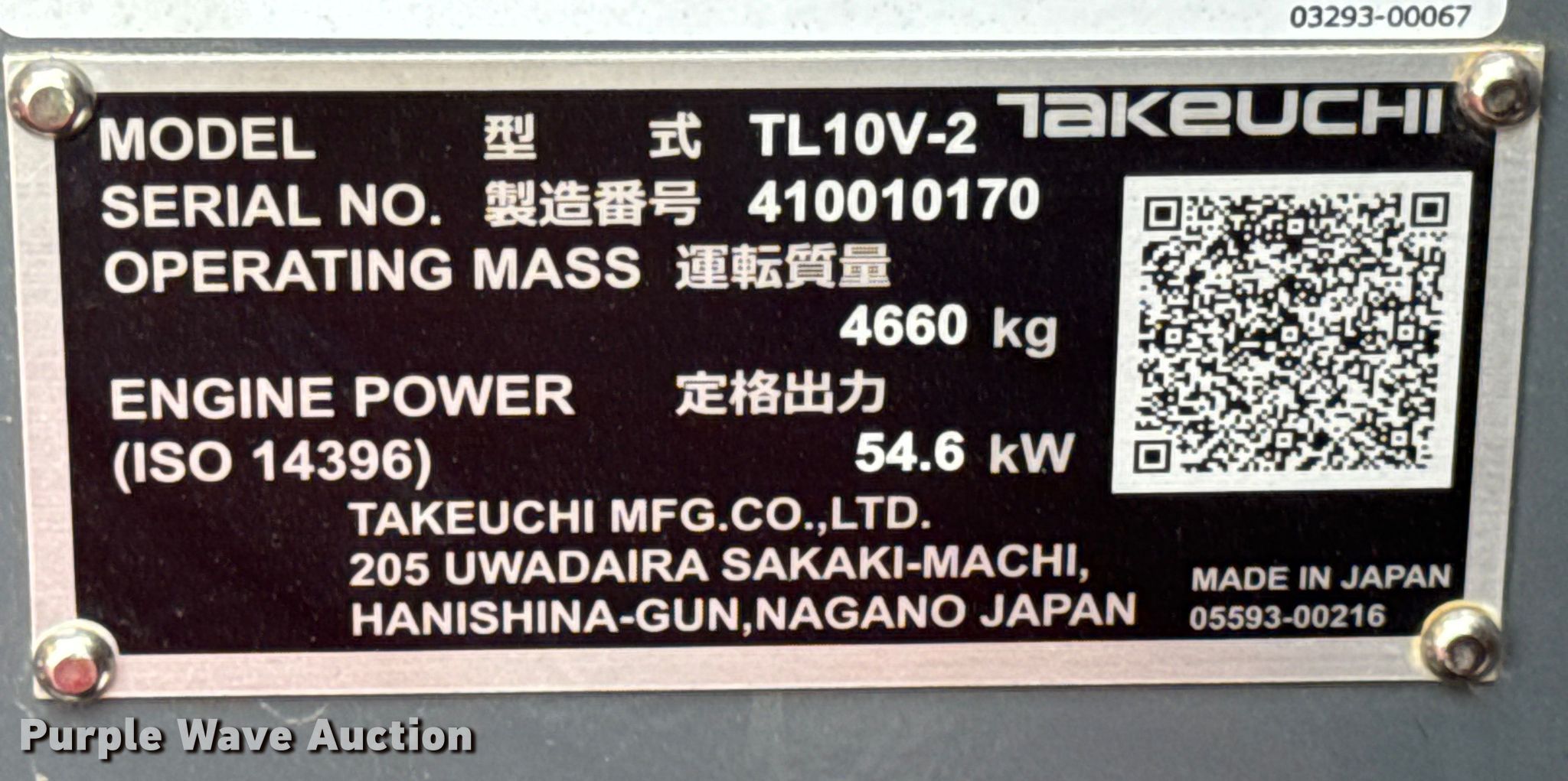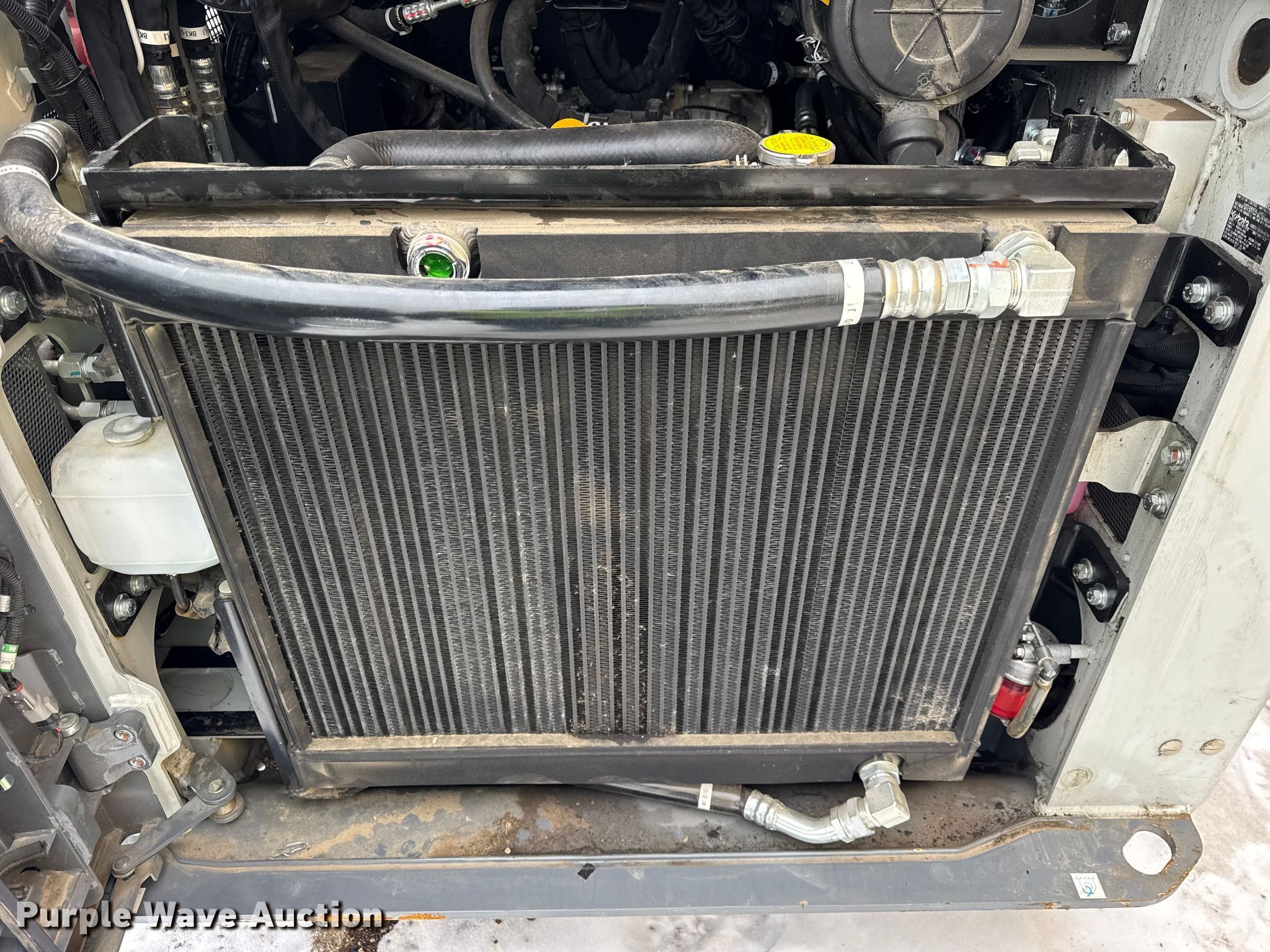 Takeuchi TL10V-2 tracked skid steer loader. Hours: 9 on meter, Serial: 410010170, Unit #: 74636525. Engine Kubota V3307-CR-T-EF02, Displacement: 3.3L, Cylinders: 4, Fuel type: Diesel. Transmission Hydrostatic, Two speed travel. Operators station Enclosed cab, AC, Heat, Backup camera, Bucket control: Hand, Pattern changer, Electronic Monitoring System panel. Features Auxiliary hydraulics, Auxiliary electrical outlet, Quick coupler: Hydraulic. Tracks Width: 16". Notes Battery missing, Possible loader arm issues, bent, Non-operational unit. Buyer responsible for all aspects of loadout and removal. Insurance salvage, stored at a secured facility. Please review REQUIRED REMOVAL INSTRUCTIONS. Insurance Salvage. 31W120 West Bartlett Road. Bartlett, IL 60103