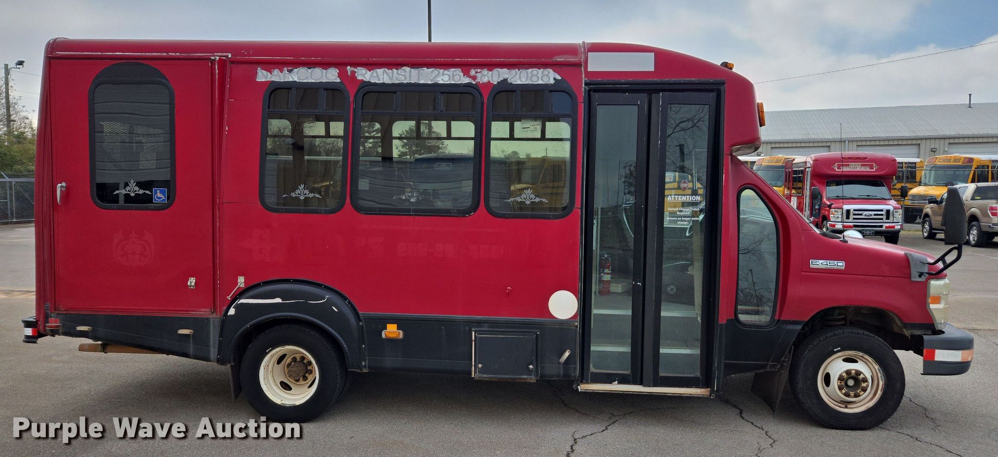 2010 Ford E450 shuttle bus. Miles: 161,727 on odometer, VIN: 1FDFE4FS2ADA79074. Engine Displacement: 6.8L, Cylinders: 10, Fuel type: Gas, HP: 305. Transmission Automatic. Chassis Axles: Single, Suspension: Spring, Brakes: Hydraulic, GVWR: 14,500 lbs. Interior AC, Heat, Cruise control, Passengers: 10, Wheelchair lift. Tires Size: 225/75R16. Notes Dash warning indicator: Check engine, Shifter linkage issues, Non-operational door. Alabama title. Title distribution may be delayed up to 30 days from verification of funds. North Central Alabama Regional Council of Governments. Decatur, AL 35601