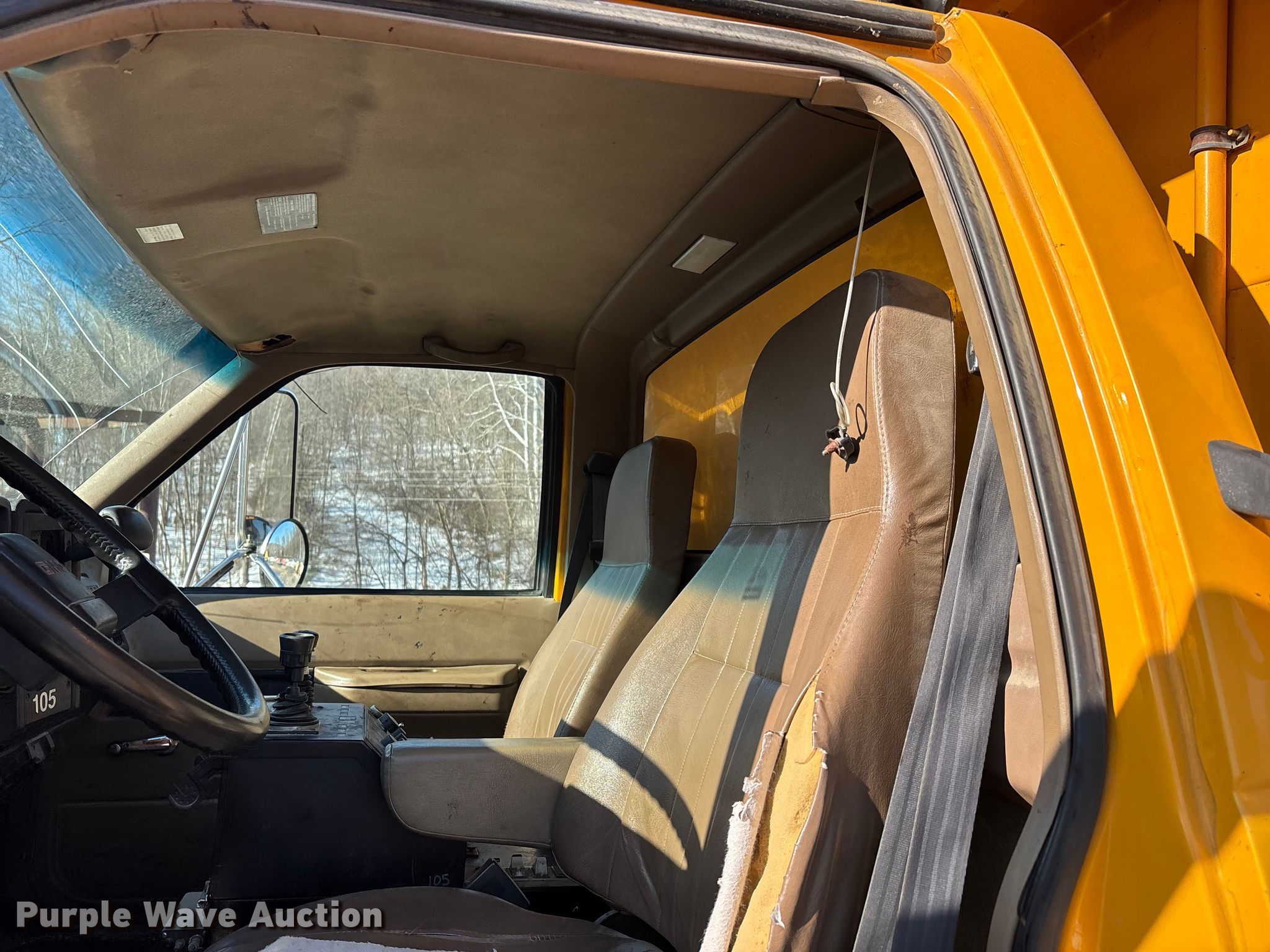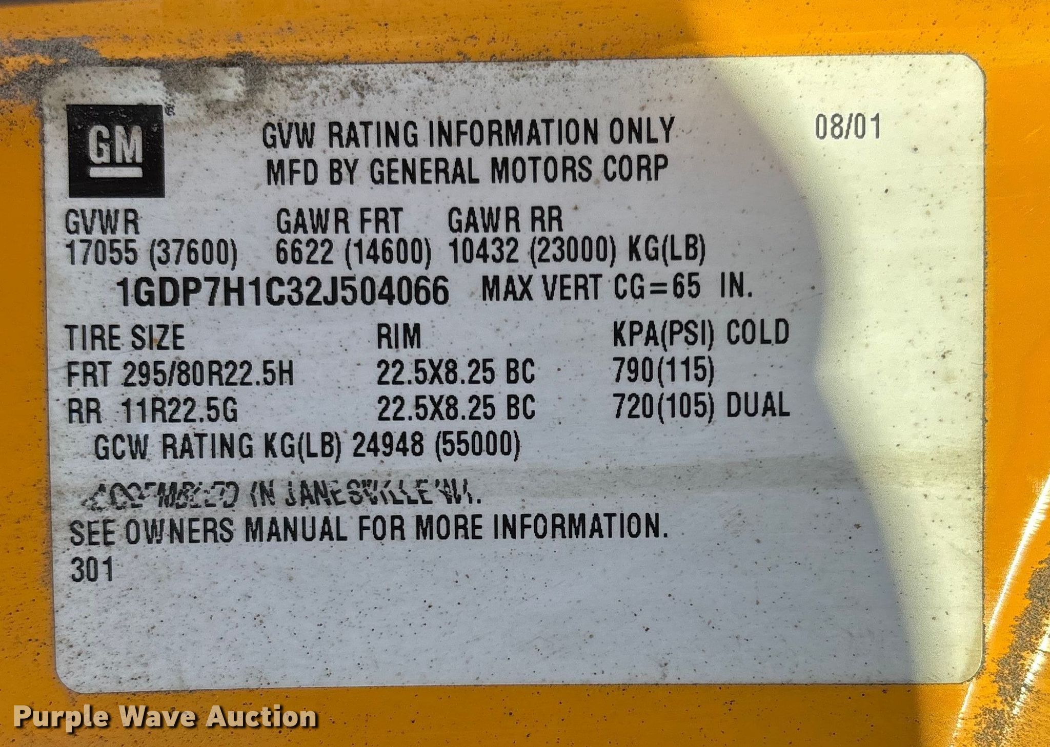 2002 GMC C8500 dump truck. Miles: 58,012 on odometer, Miles or hours may vary, unit still in use, VIN: 1GDP7H1C32J504066, Unit #: 7. Engine Caterpillar 3126, Displacement: 7.2L, Cylinders: 6, Fuel type: Diesel. Transmission Automatic. Chassis Double frame, Axles: Single, Suspension: Spring, Brakes: Air, Front mount PTO, GVWR: 37,600 lbs. Interior AC, Heat, Brake controller. Features Bed Dump bed, Heil, Length: 9', Width: 8', Side height: 22", Side board height: 16", Bed type: Steel, Bed vibrator, Ram: Single, End gate: Air operated, Plow Width: 120". Tires Size: 11R22.5. Notes Windshield chipped or cracked, Cylinder leak. Indiana title. Transfer of ownership documentation will be assigned and distributed by the seller. Martin County Highway Department. Shoals, IN 47581