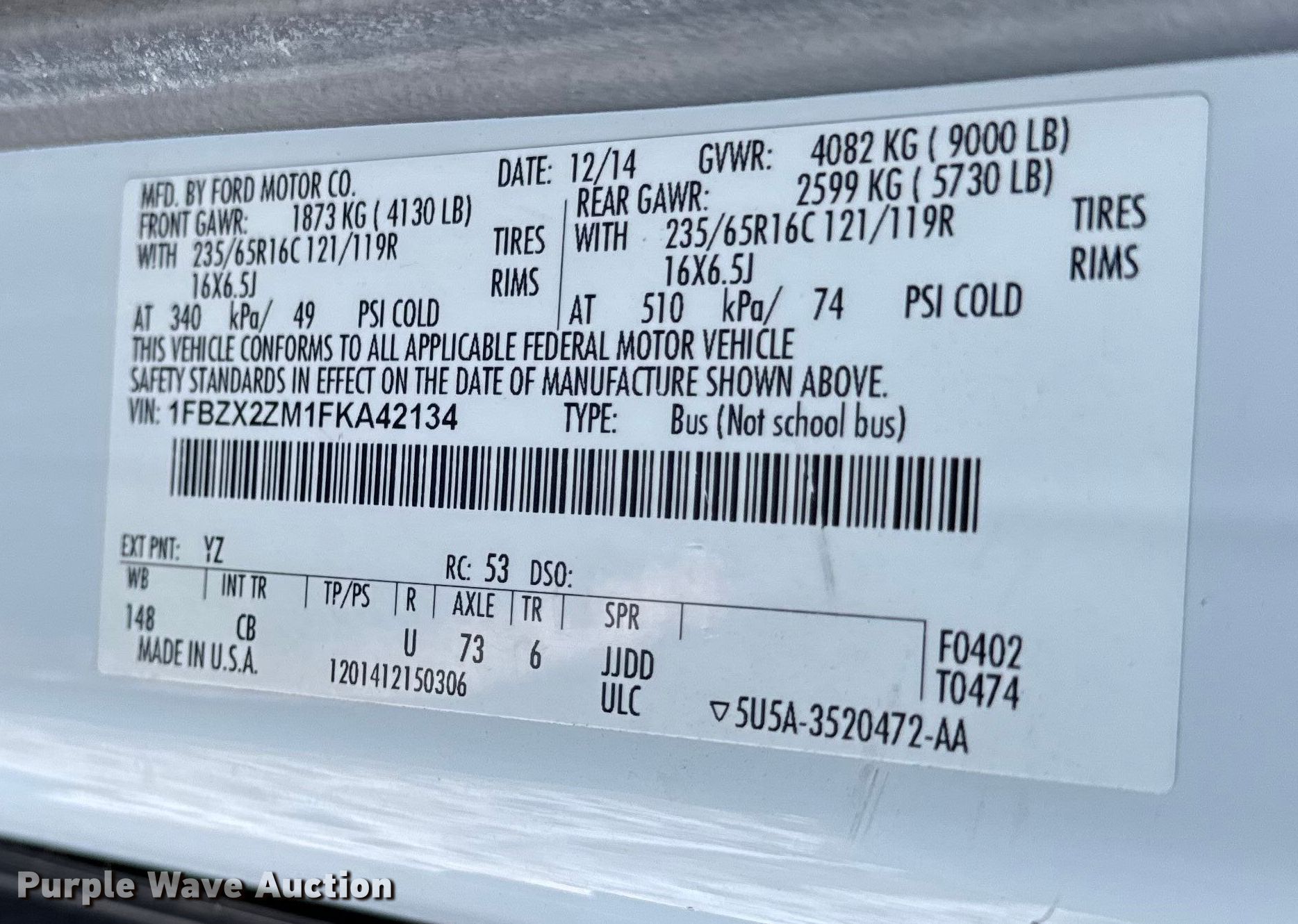 2015 Ford Transit prisoner transport van. Miles: Unknown, VIN: 1FBZX2ZM1FKA42134. Engine Displacement: 3.7L, Cylinders: 6, Fuel type: Gas. Transmission Automatic. Interior AC, Heat, Power windows, Power locks, Cruise control. Tires Size: 235/65R16. Notes Non-operational gauge cluster. Kansas title. Mileage has not been verified. Odometer discrepancy will be marked on the title. Title distribution may be delayed up to 14 days from verification of funds. Hutchinson Correctional Facility. Hutchinson, KS 67501