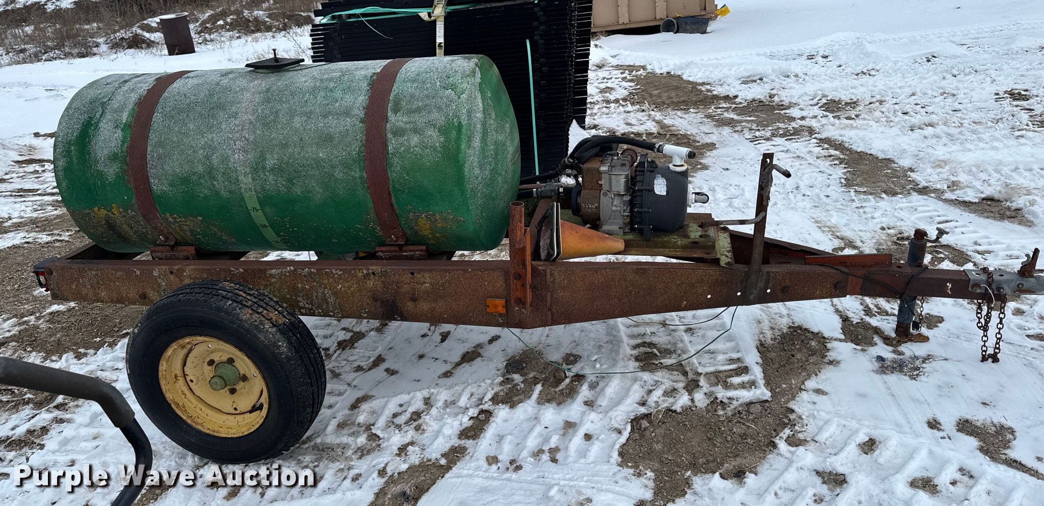 Tank trailer. Dimensions. Overall Length: 150", Width: 70". Features Fiberglass tank, Capacity: 110 gallons, Briggs & Stratton engine, Cylinders: 1, Fuel type: Gas. Chassis Landing gear: Single. Tires Steel wheels, Size: 225/75R15. Notes Unknown operating condition of transfer pump... Missouri municipality owned asset. No title will be provided. Transfer of ownership documentation will be by notarized bill. of sale and a manufacturer's statement of origin in accordance. with MSR 301.260. Bidders are responsible for verifying if this. is sufficient to obtain title in their jurisdiction prior to bidding. City of Hannibal, MO. Hannibal, MO 63401